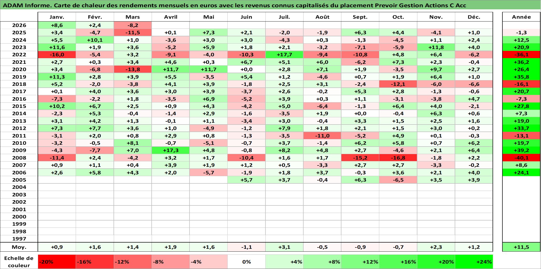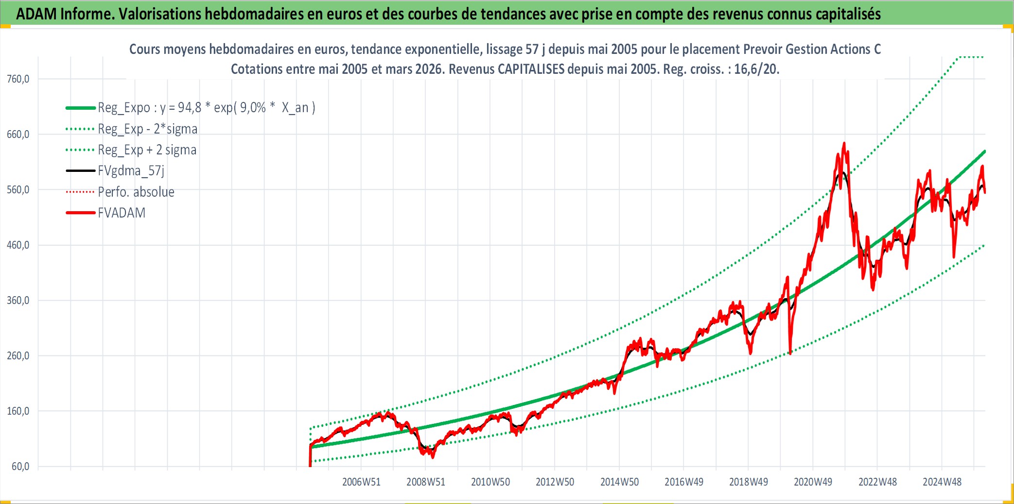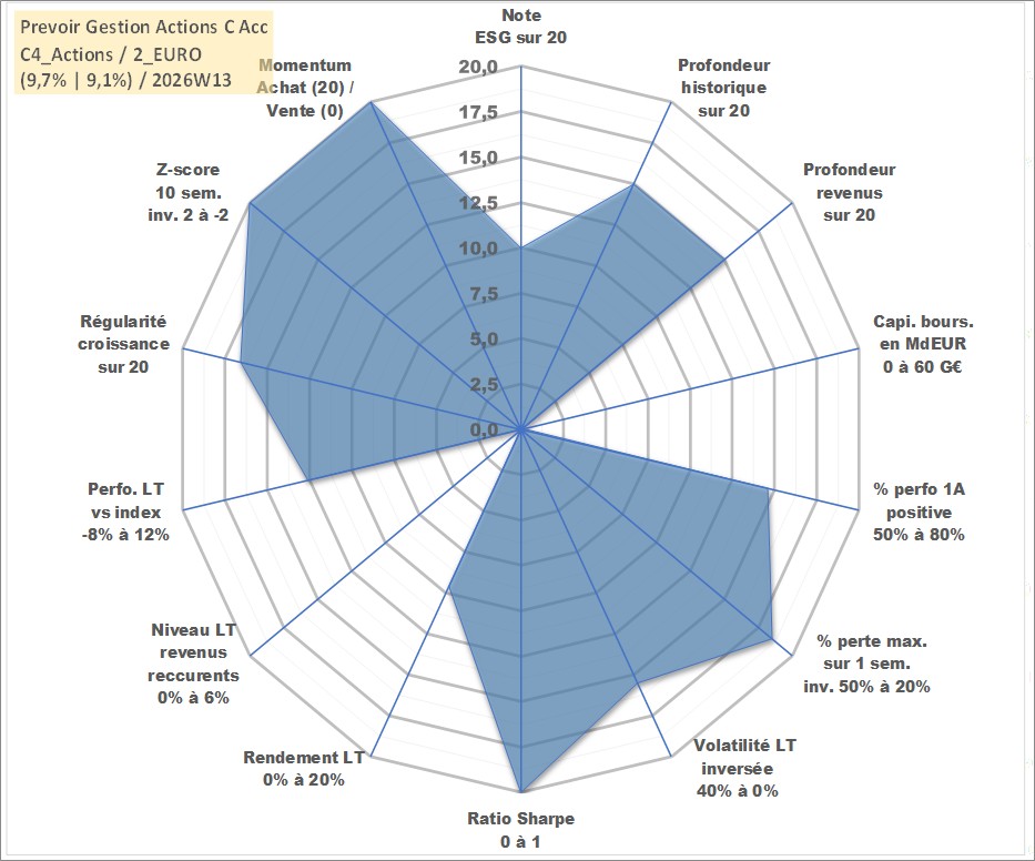 Site dédié aux investisseursPage dédiée sur site financeAnalyse des valorisations hebdomadaires du fonds Prevoir Gestion Actions C Acc. Cet actif est cote en EUR. Les valorisations couvrent les semaines 2005W21 a 2026W13. Les revenus de cet actif financier sont pris en compte depuis la semaine 2005W21. La note globale ESG de cet actif est estimee a 10.0 (apres rebasage entre 0 et 20).