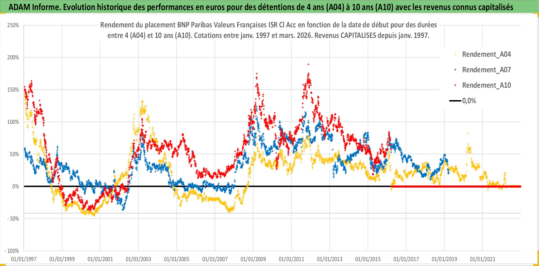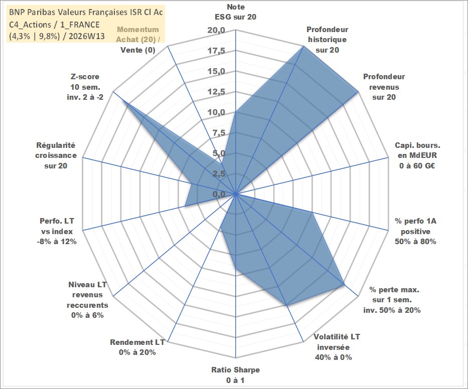 Site dédié aux investisseursPage dédiée sur site financeAnalyse des valorisations hebdomadaires du fonds BNP Paribas Valeurs Françaises ISR Cl Acc. Cet actif est cote en EUR. Les valorisations couvrent les semaines 1997W01 a 2026W13. Les revenus de cet actif financier sont pris en compte depuis la semaine 1997W01. La note globale ESG de cet actif est estimee a 10.0 (apres rebasage entre 0 et 20).