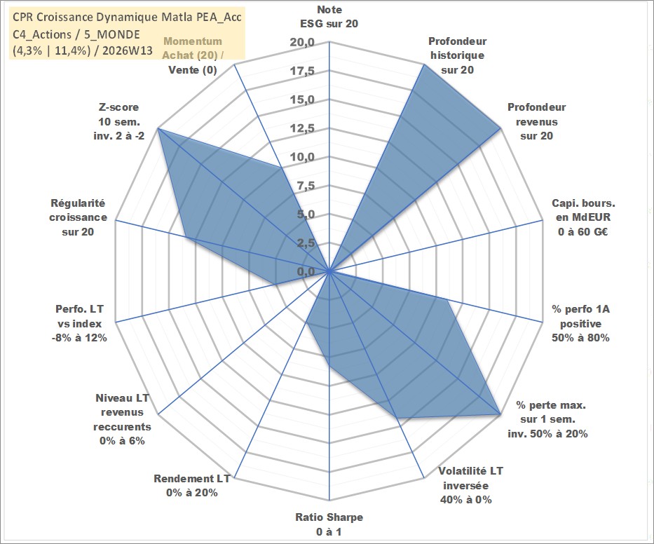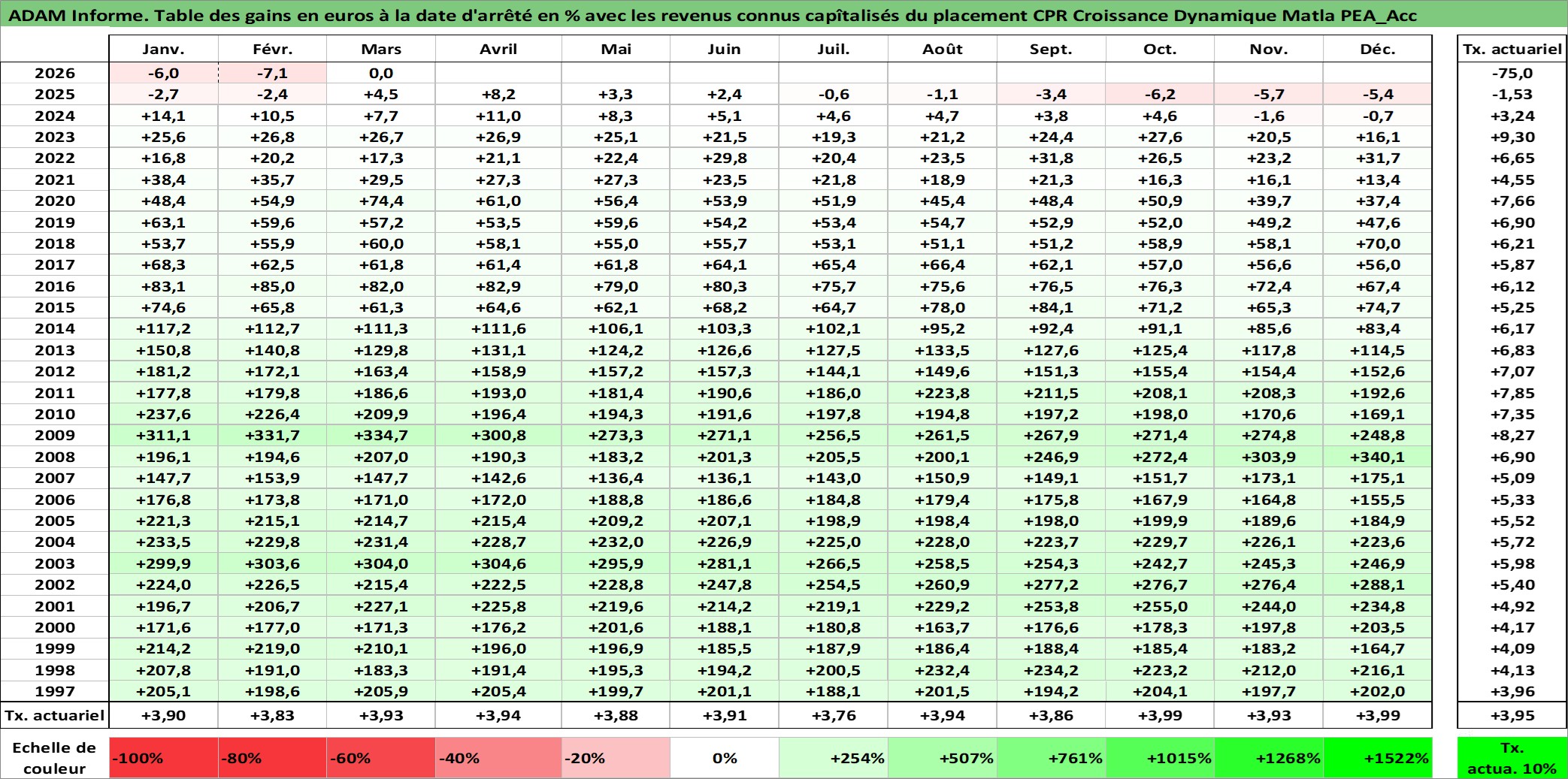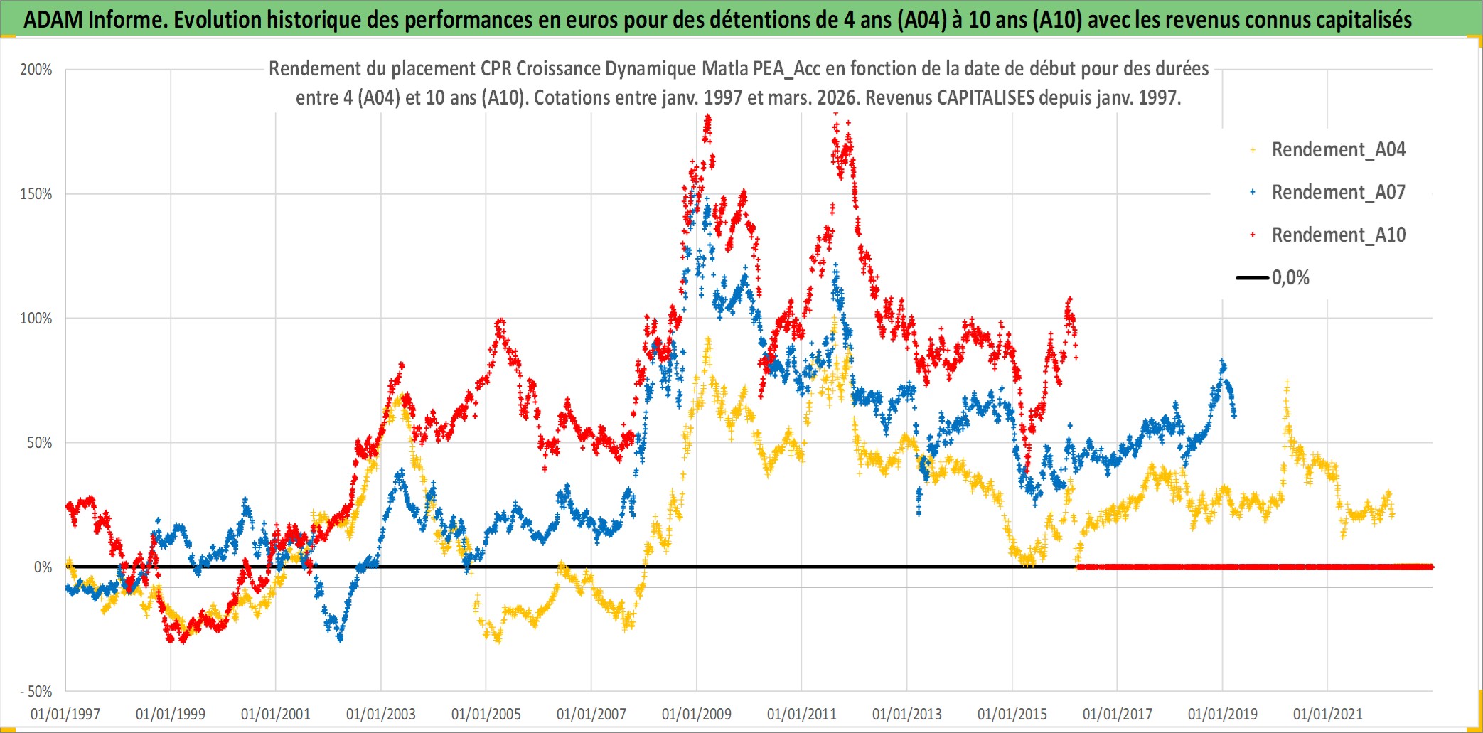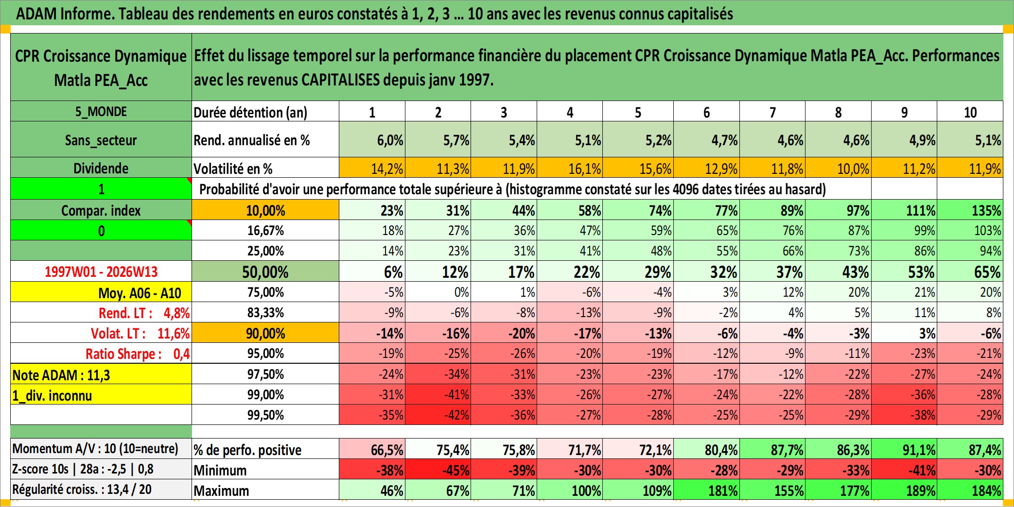 Site dédié aux investisseursPage dédiée sur site financeAnalyse des valorisations hebdomadaires du fonds CPR Croissance Dynamique Matla PEA_Acc. Cet actif est cote en EUR. Les valorisations couvrent les semaines 1997W01 a 2026W13. Les revenus de cet actif financier sont pris en compte depuis la semaine 1997W01. La note ESG de cet actif n'est pas connue.