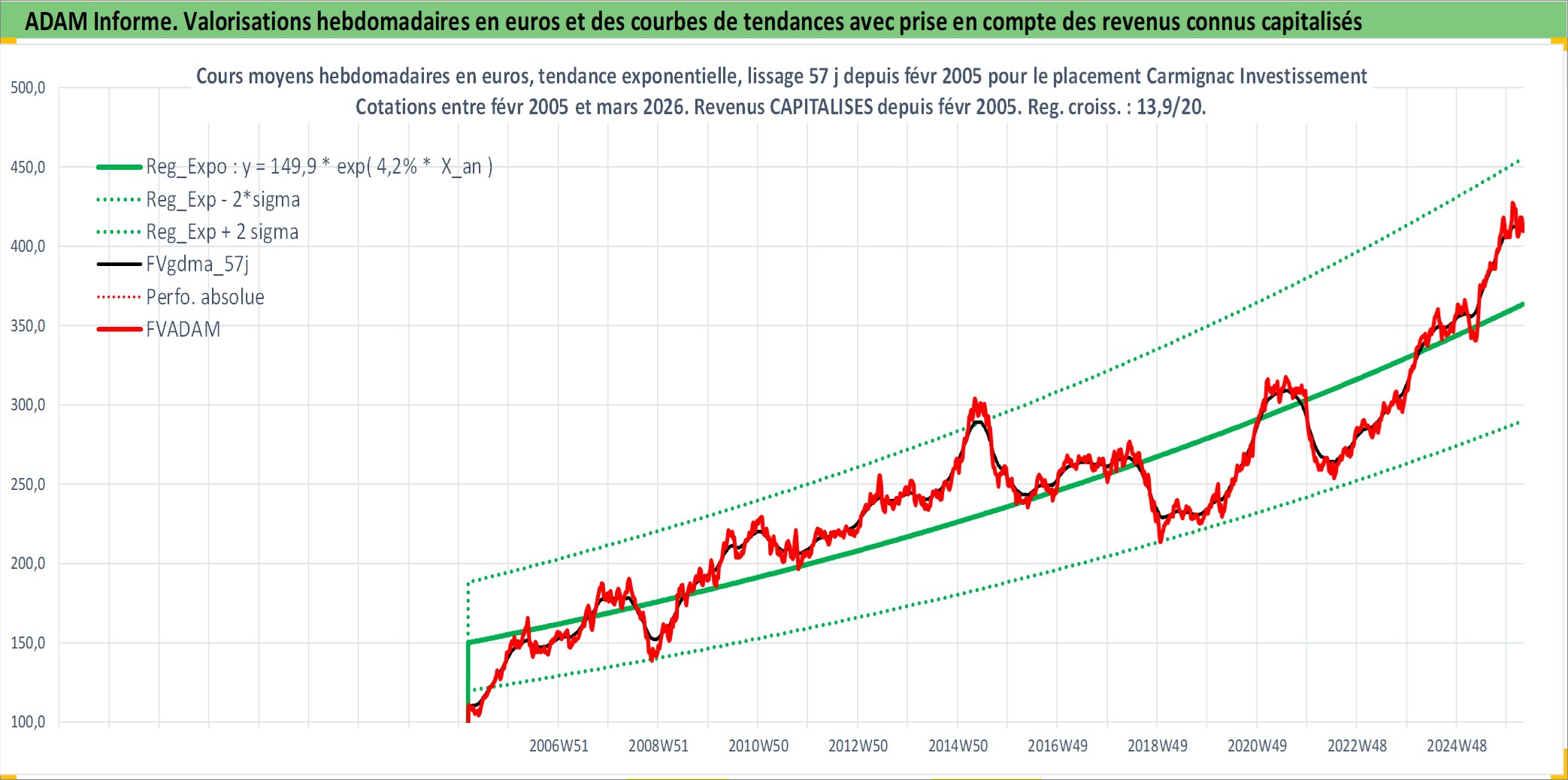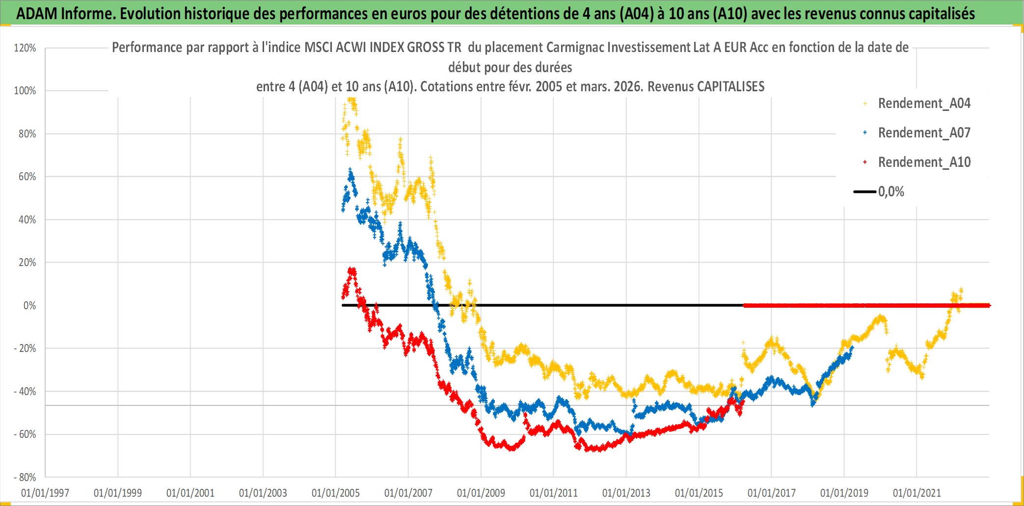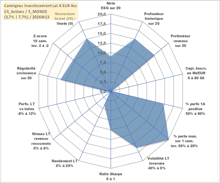 Site dédié aux investisseursPage dédiée sur site financeAnalyse des valorisations hebdomadaires du fonds Carmignac Investissement Lat A EUR Acc. Cet actif est cote en EUR. Les valorisations couvrent les semaines 2005W09 a 2026W13. Les revenus de cet actif financier sont pris en compte depuis la semaine 2005W09. La note globale ESG de cet actif est estimee a 9.0 (apres rebasage entre 0 et 20).