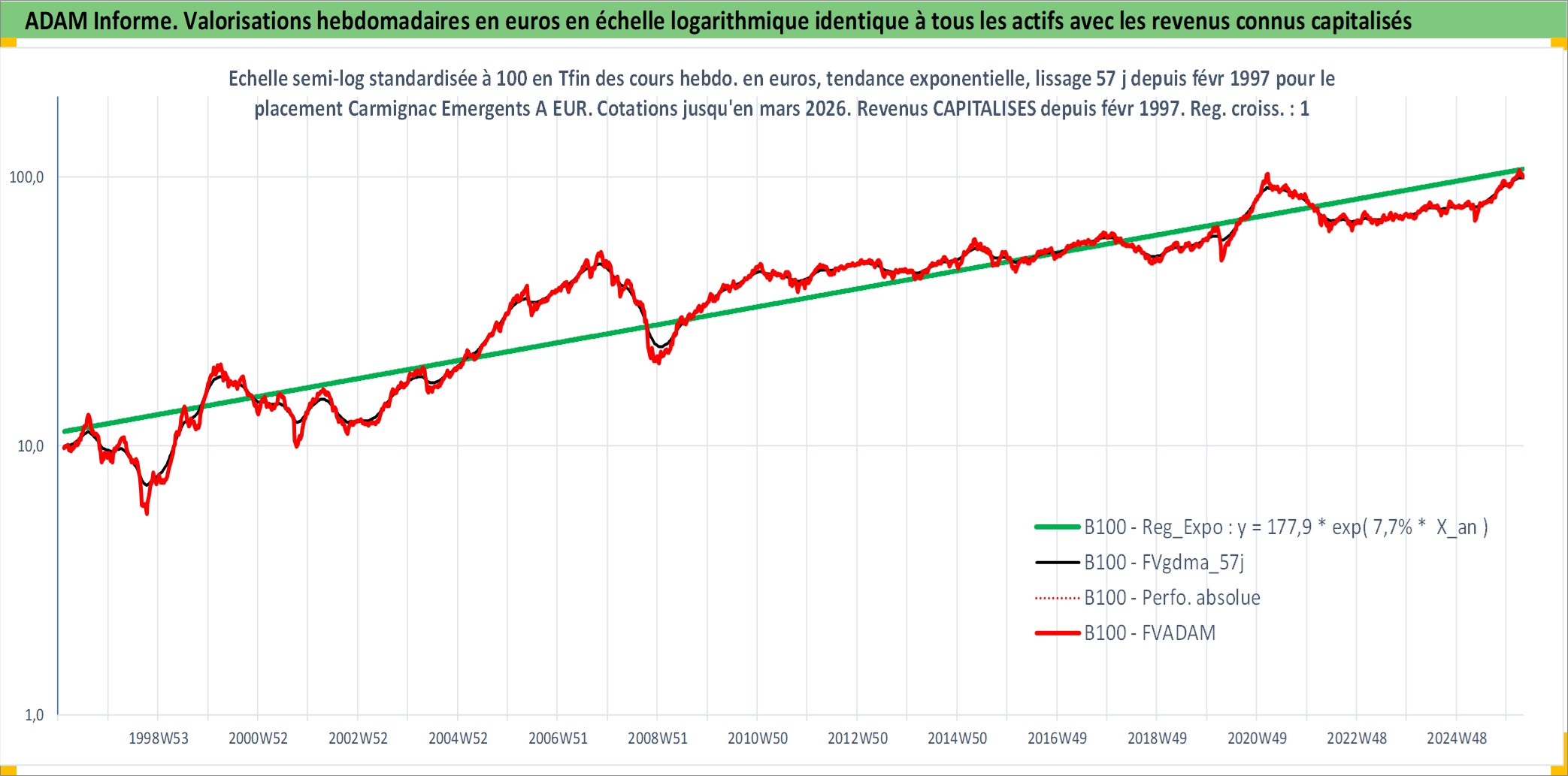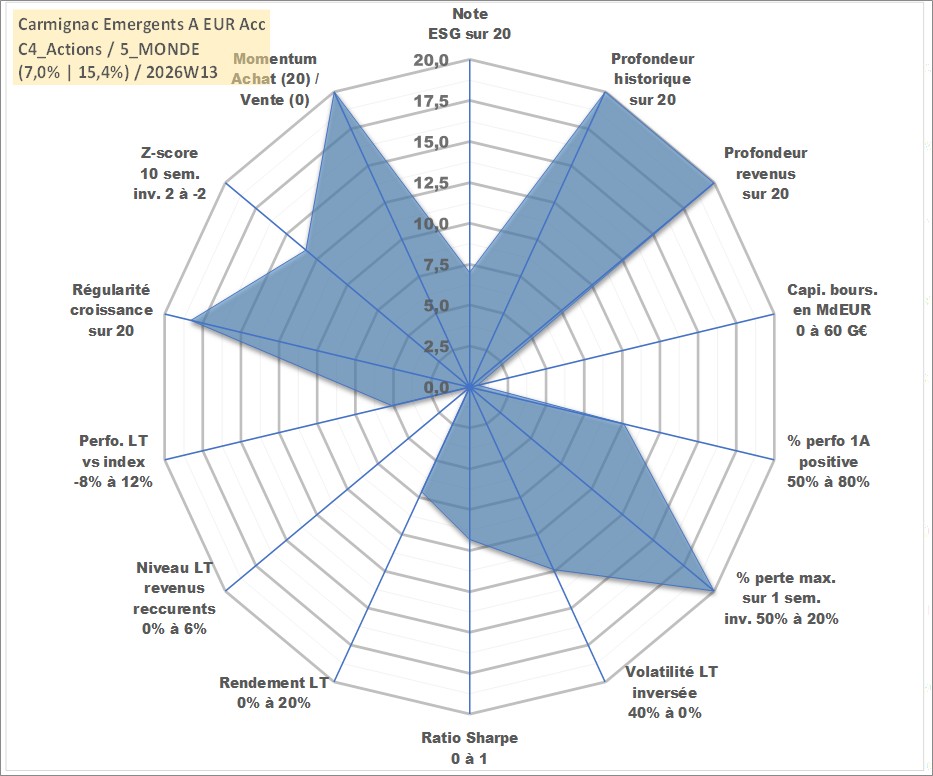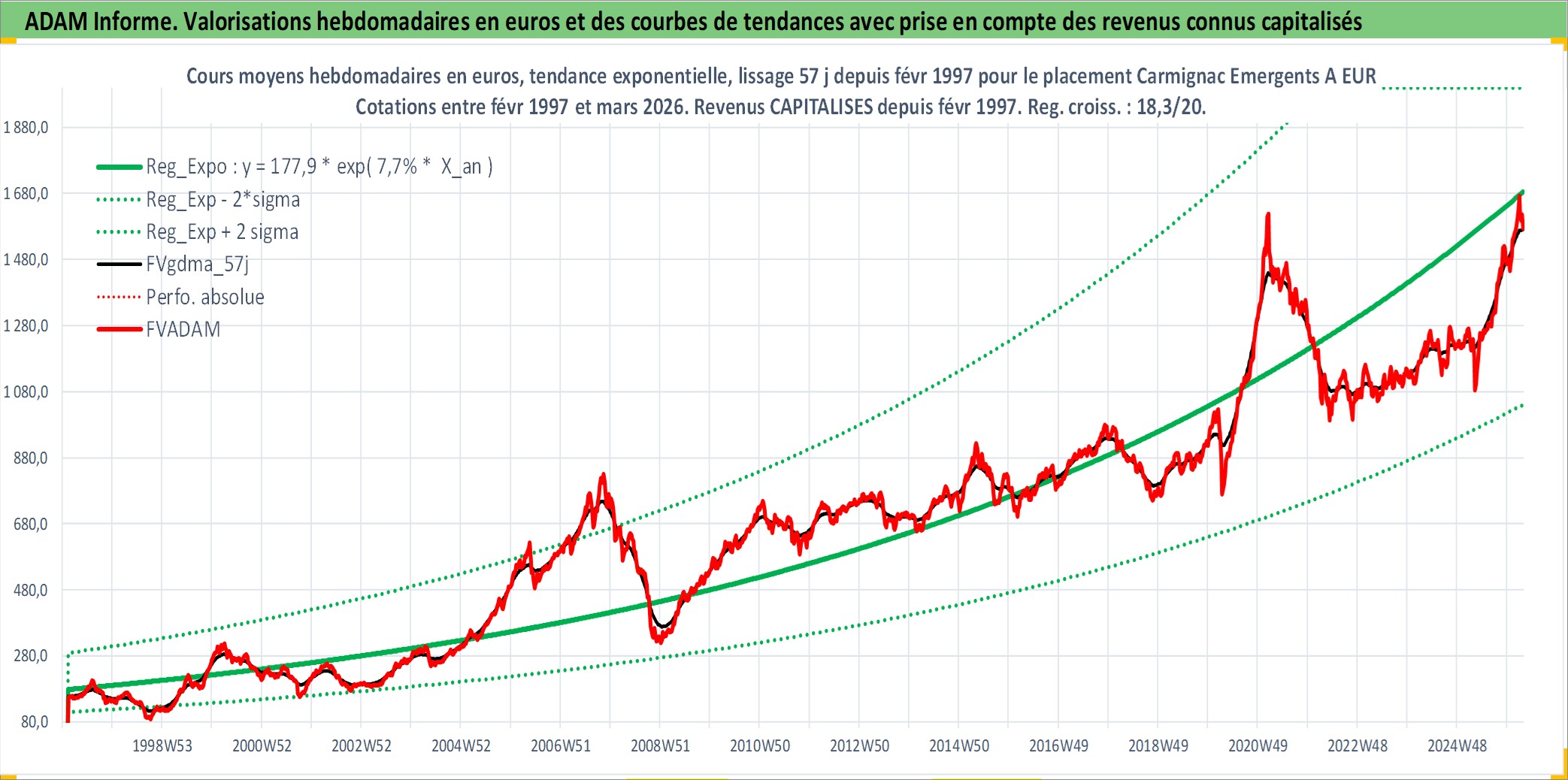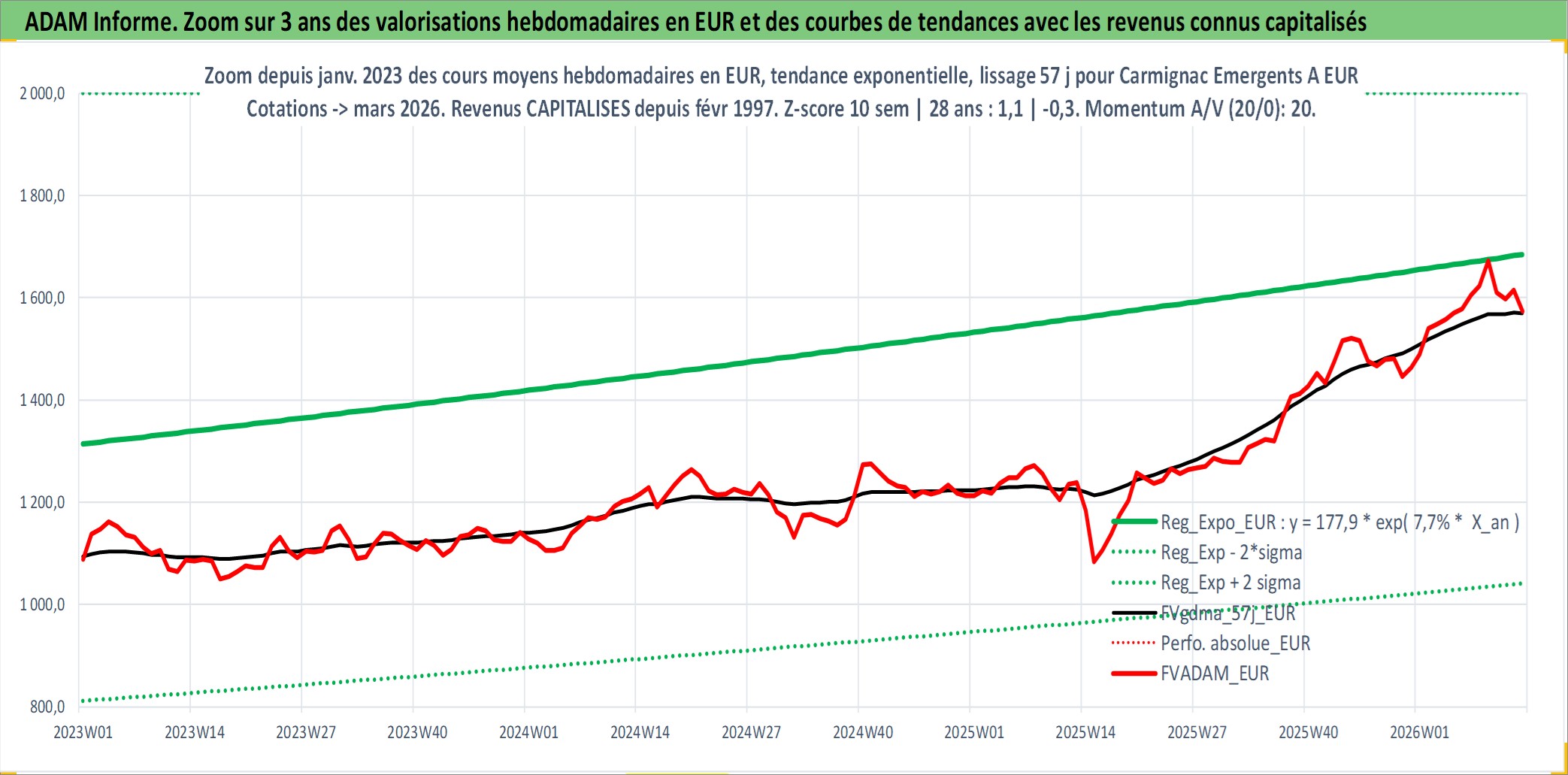 Site dédié aux investisseursPage dédiée sur site financeAnalyse des valorisations hebdomadaires du fonds Carmignac Emergents A EUR Acc. Cet actif est cote en EUR. Les valorisations couvrent les semaines 1997W07 a 2026W13. Les revenus de cet actif financier sont pris en compte depuis la semaine 1997W07. La note globale ESG de cet actif est estimee a 7.0 (apres rebasage entre 0 et 20).