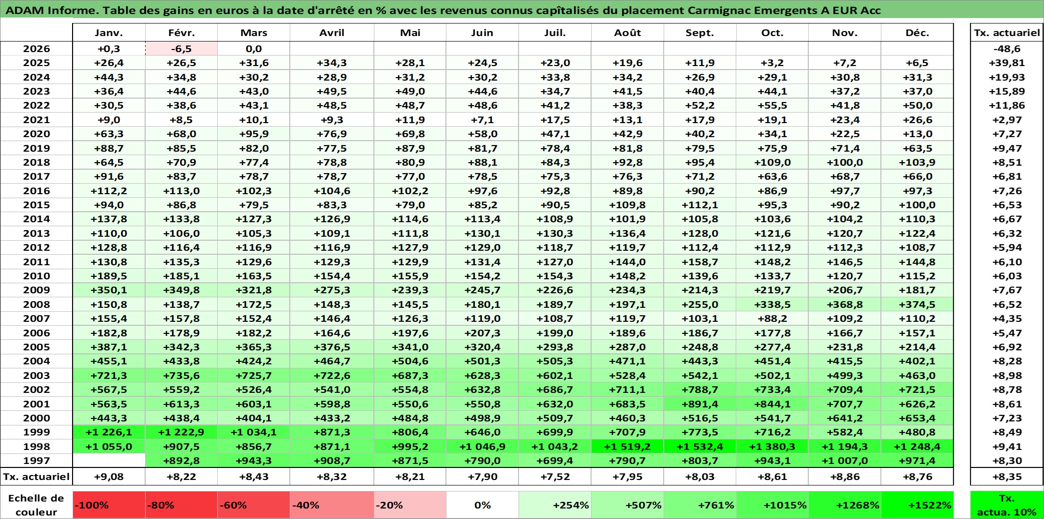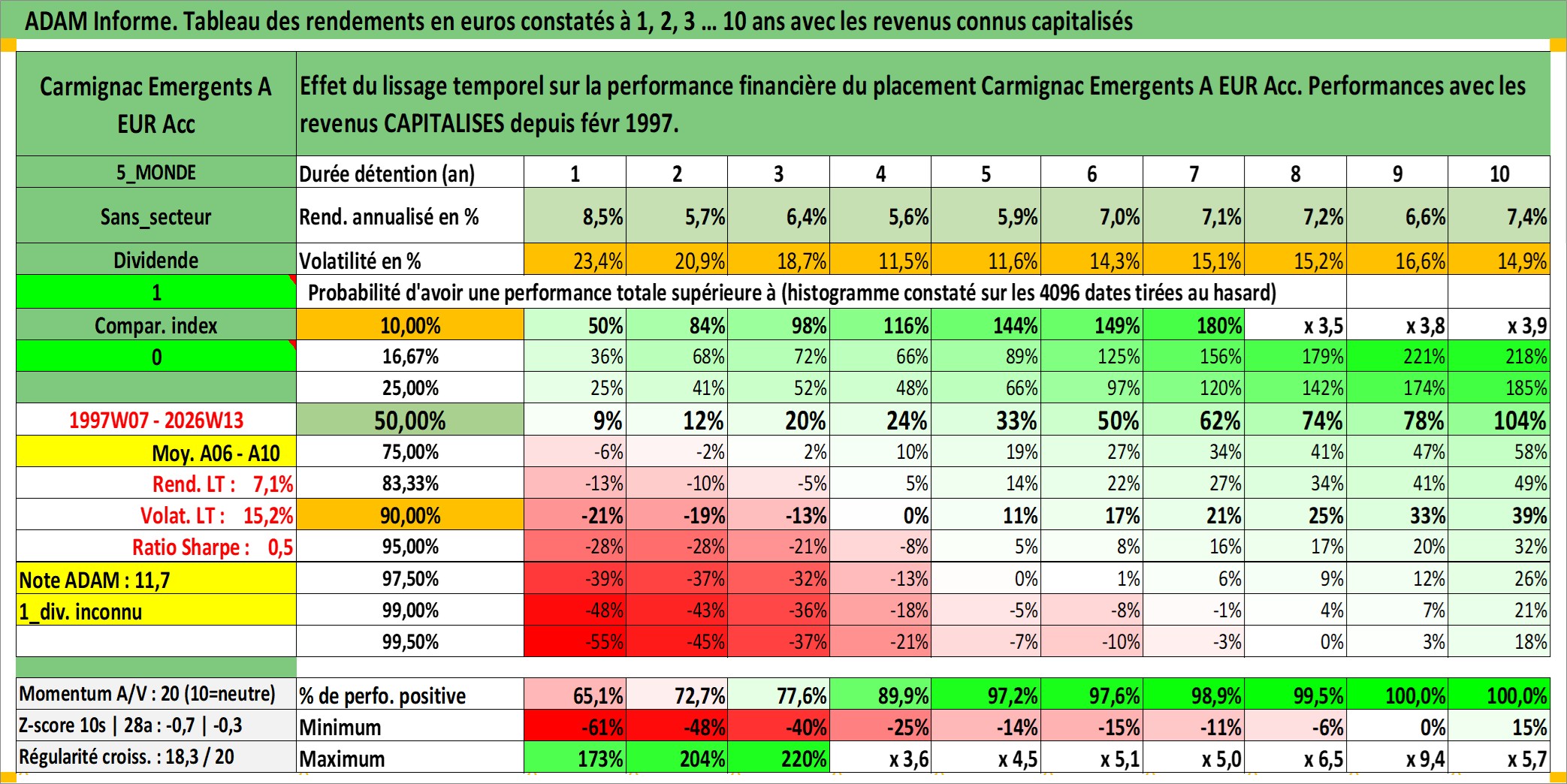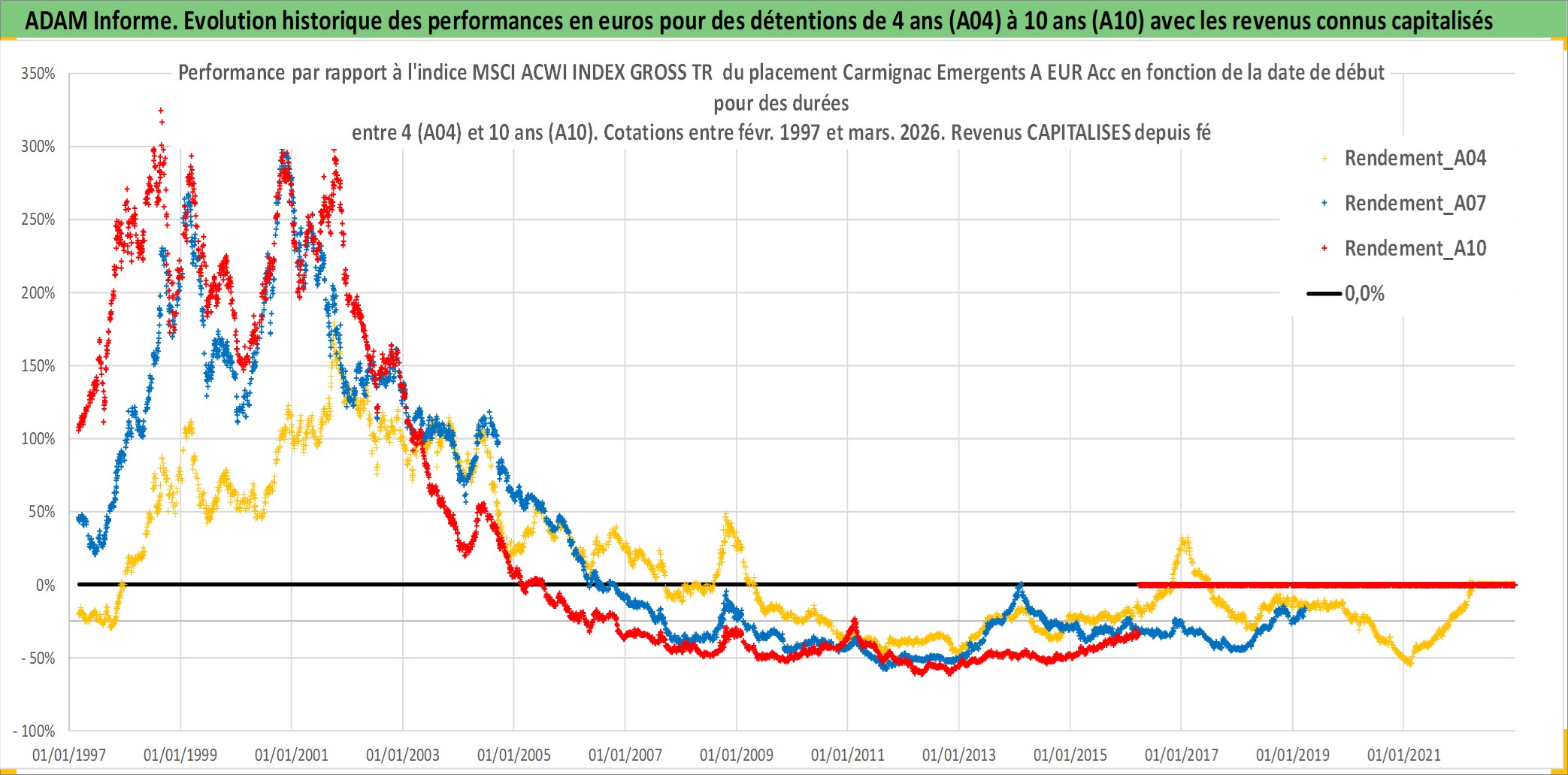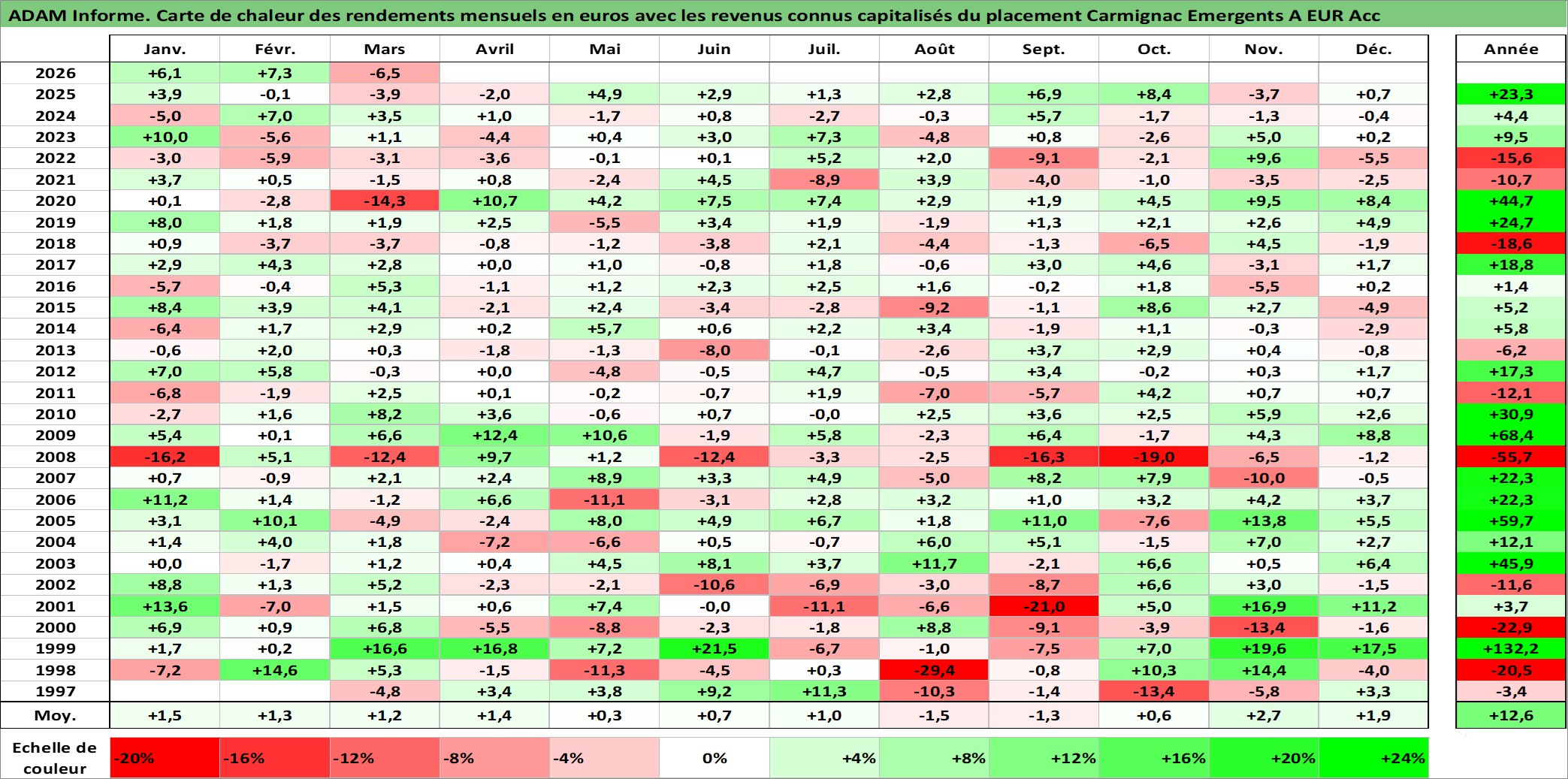 Site dédié aux investisseursPage dédiée sur site financeAnalyse des valorisations hebdomadaires du fonds Carmignac Emergents A EUR Acc. Cet actif est cote en EUR. Les valorisations couvrent les semaines 1997W07 a 2026W13. Les revenus de cet actif financier sont pris en compte depuis la semaine 1997W07. La note globale ESG de cet actif est estimee a 7.0 (apres rebasage entre 0 et 20).