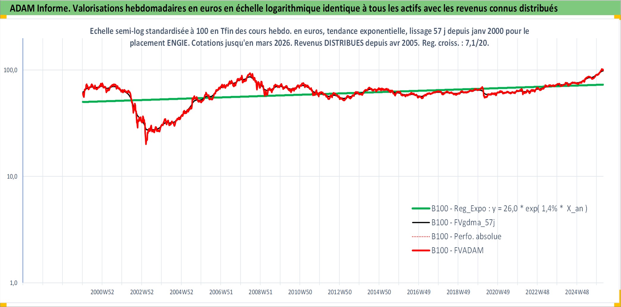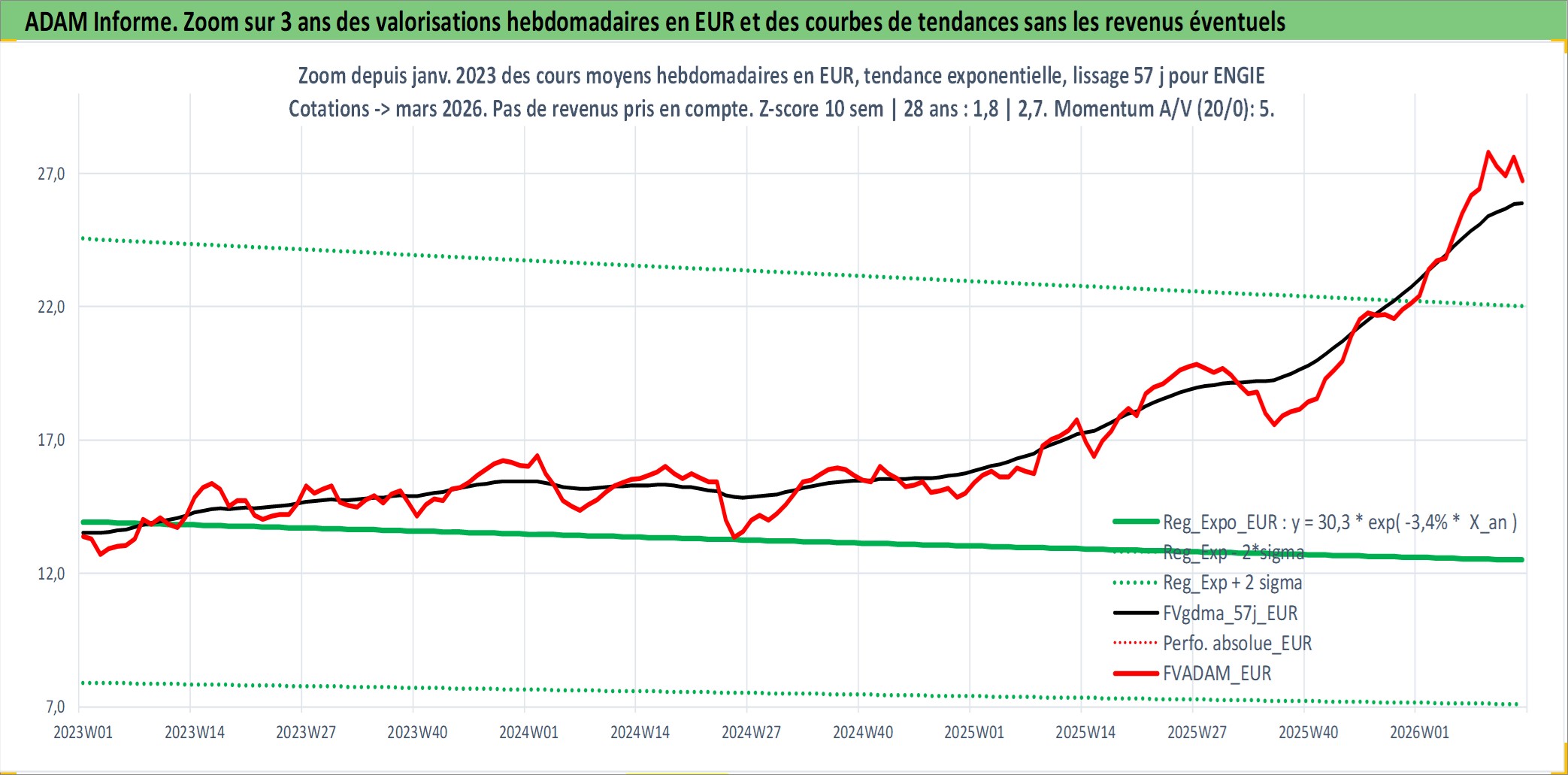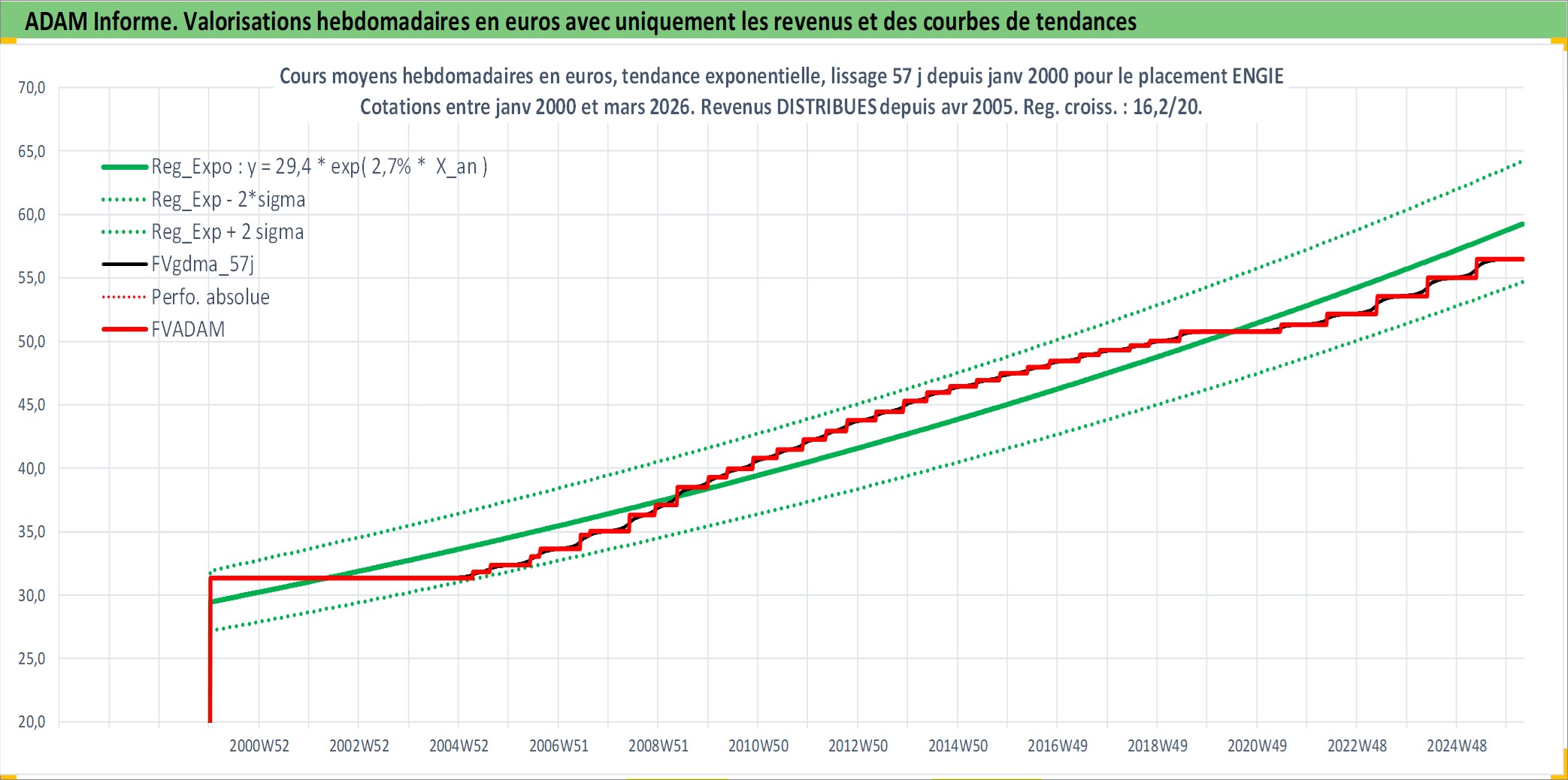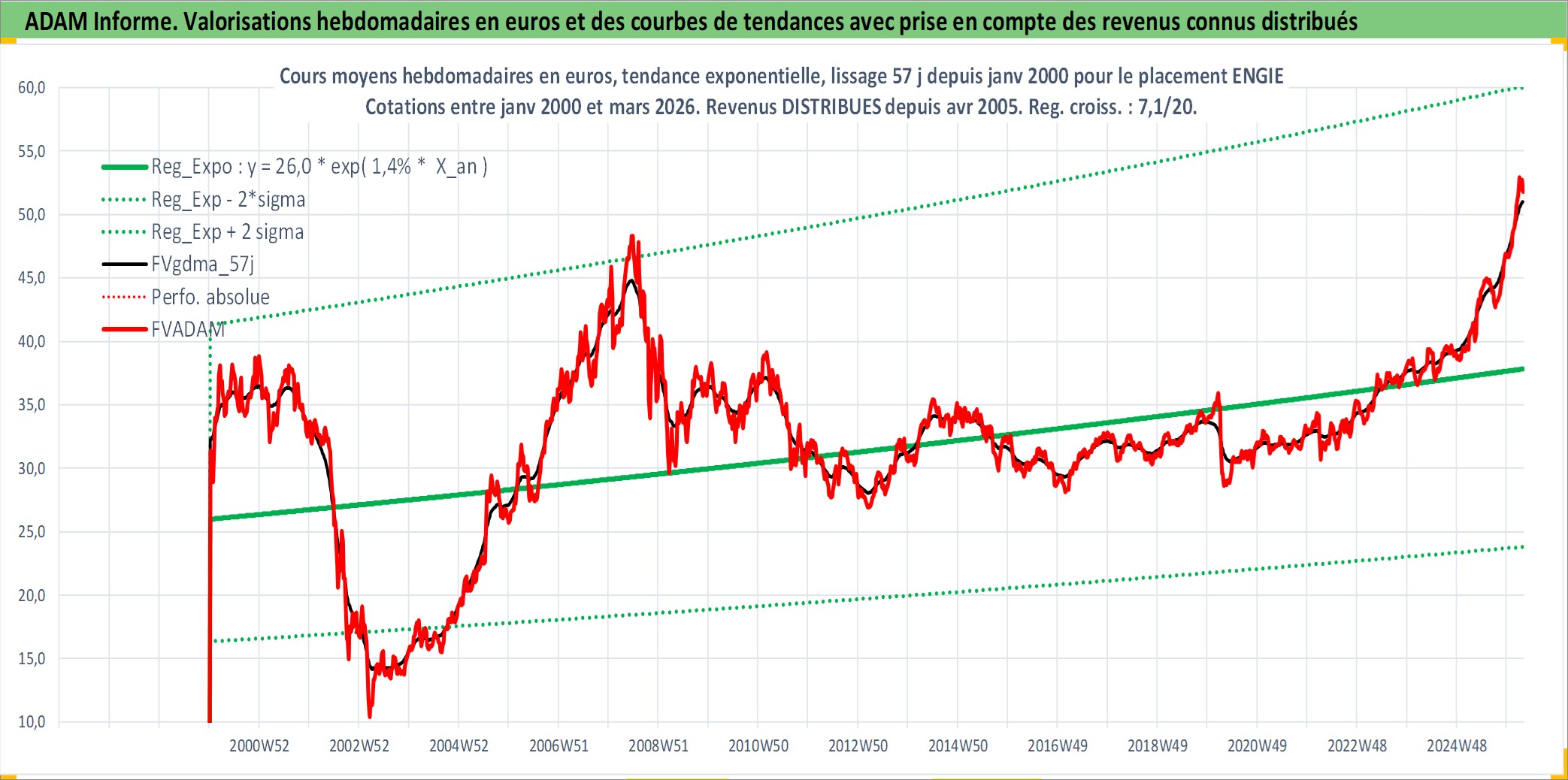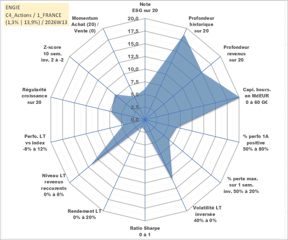 Site dédié aux investisseursPage dédiée sur site financeAnalyse des valorisations hebdomadaires de l'action ENGIE. Cet actif est cote en EUR. Les valorisations couvrent les semaines 2000W01 a 2026W13. Les revenus de cet actif financier sont pris en compte depuis la semaine 2005W14. La note globale ESG de cet actif est estimee a 6.0 (apres rebasage entre 0 et 20).