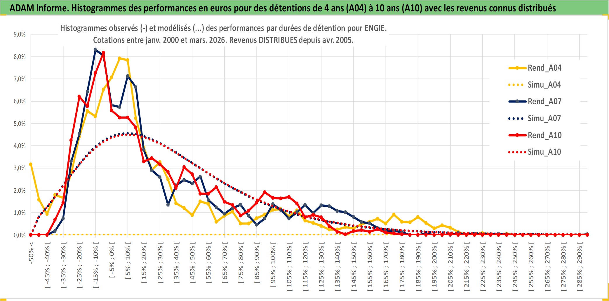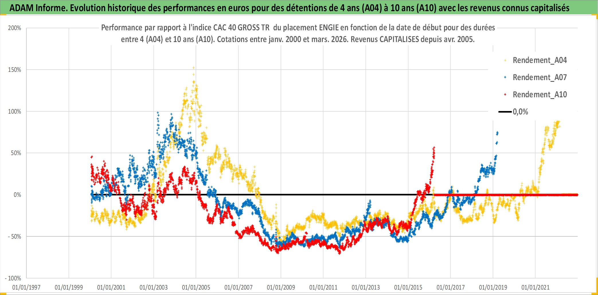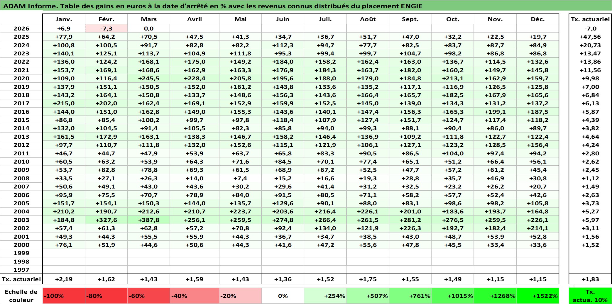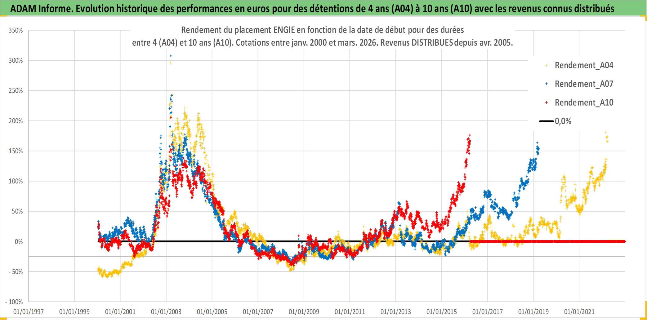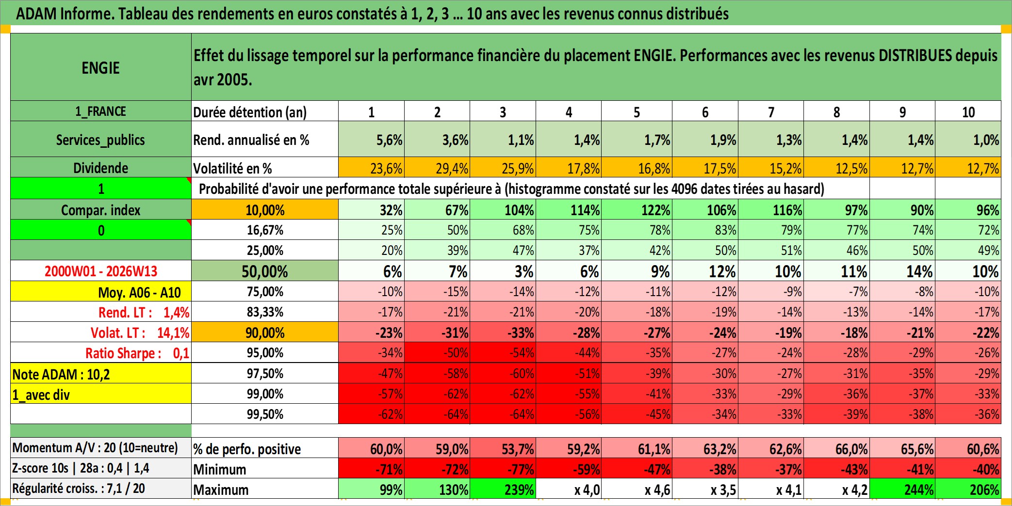 Site dédié aux investisseursPage dédiée sur site financeAnalyse des valorisations hebdomadaires de l'action ENGIE. Cet actif est cote en EUR. Les valorisations couvrent les semaines 2000W01 a 2026W13. Les revenus de cet actif financier sont pris en compte depuis la semaine 2005W14. La note globale ESG de cet actif est estimee a 6.0 (apres rebasage entre 0 et 20).