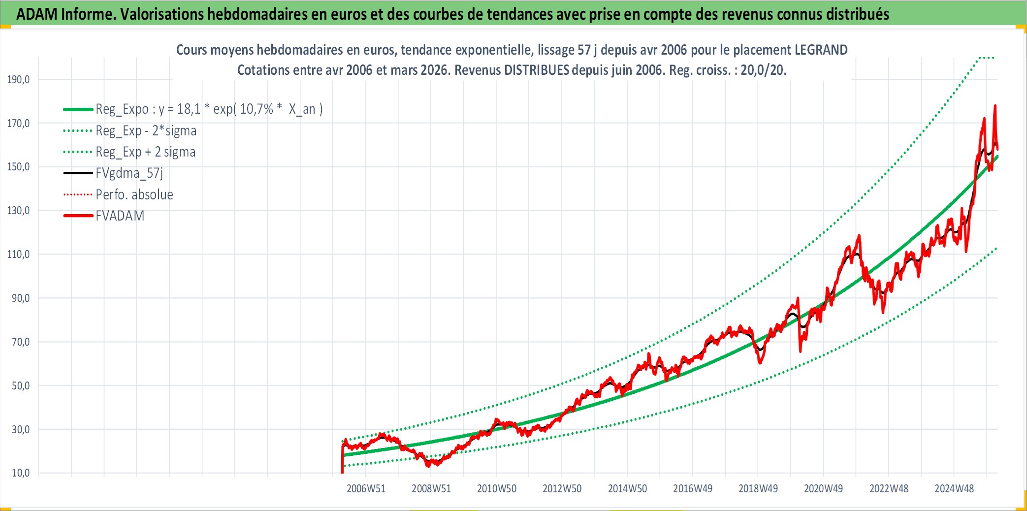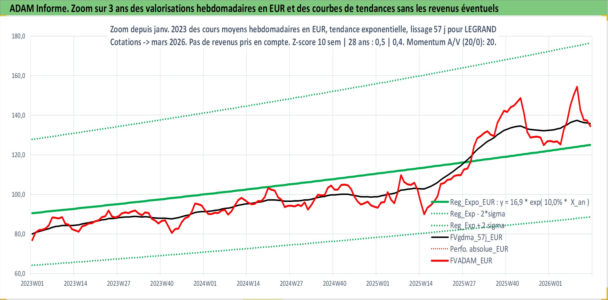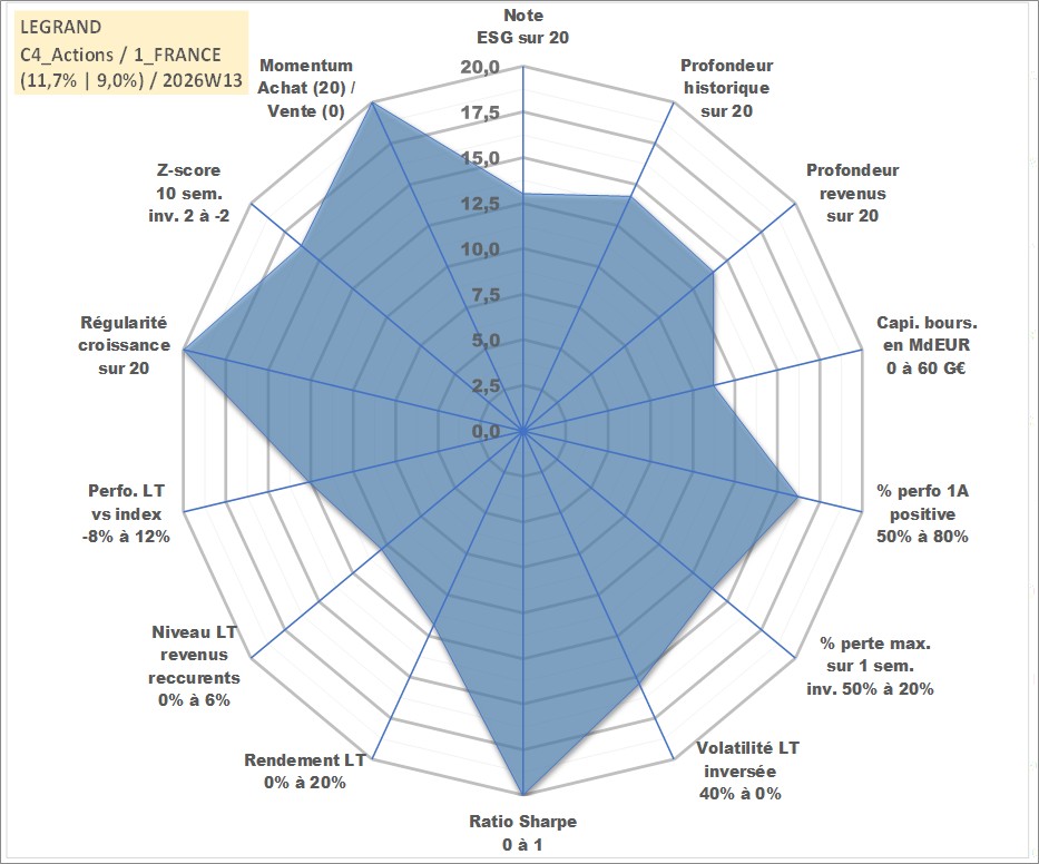 Site dédié aux investisseursPage dédiée sur site financeAnalyse des valorisations hebdomadaires de l'action LEGRAND. Cet actif est cote en EUR. Les valorisations couvrent les semaines 2006W14 a 2026W13. Les revenus de cet actif financier sont pris en compte depuis la semaine 2006W23. La note globale ESG de cet actif est estimee a 13.0 (apres rebasage entre 0 et 20).