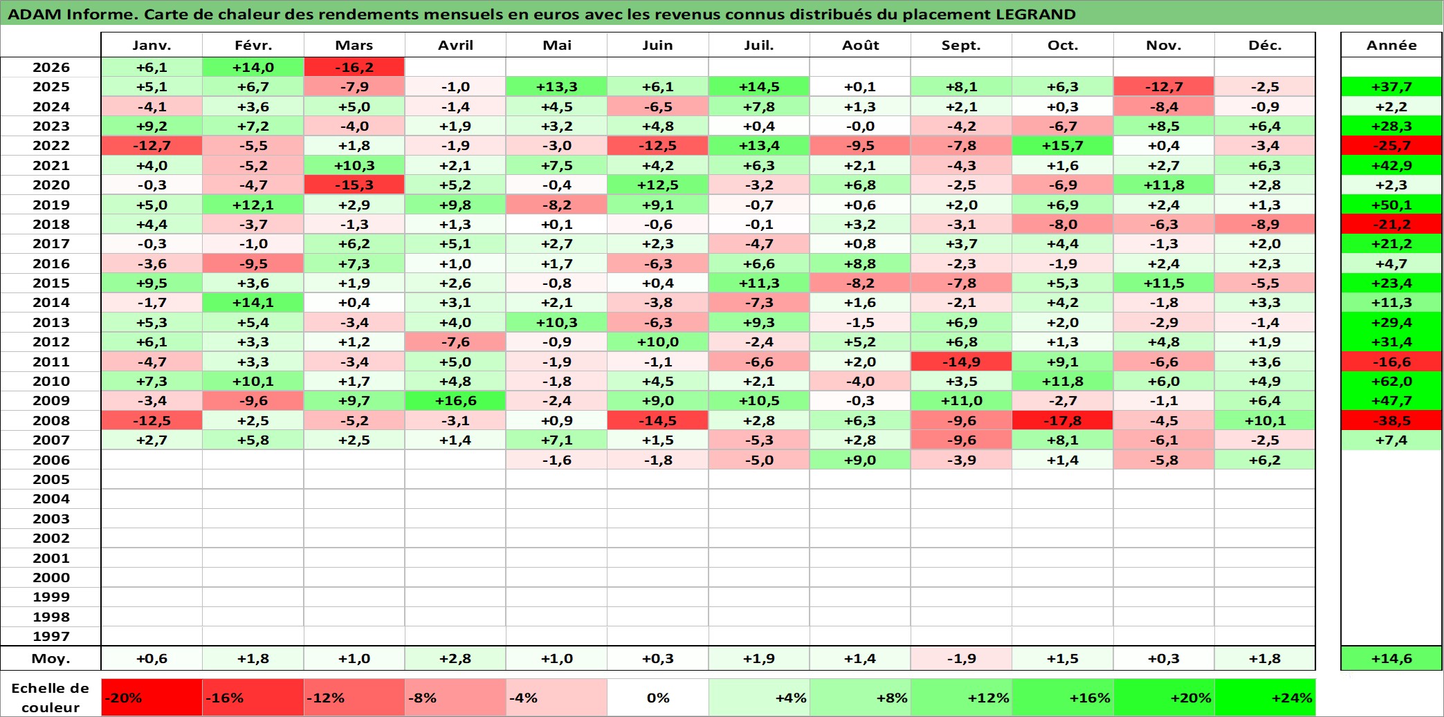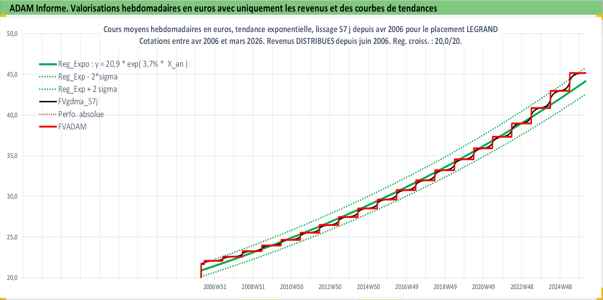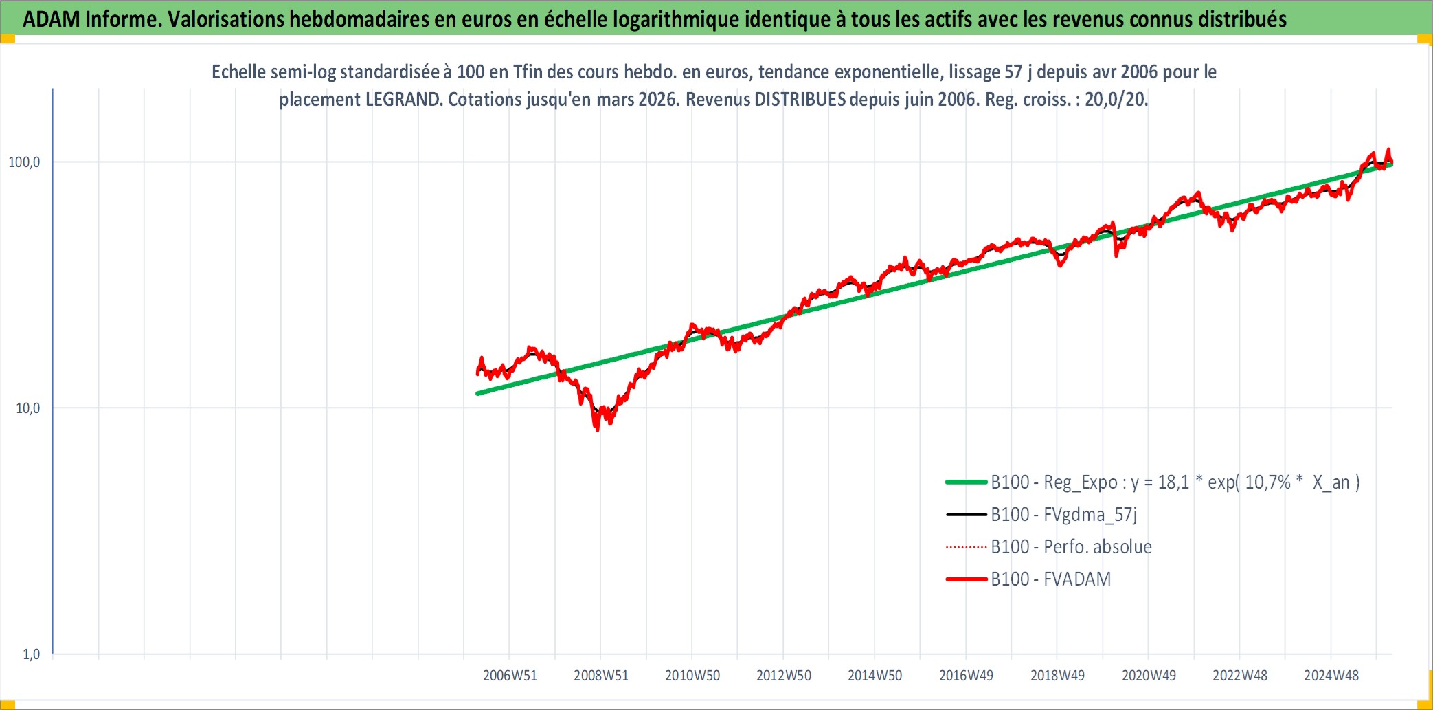Site dédié aux investisseursPage dédiée sur site financeAnalyse des valorisations hebdomadaires de l'action LEGRAND. Cet actif est cote en EUR. Les valorisations couvrent les semaines 2006W14 a 2026W13. Les revenus de cet actif financier sont pris en compte depuis la semaine 2006W23. La note globale ESG de cet actif est estimee a 13.0 (apres rebasage entre 0 et 20).