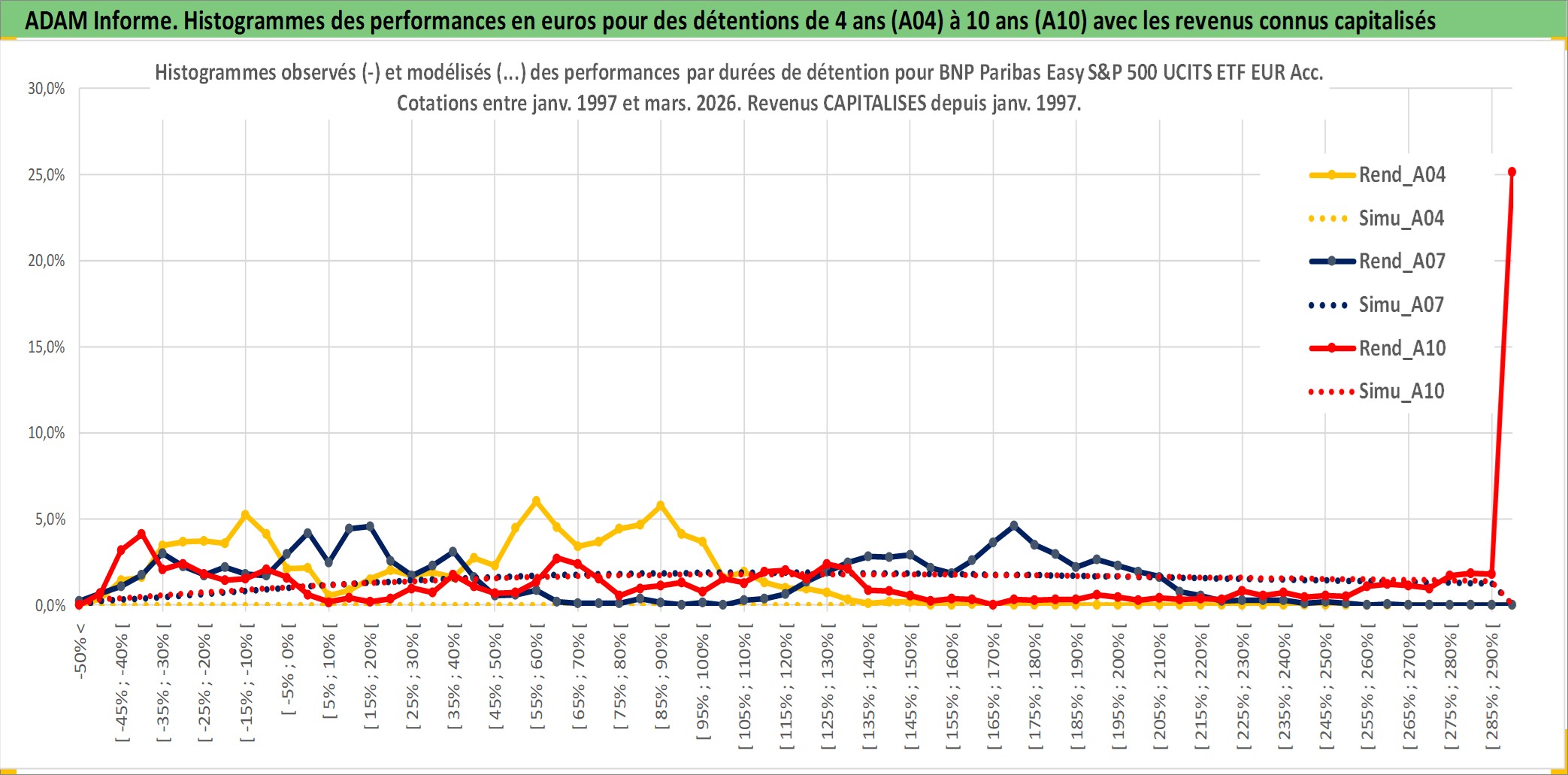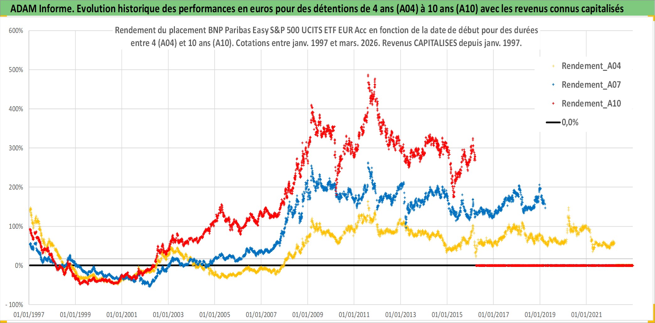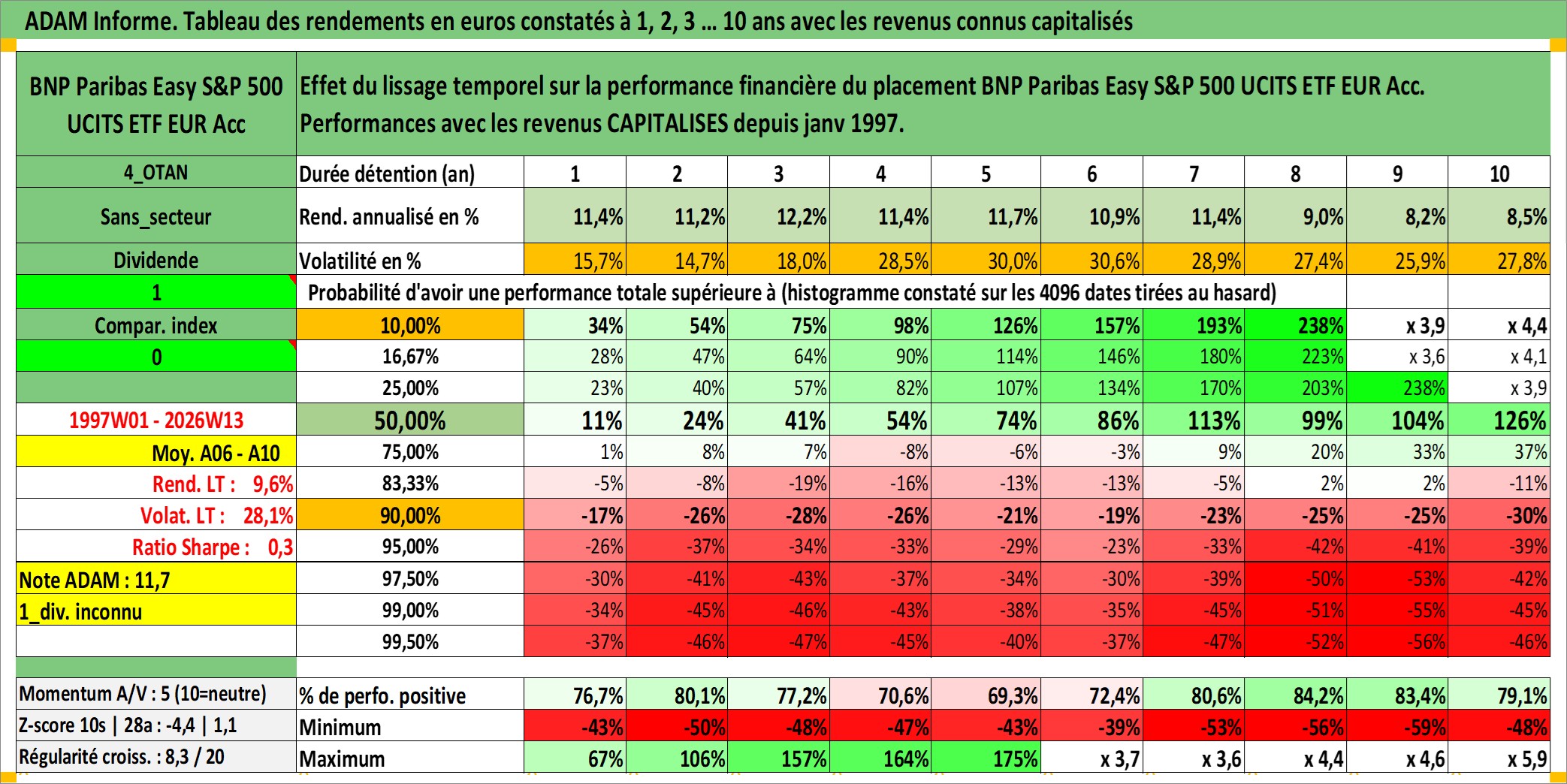 Site dédié aux investisseursPage dédiée sur site financeAnalyse des valorisations hebdomadaires du fonds BNP Paribas Easy S&P 500 UCITS ETF EUR Acc. Cet actif est cote en EUR. Les valorisations couvrent les semaines 1997W01 a 2026W13. Les revenus de cet actif financier sont pris en compte depuis la semaine 1997W01. La note ESG de cet actif n'est pas connue.