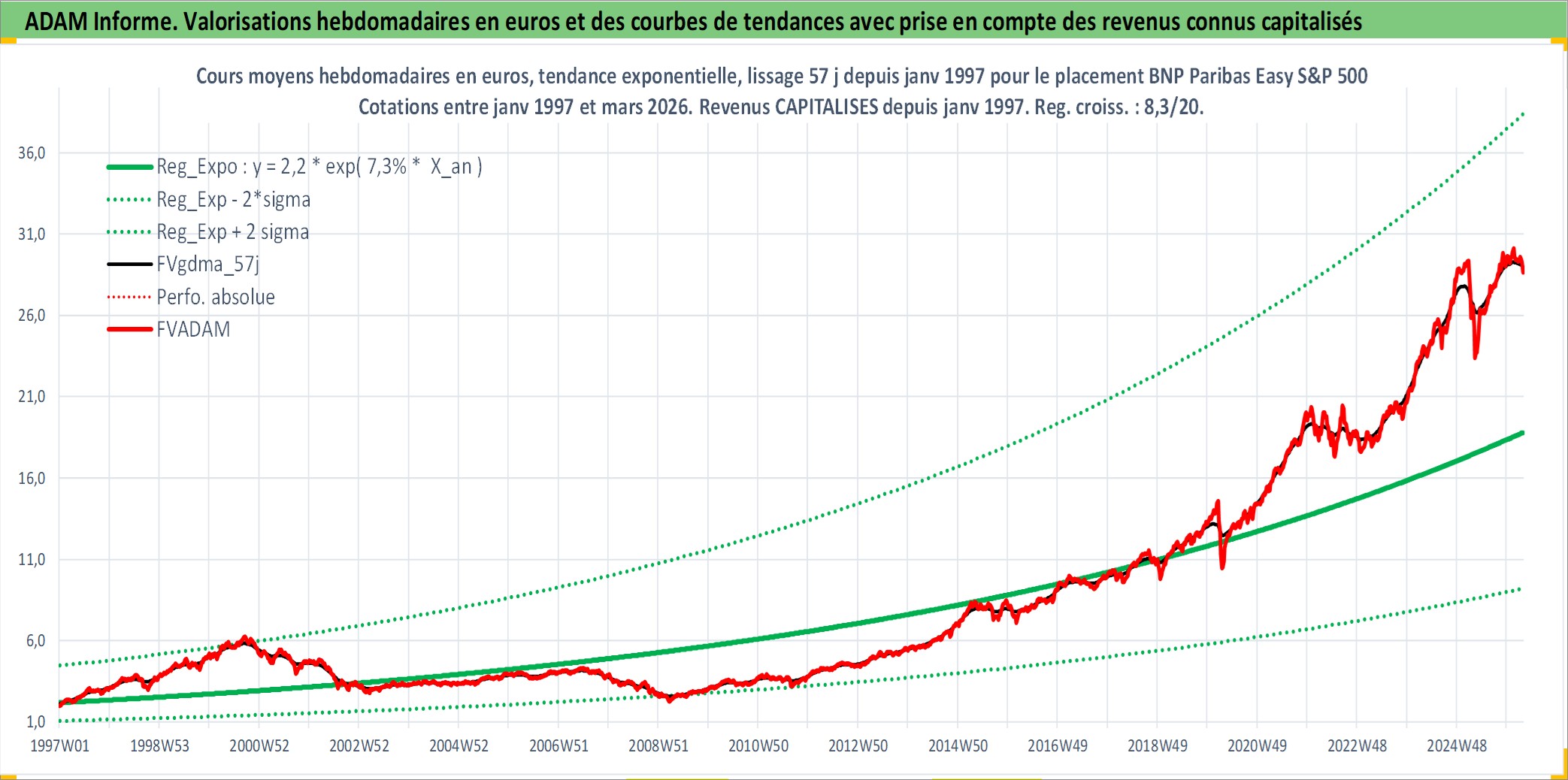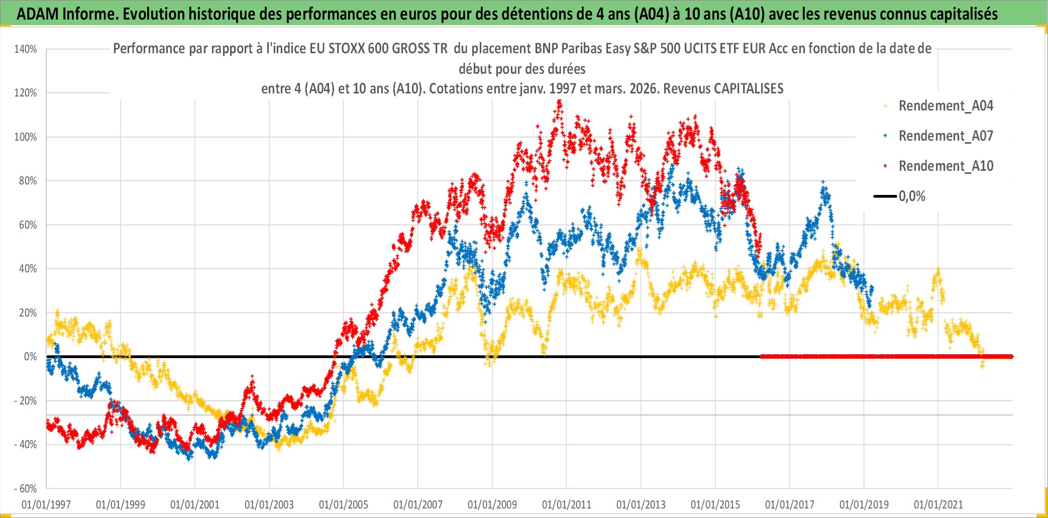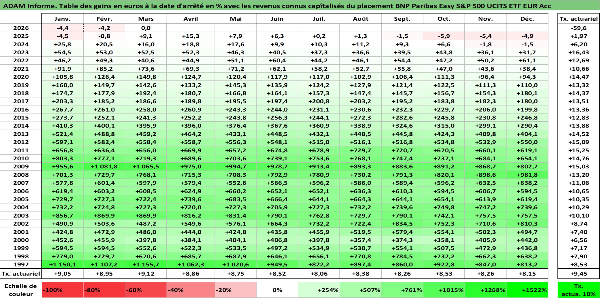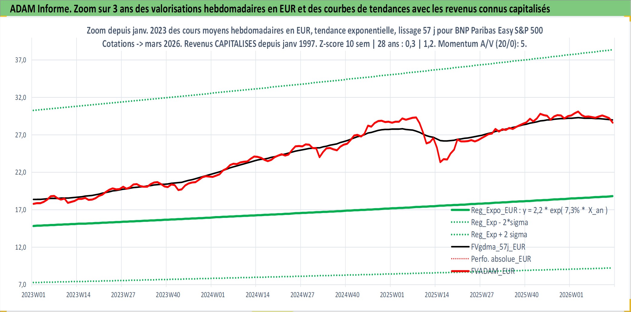 Site dédié aux investisseursPage dédiée sur site financeAnalyse des valorisations hebdomadaires du fonds BNP Paribas Easy S&P 500 UCITS ETF EUR Acc. Cet actif est cote en EUR. Les valorisations couvrent les semaines 1997W01 a 2026W13. Les revenus de cet actif financier sont pris en compte depuis la semaine 1997W01. La note ESG de cet actif n'est pas connue.