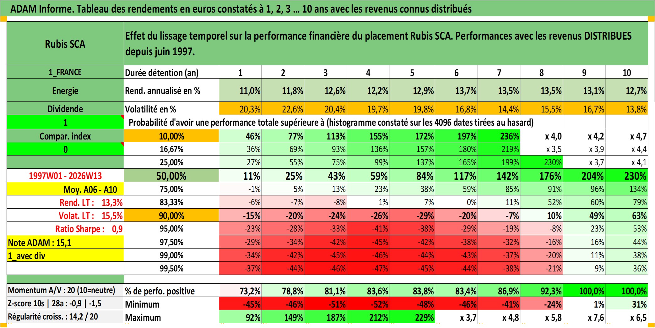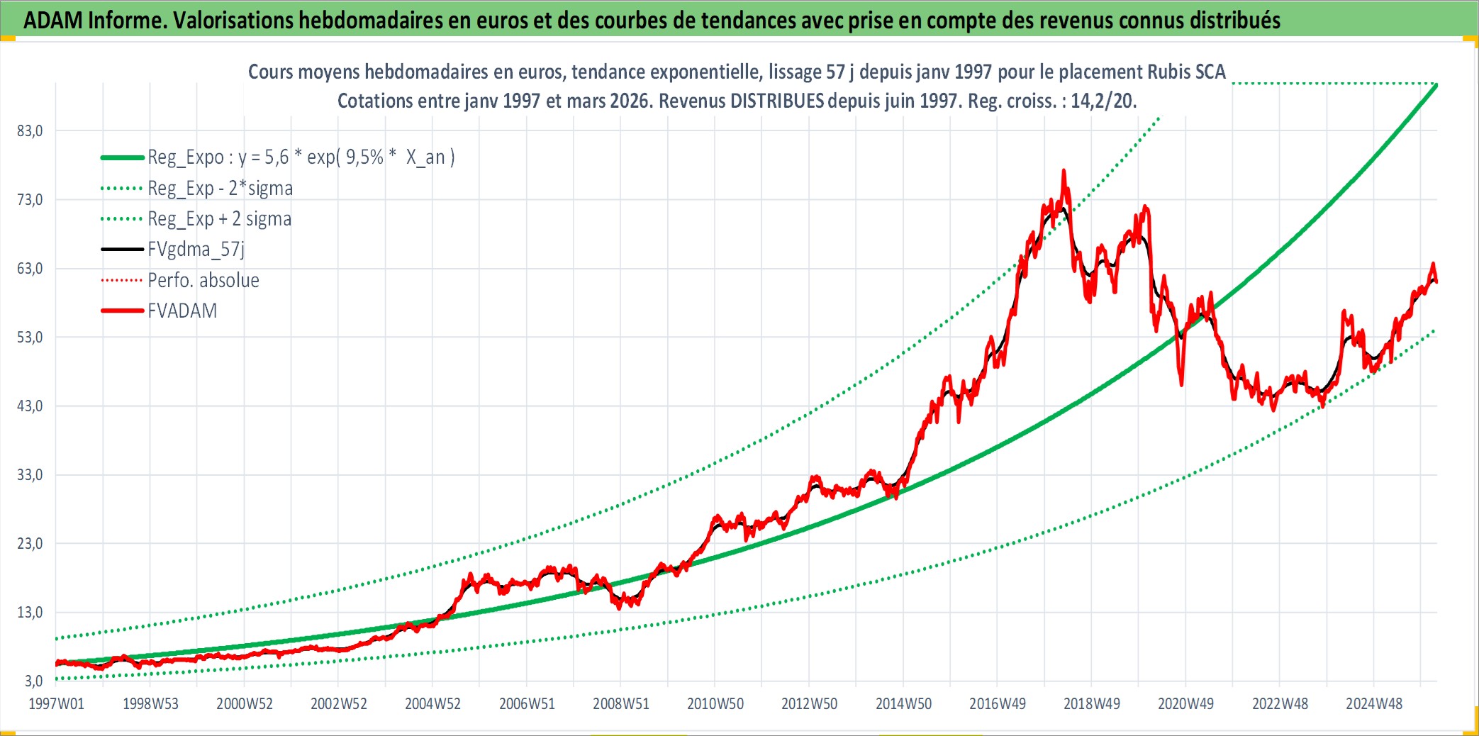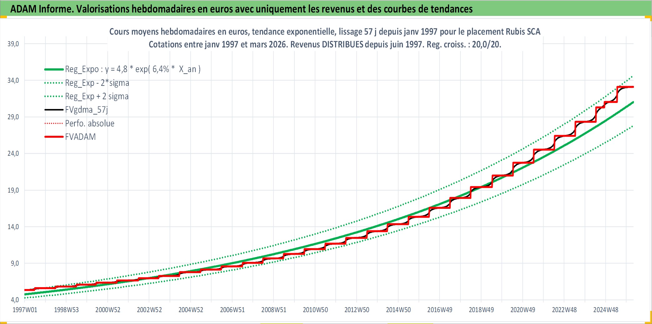 Site dédié aux investisseursPage dédiée sur site financeAnalyse des valorisations hebdomadaires de l'action Rubis SCA. Cet actif est cote en EUR. Les valorisations couvrent les semaines 1997W01 a 2026W13. Les revenus de cet actif financier sont pris en compte depuis la semaine 1997W26. La note ESG de cet actif n'est pas connue.