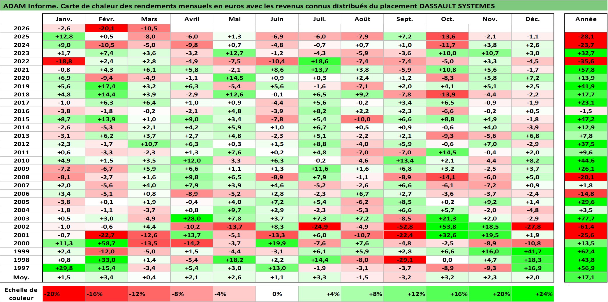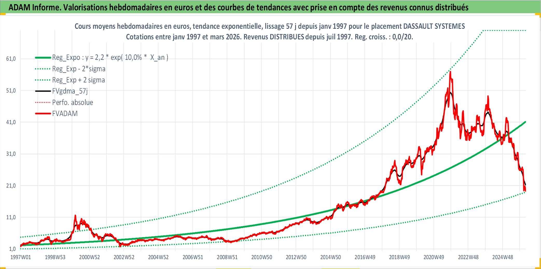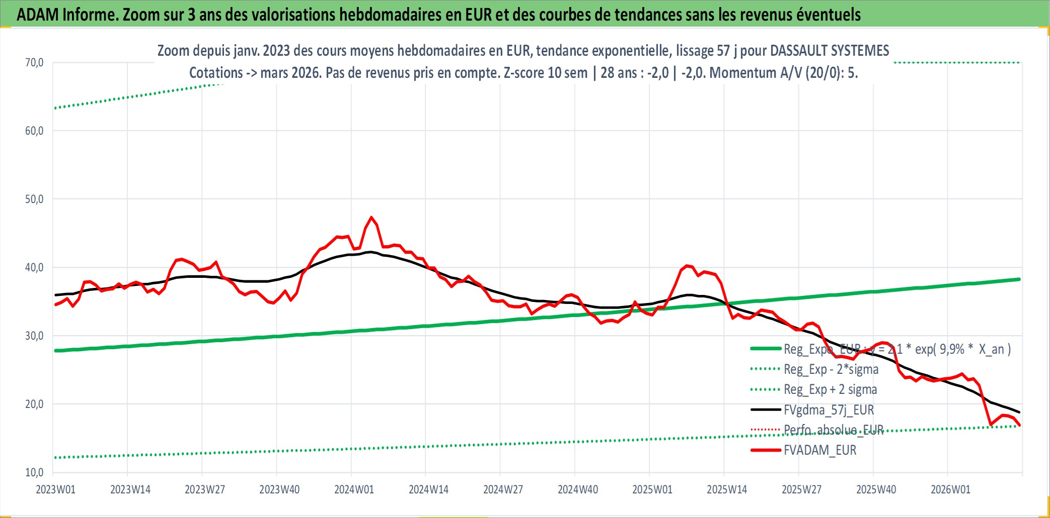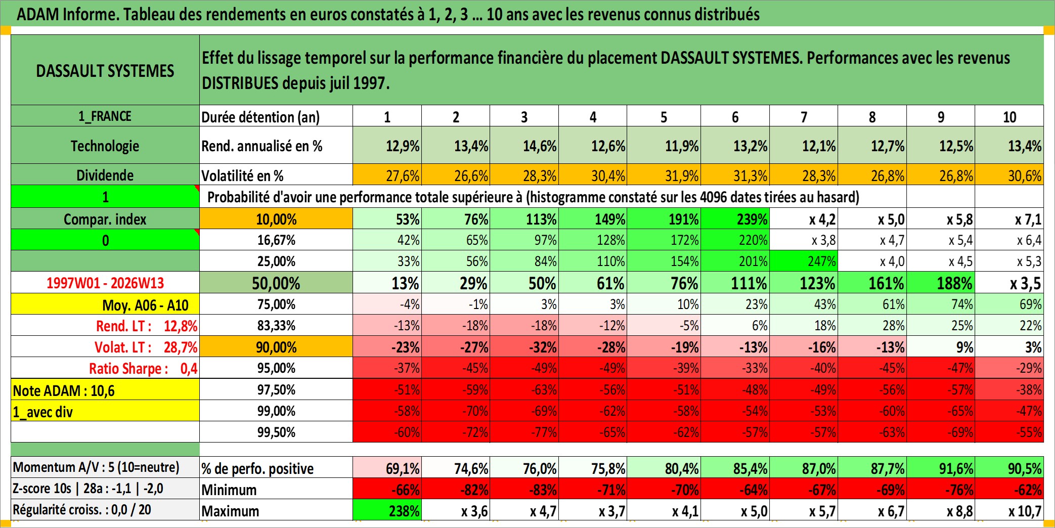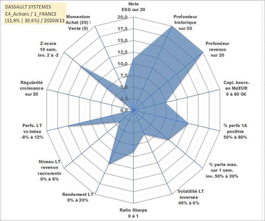 Site dédié aux investisseursPage dédiée sur site financeAnalyse des valorisations hebdomadaires de l'action DASSAULT SYSTEMES. Cet actif est cote en EUR. Les valorisations couvrent les semaines 1997W01 a 2026W13. Les revenus de cet actif financier sont pris en compte depuis la semaine 1997W27. La note globale ESG de cet actif est estimee a 11.0 (apres rebasage entre 0 et 20).