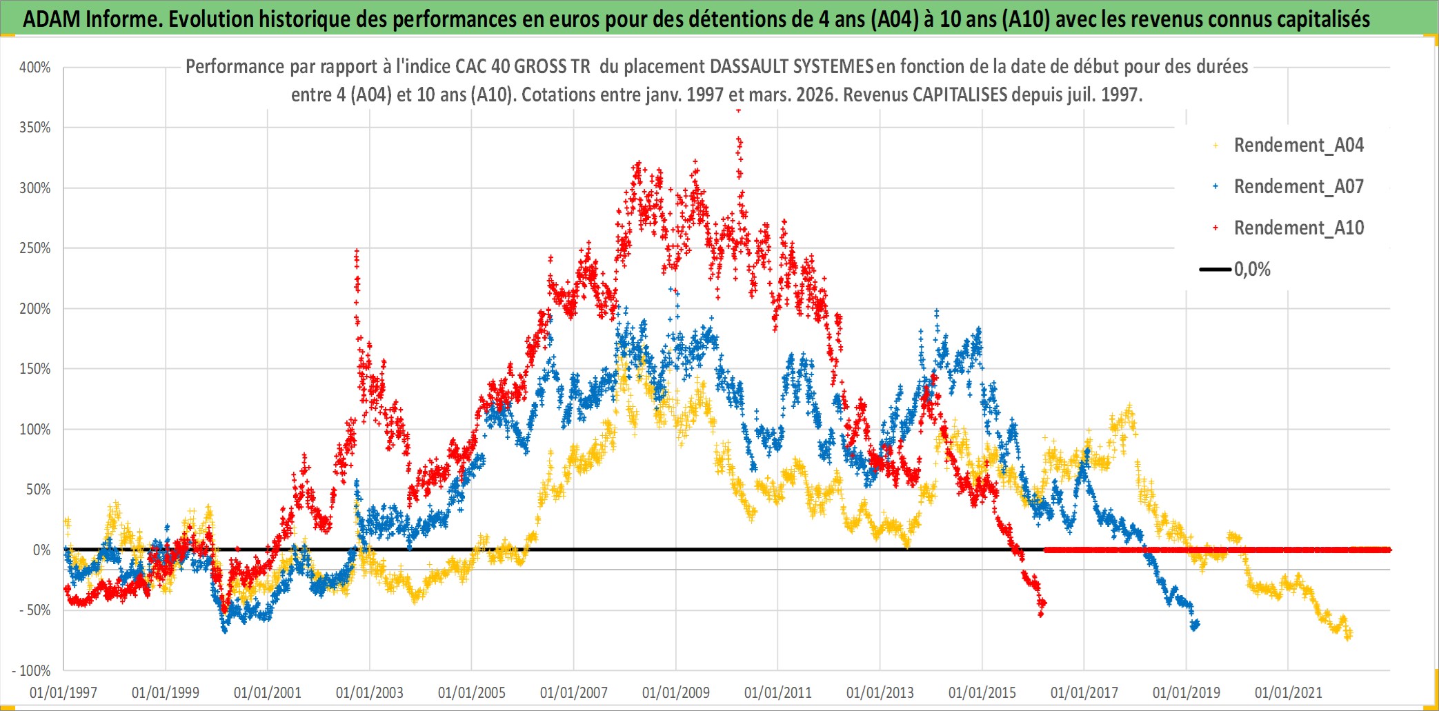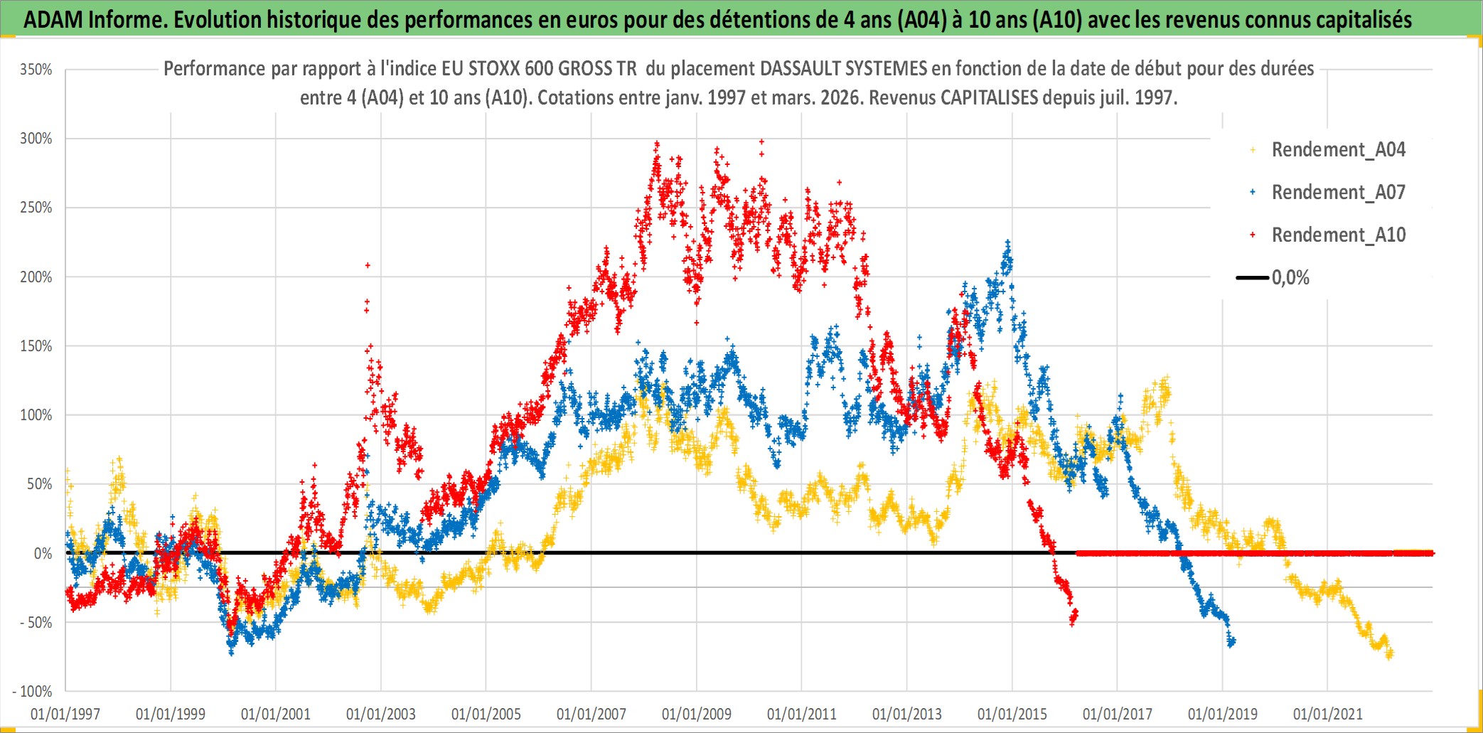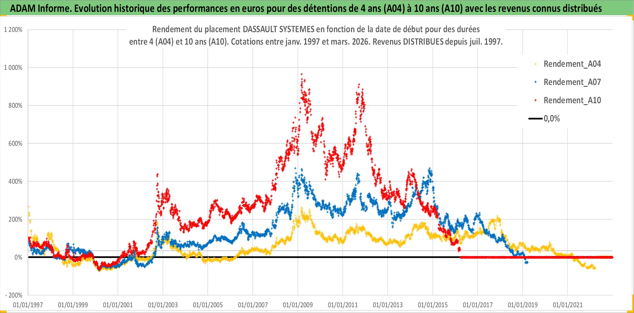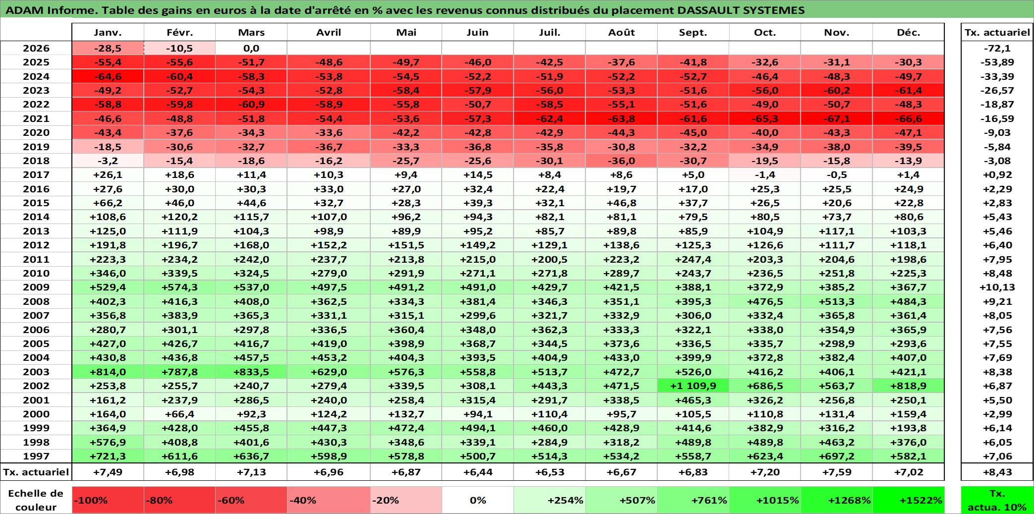 Site dédié aux investisseursPage dédiée sur site financeAnalyse des valorisations hebdomadaires de l'action DASSAULT SYSTEMES. Cet actif est cote en EUR. Les valorisations couvrent les semaines 1997W01 a 2026W13. Les revenus de cet actif financier sont pris en compte depuis la semaine 1997W27. La note globale ESG de cet actif est estimee a 11.0 (apres rebasage entre 0 et 20).