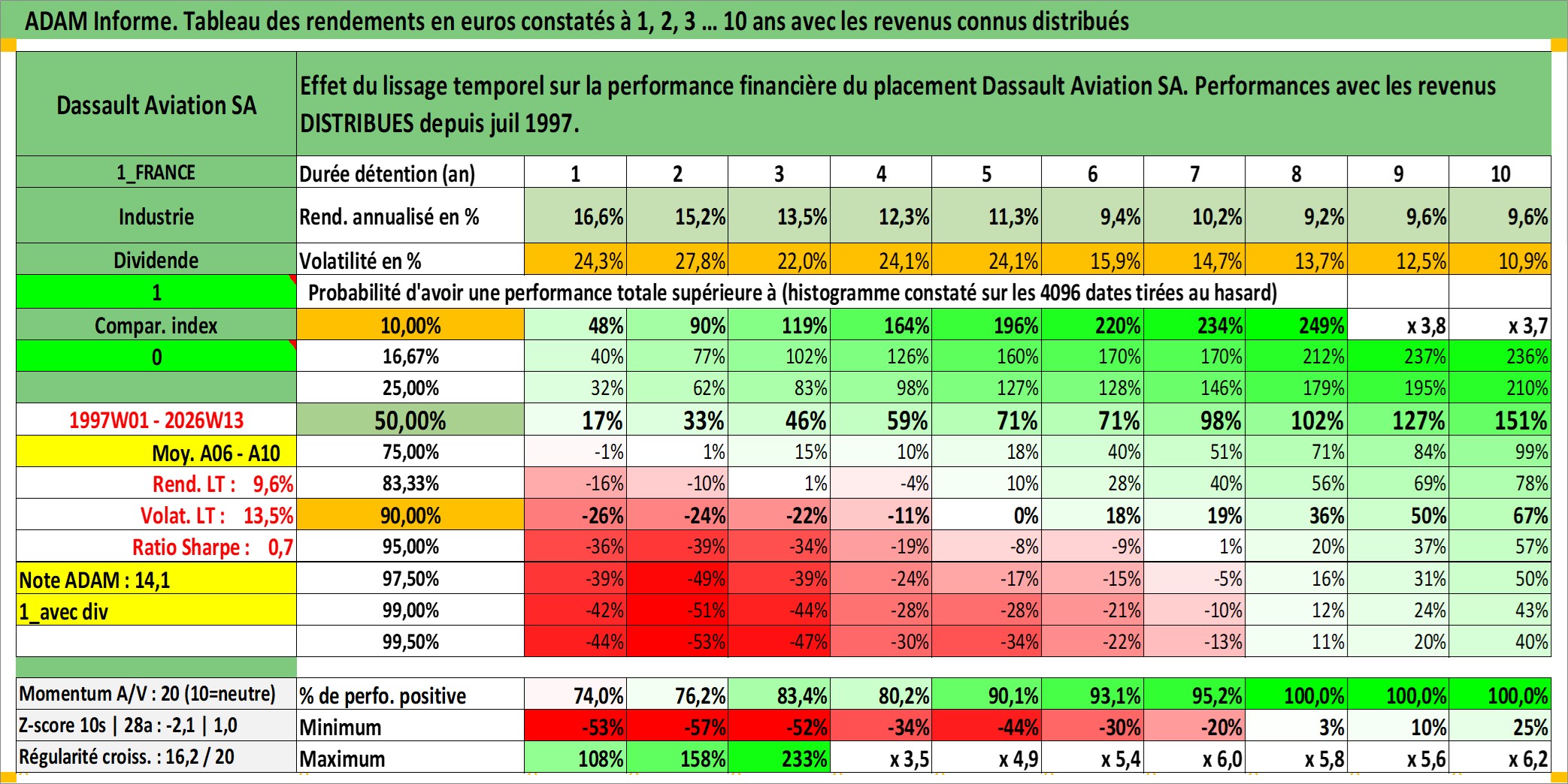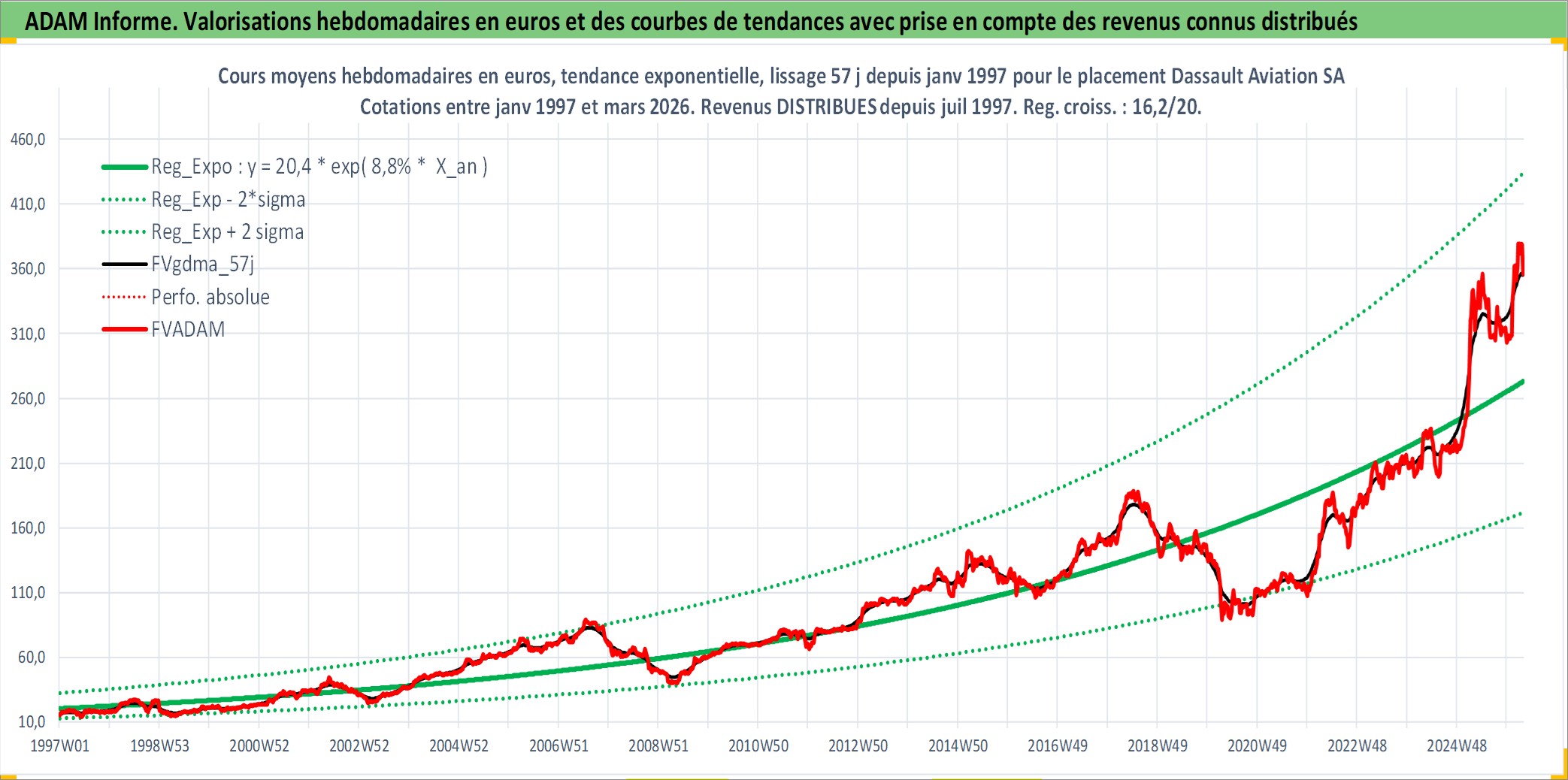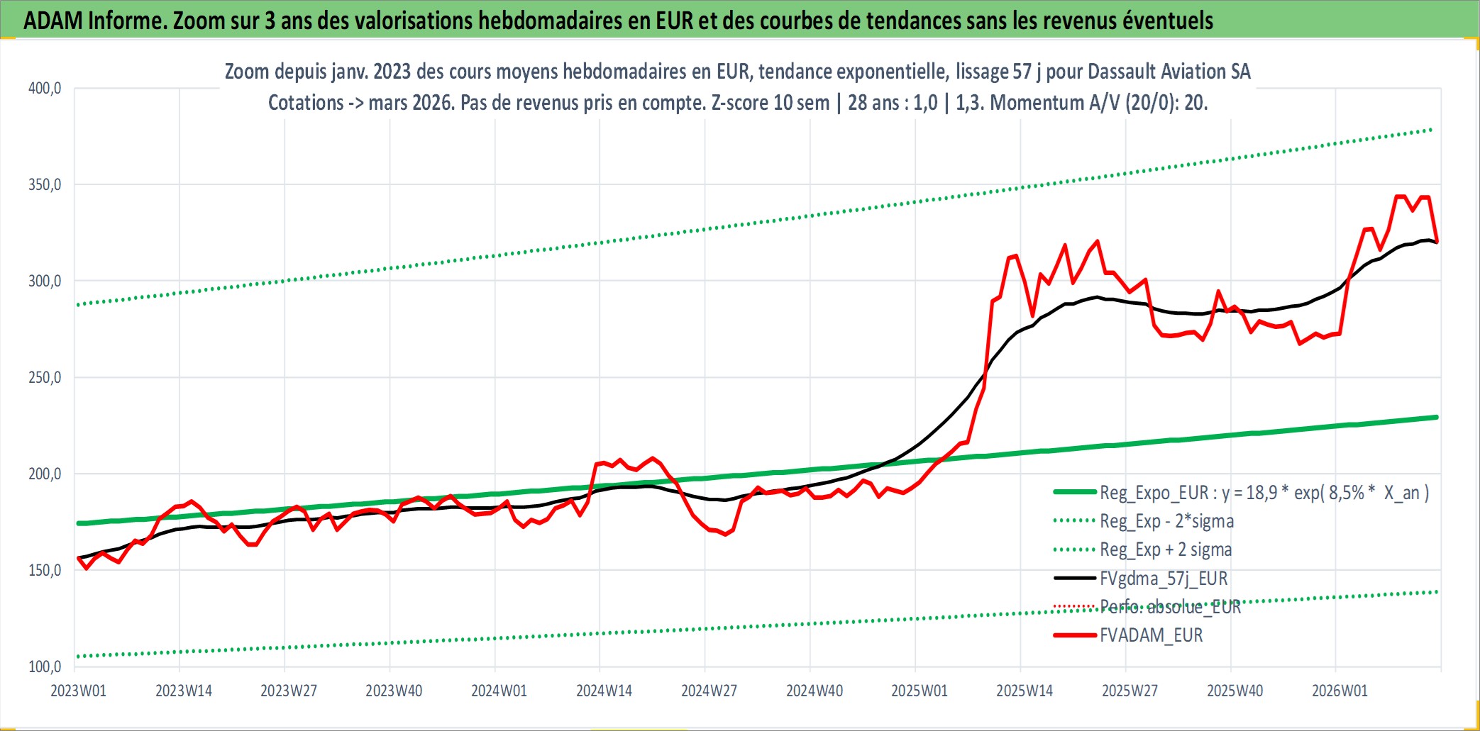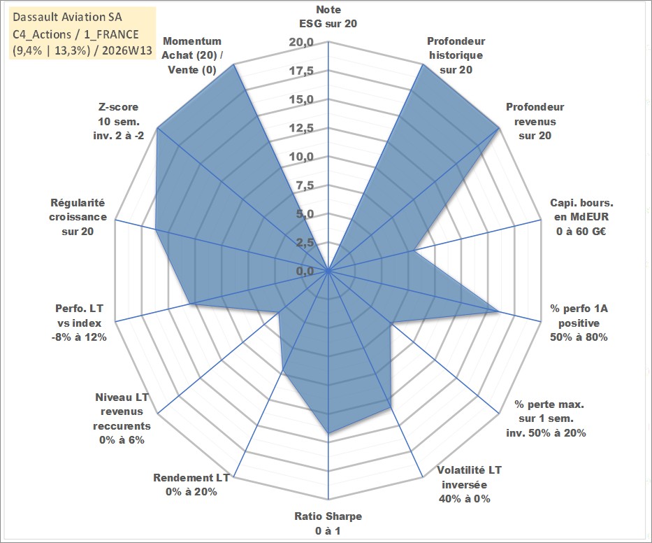 Site dédié aux investisseursPage dédiée sur site financeAnalyse des valorisations hebdomadaires de l'action Dassault Aviation SA. Cet actif est cote en EUR. Les valorisations couvrent les semaines 1997W01 a 2026W13. Les revenus de cet actif financier sont pris en compte depuis la semaine 1997W27. La note ESG de cet actif n'est pas connue.