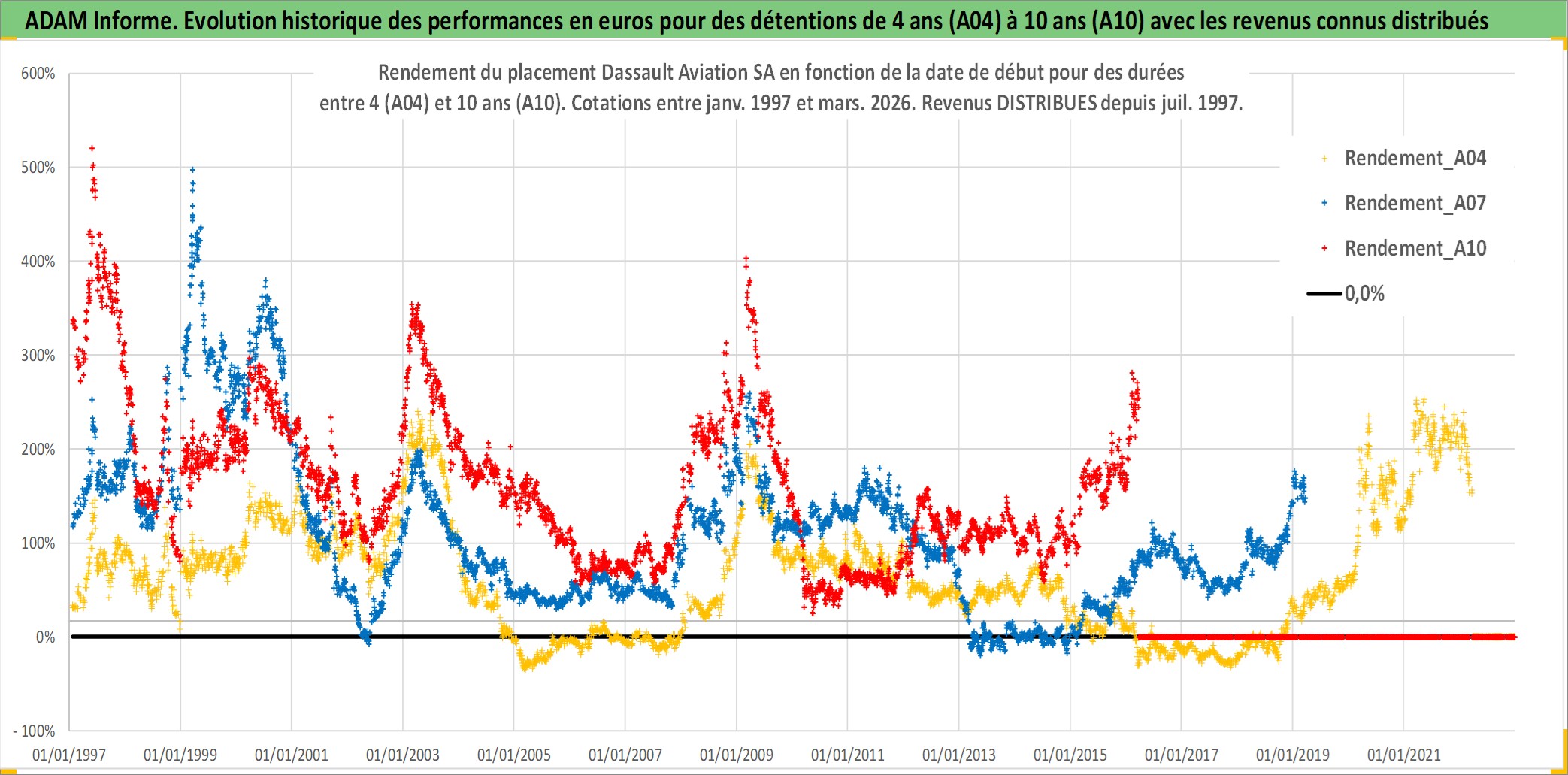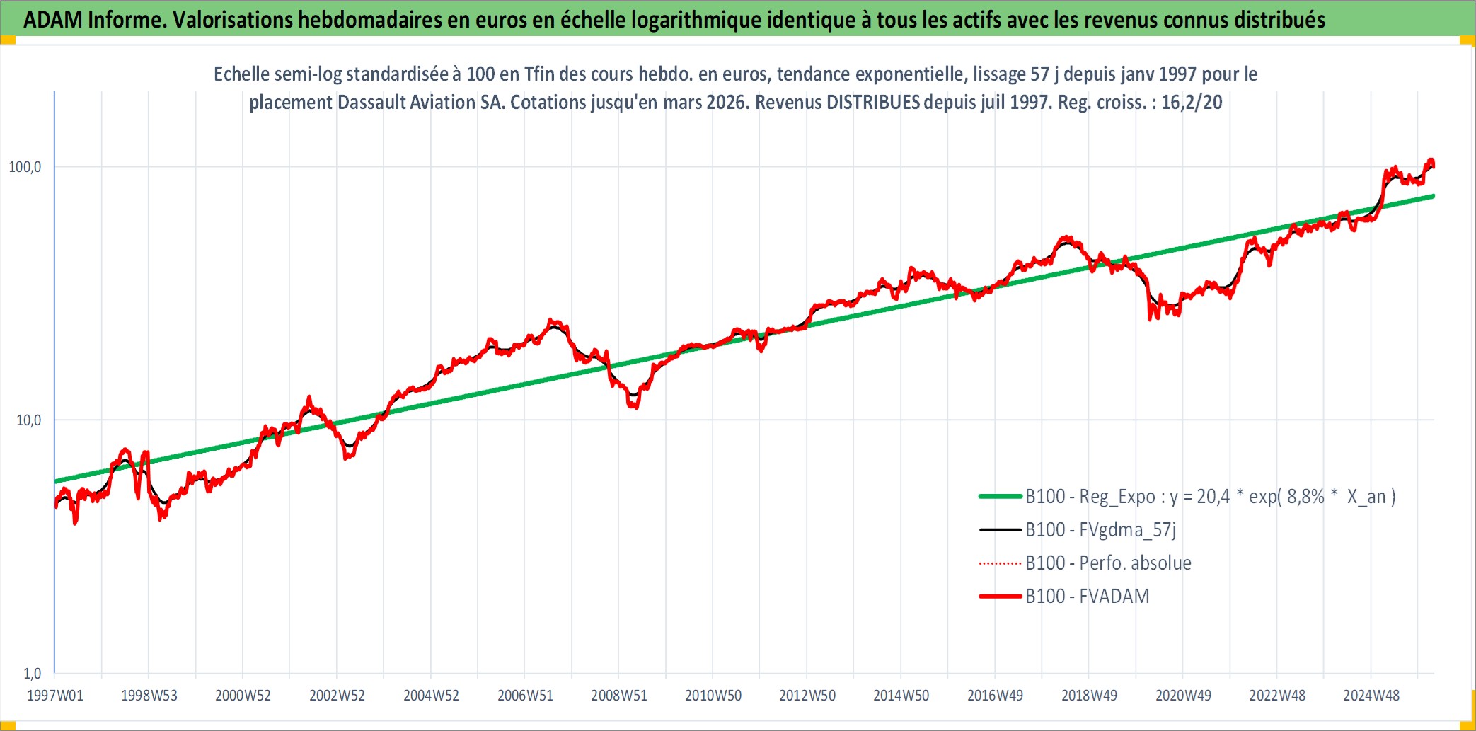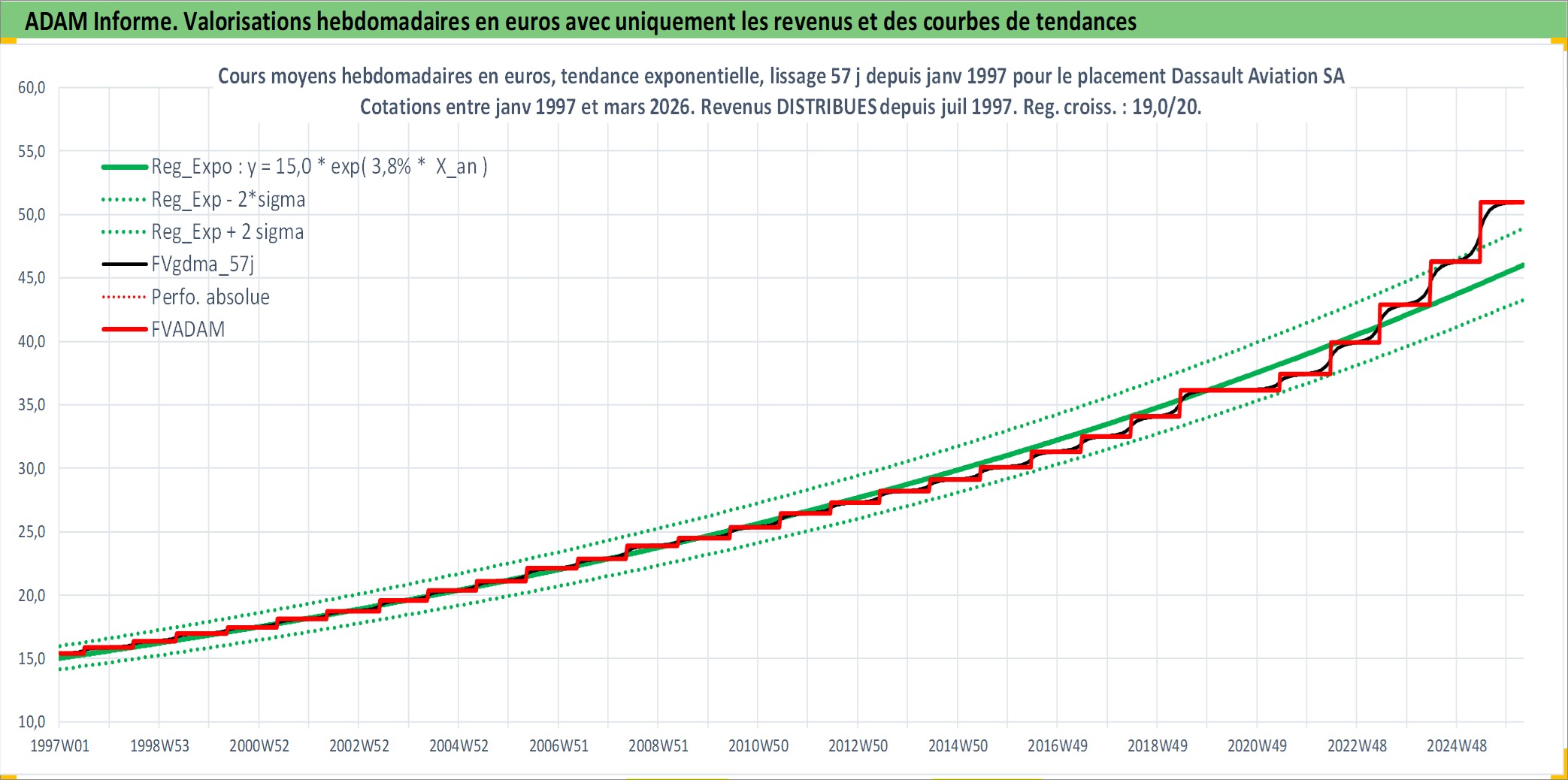 Site dédié aux investisseursPage dédiée sur site financeAnalyse des valorisations hebdomadaires de l'action Dassault Aviation SA. Cet actif est cote en EUR. Les valorisations couvrent les semaines 1997W01 a 2026W13. Les revenus de cet actif financier sont pris en compte depuis la semaine 1997W27. La note ESG de cet actif n'est pas connue.