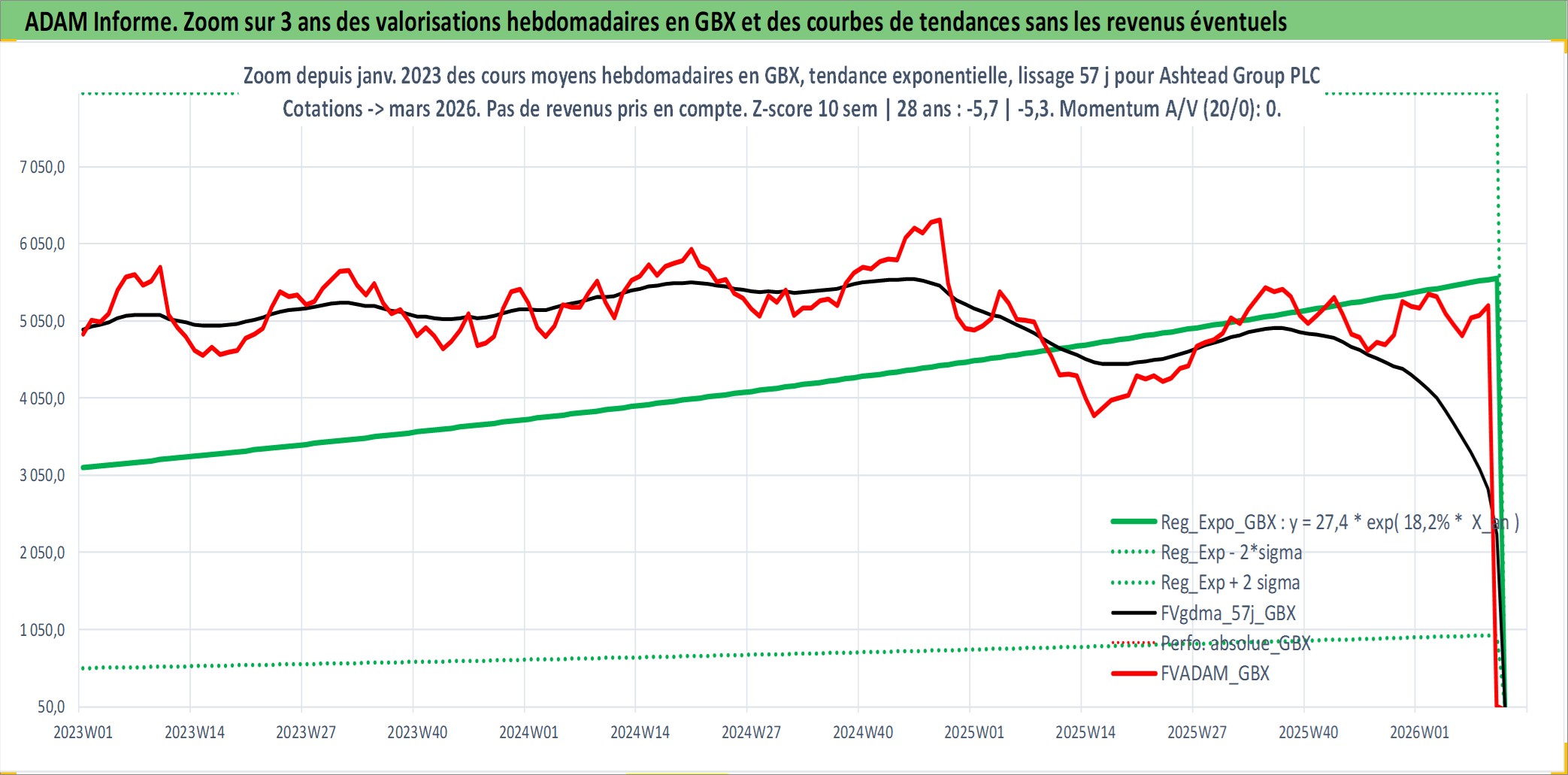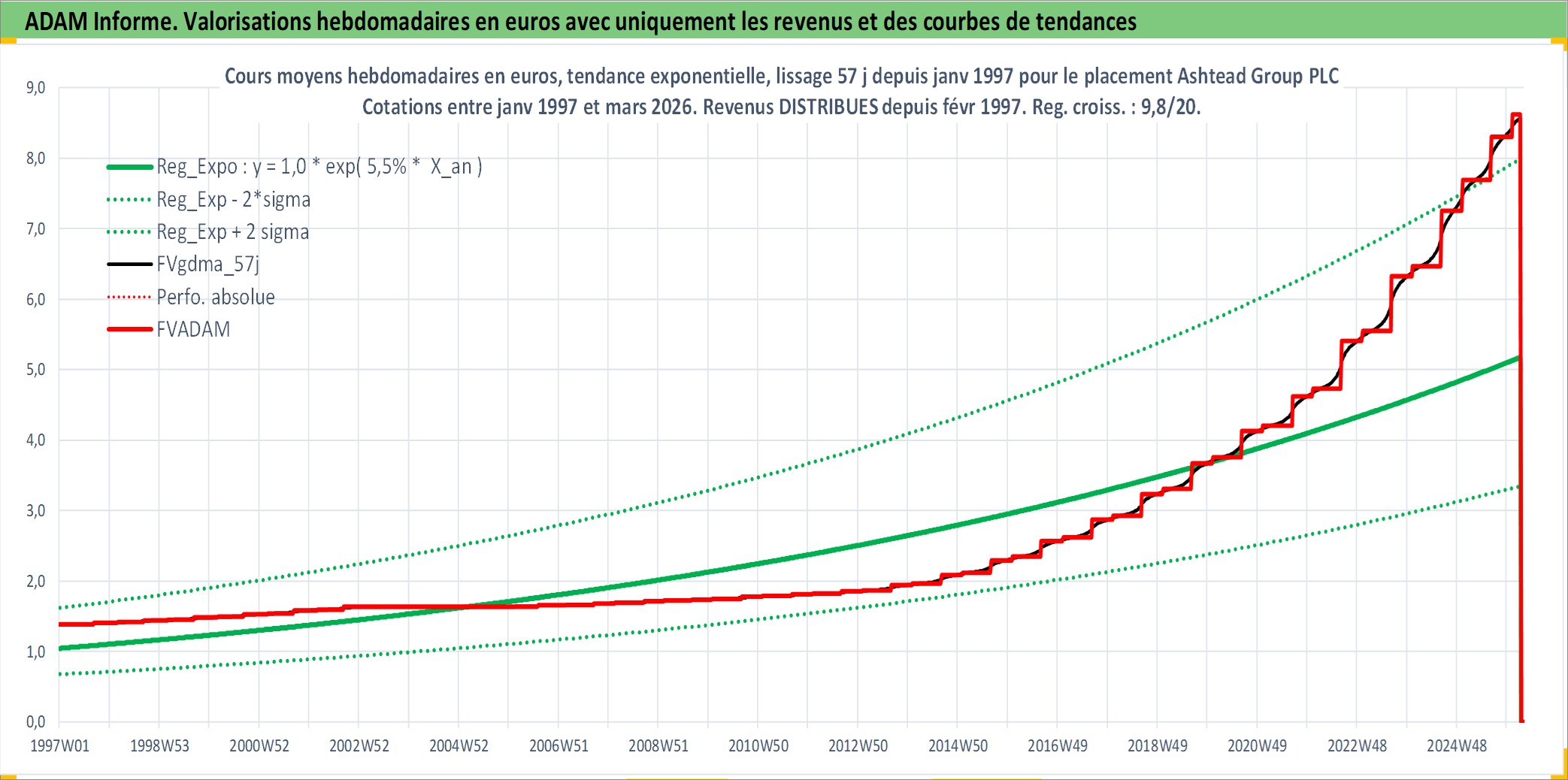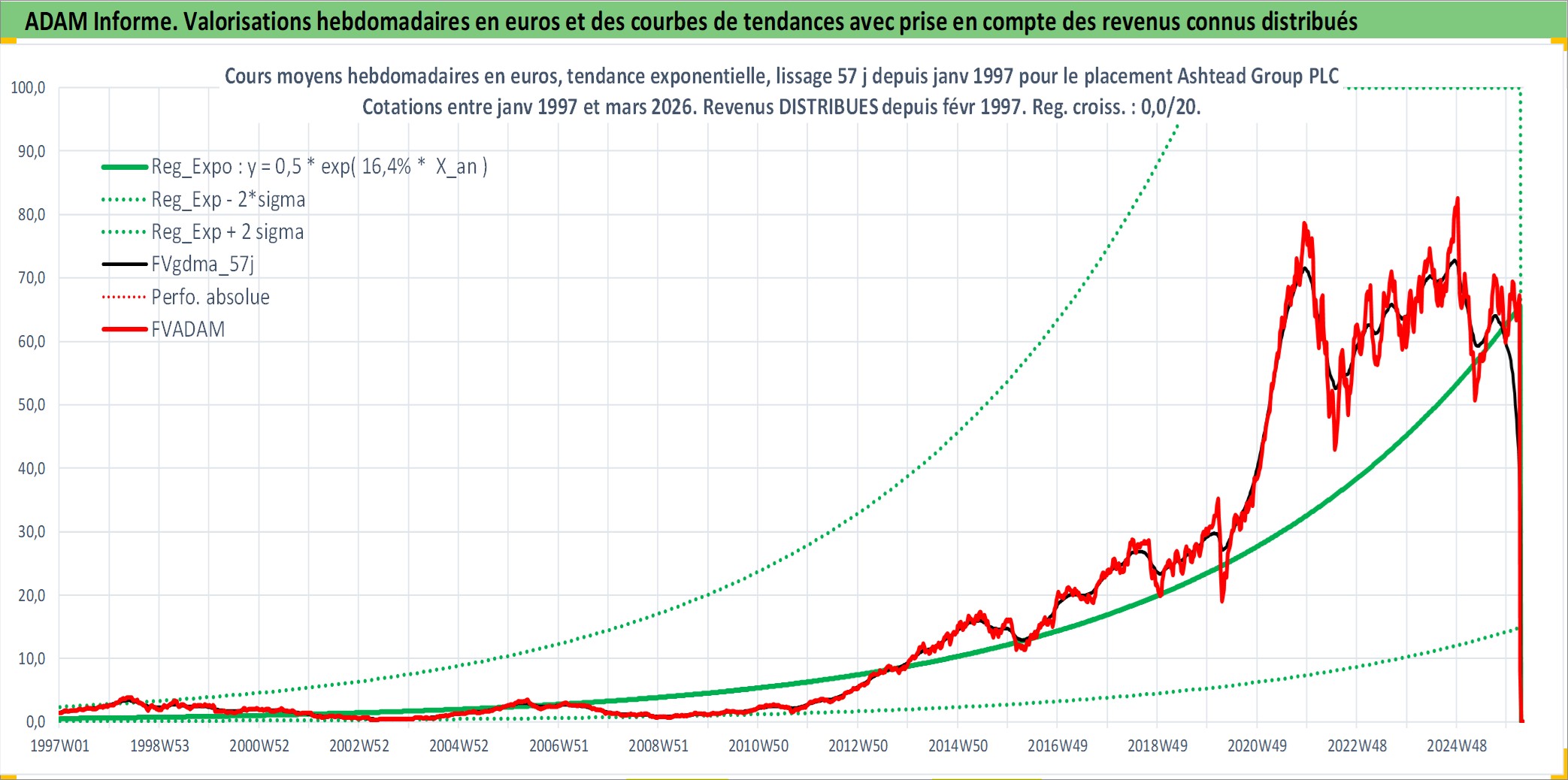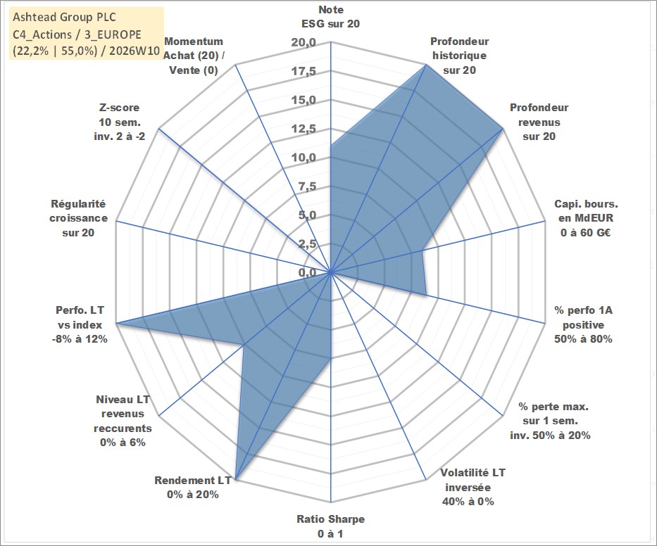 Site dédié aux investisseursPage dédiée sur site financeAnalyse des valorisations hebdomadaires de l'action Ashtead Group PLC. Cet actif est cote en GBX. Les valorisations sont en contrevaleur EURO et couvrent les semaines 1997W01 a 2026W10. Les revenus de cet actif financier sont pris en compte depuis la semaine 1997W09. La note globale ESG de cet actif est estimee a 11.0 (apres rebasage entre 0 et 20).