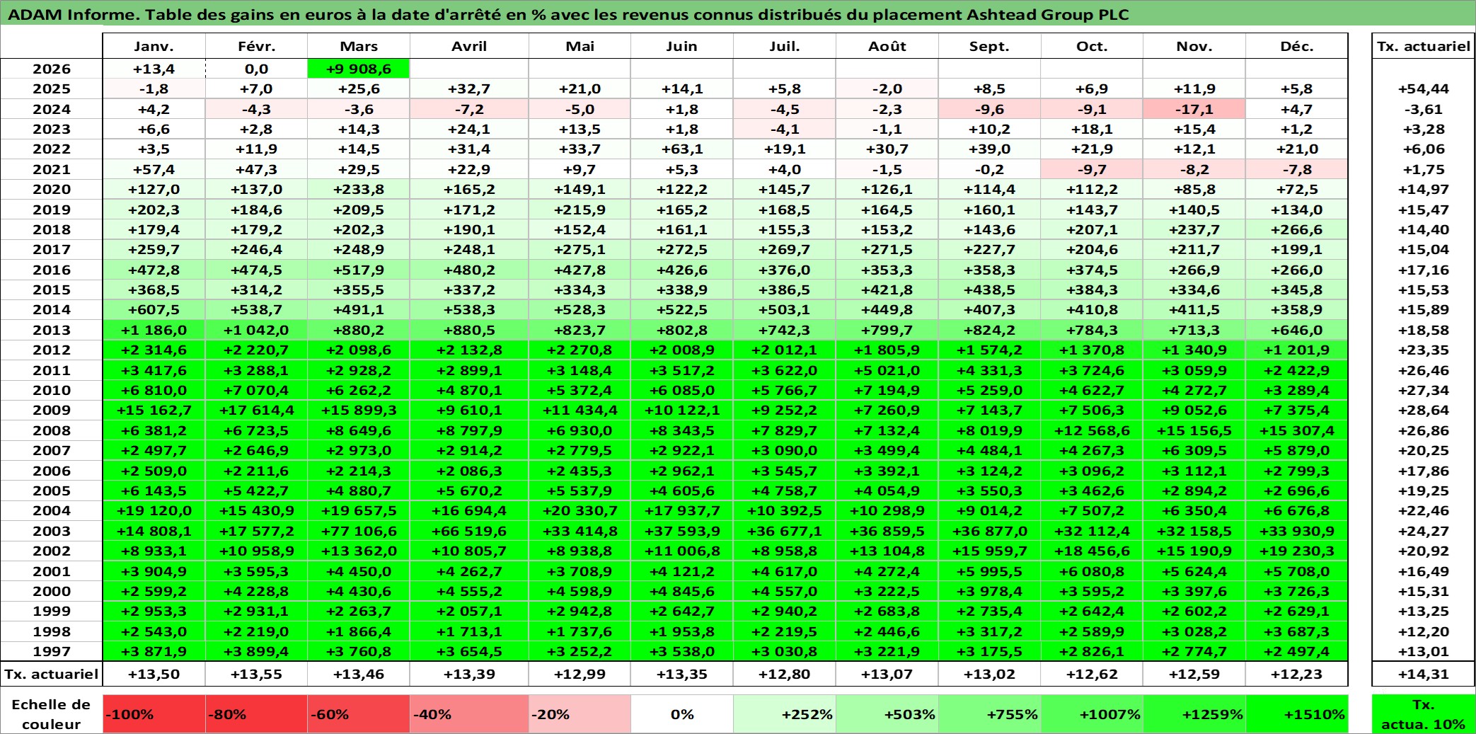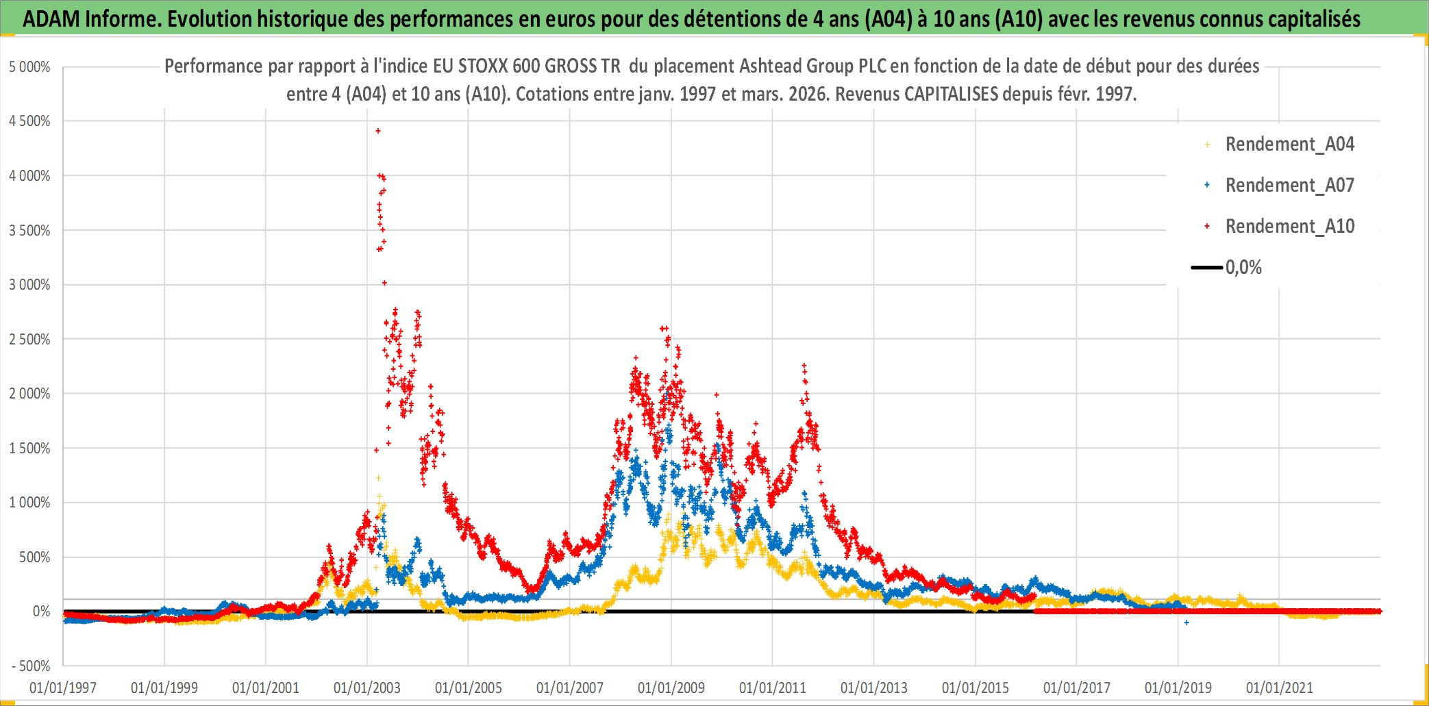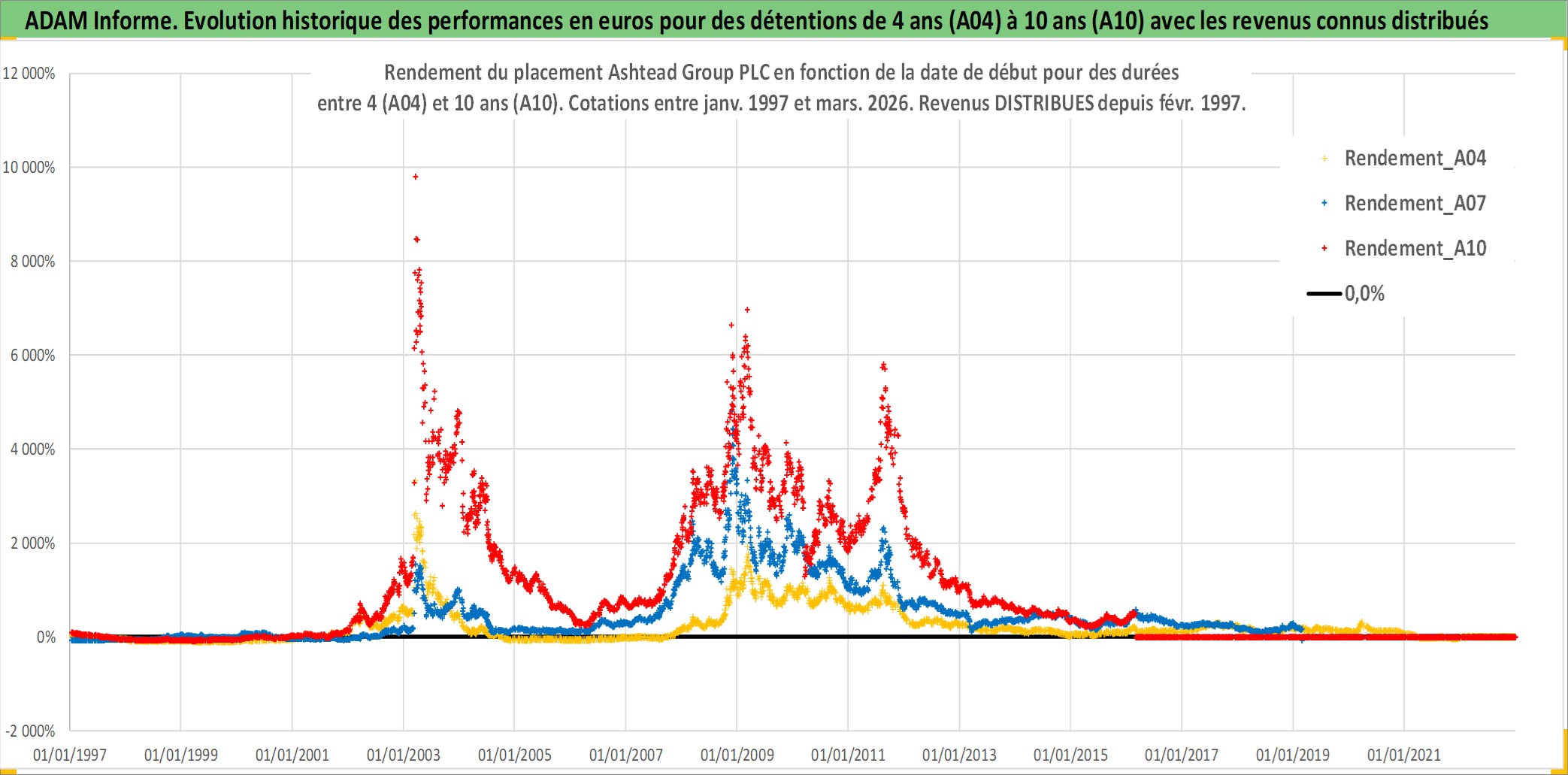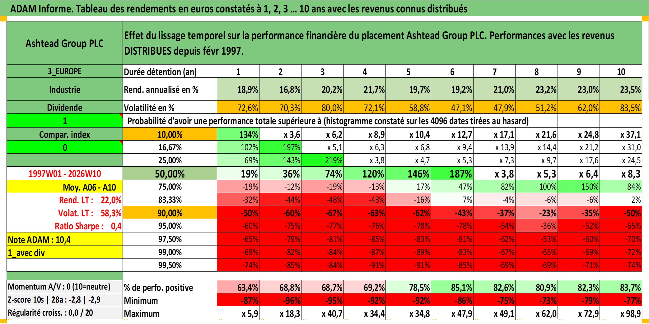 Site dédié aux investisseursPage dédiée sur site financeAnalyse des valorisations hebdomadaires de l'action Ashtead Group PLC. Cet actif est cote en GBX. Les valorisations sont en contrevaleur EURO et couvrent les semaines 1997W01 a 2026W10. Les revenus de cet actif financier sont pris en compte depuis la semaine 1997W09. La note globale ESG de cet actif est estimee a 11.0 (apres rebasage entre 0 et 20).