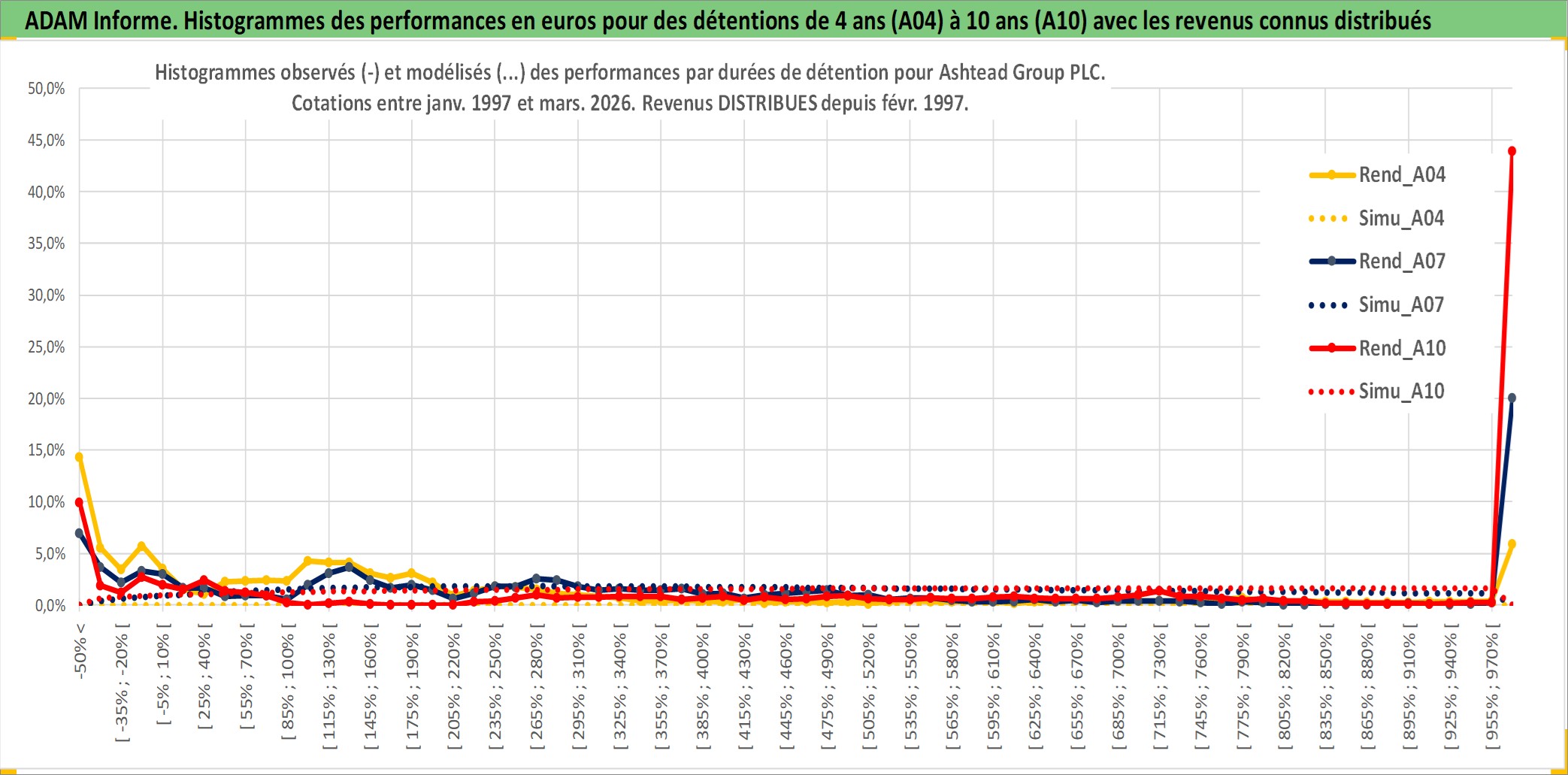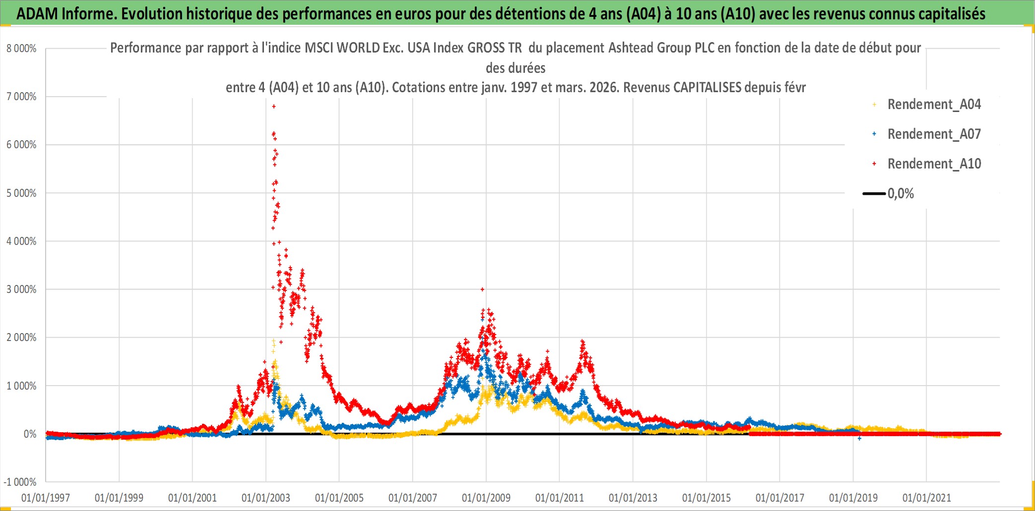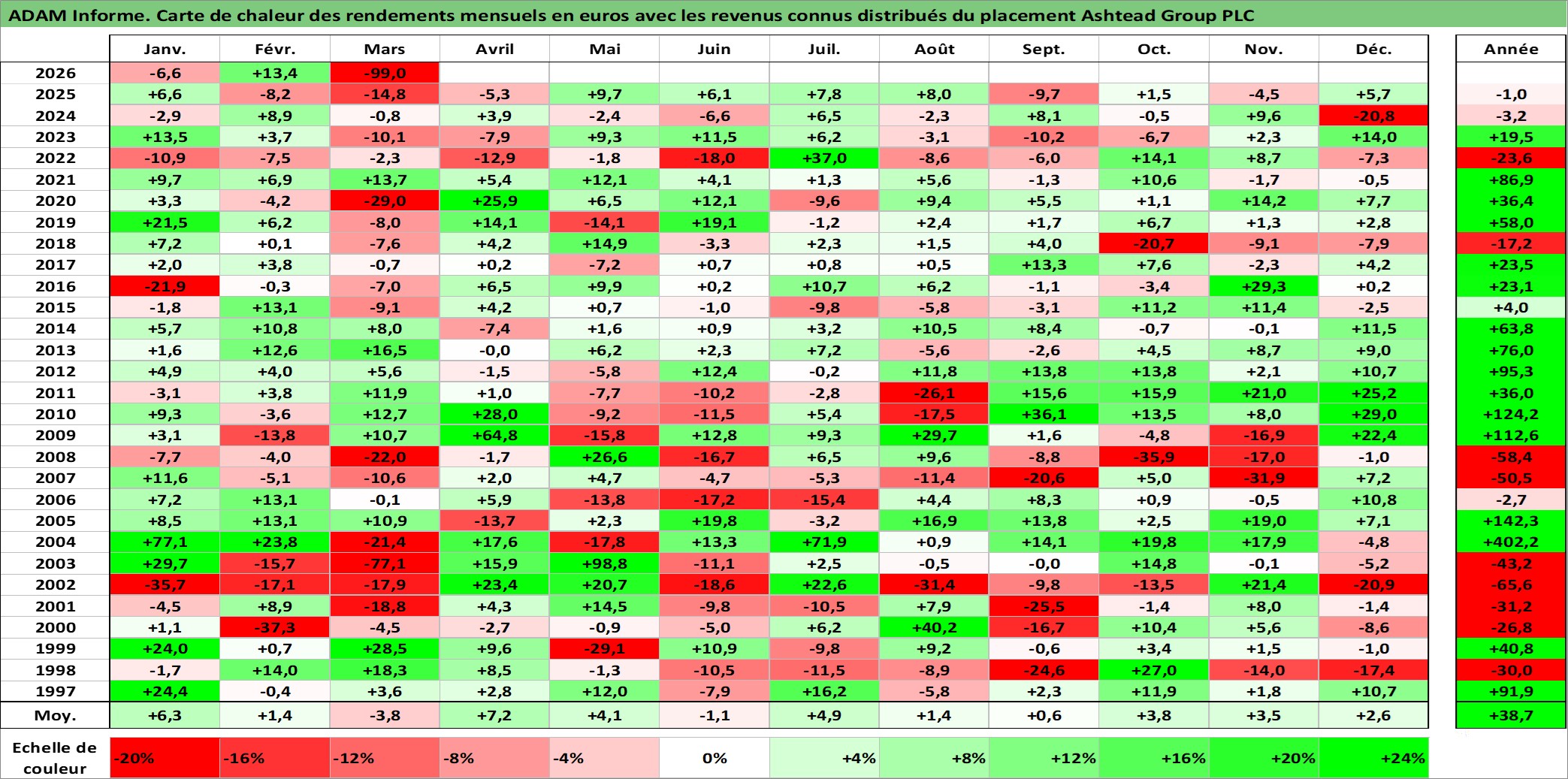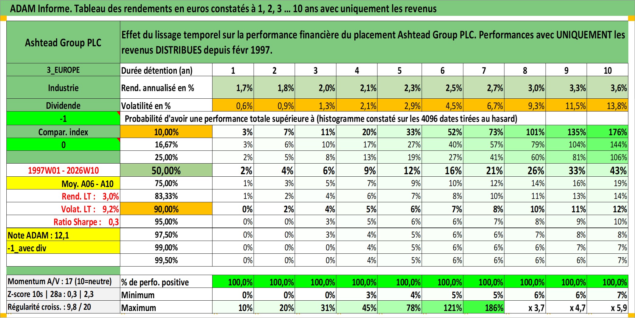 Site dédié aux investisseursPage dédiée sur site financeAnalyse des valorisations hebdomadaires de l'action Ashtead Group PLC. Cet actif est cote en GBX. Les valorisations sont en contrevaleur EURO et couvrent les semaines 1997W01 a 2026W10. Les revenus de cet actif financier sont pris en compte depuis la semaine 1997W09. La note globale ESG de cet actif est estimee a 11.0 (apres rebasage entre 0 et 20).