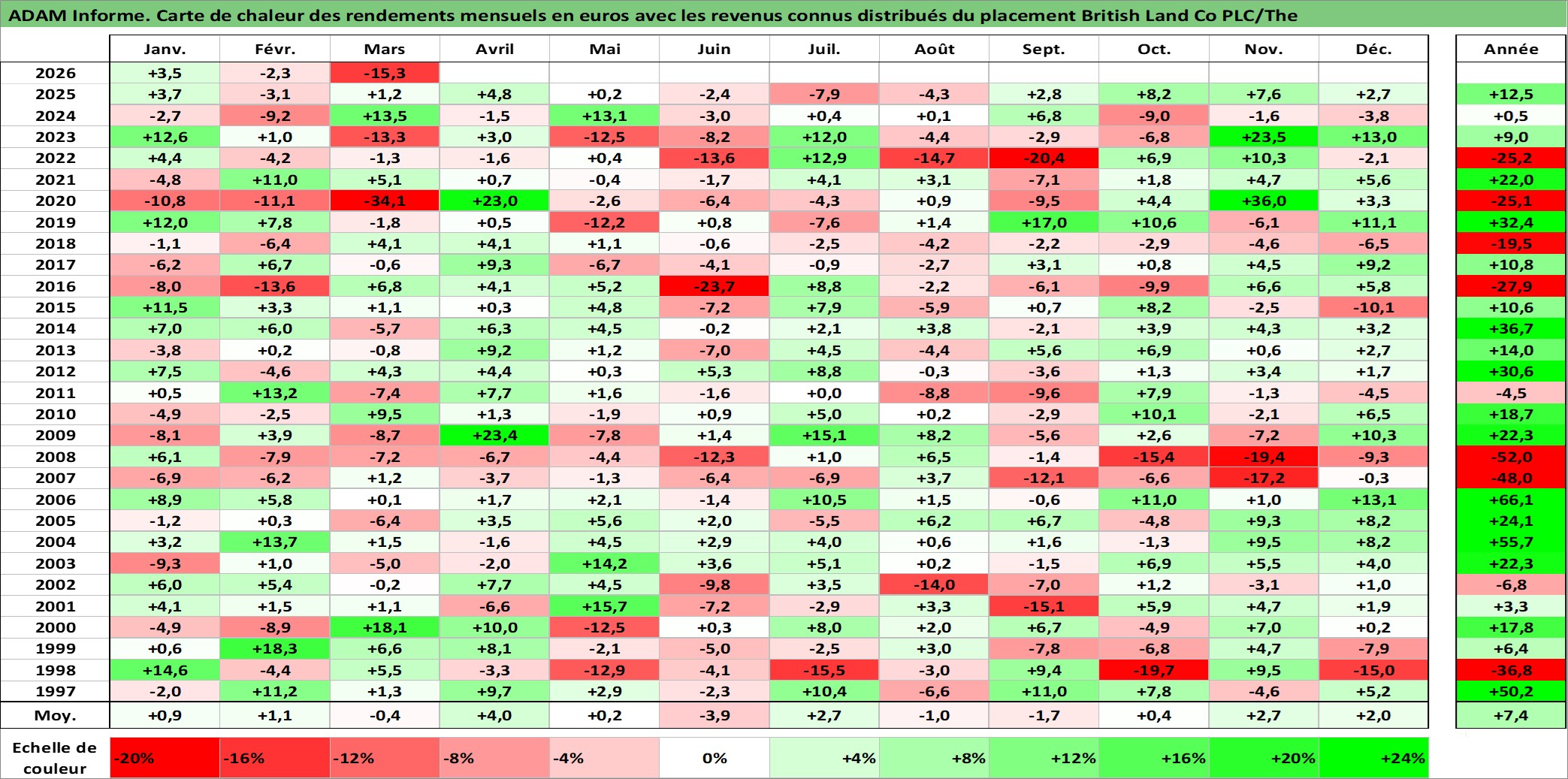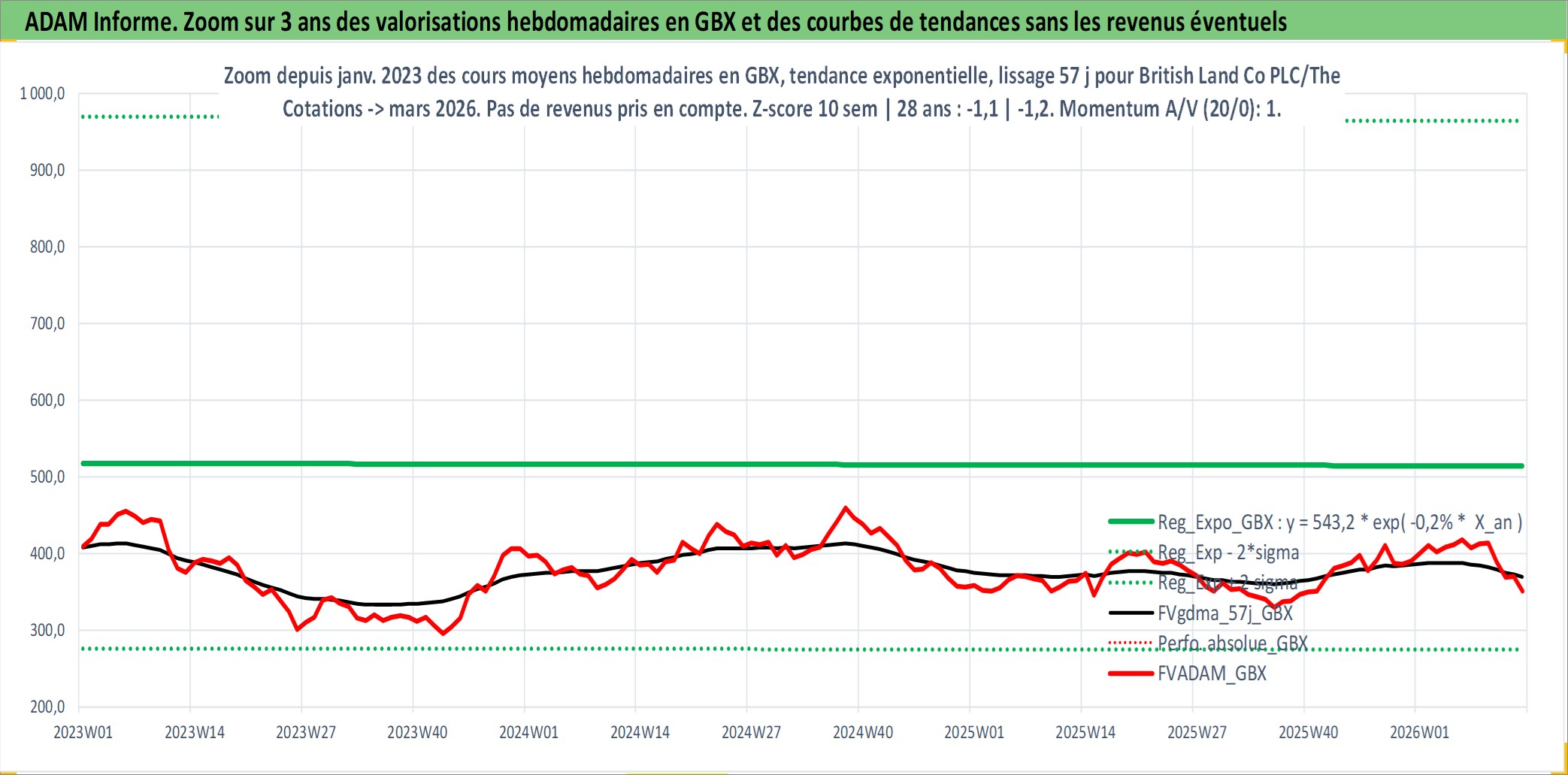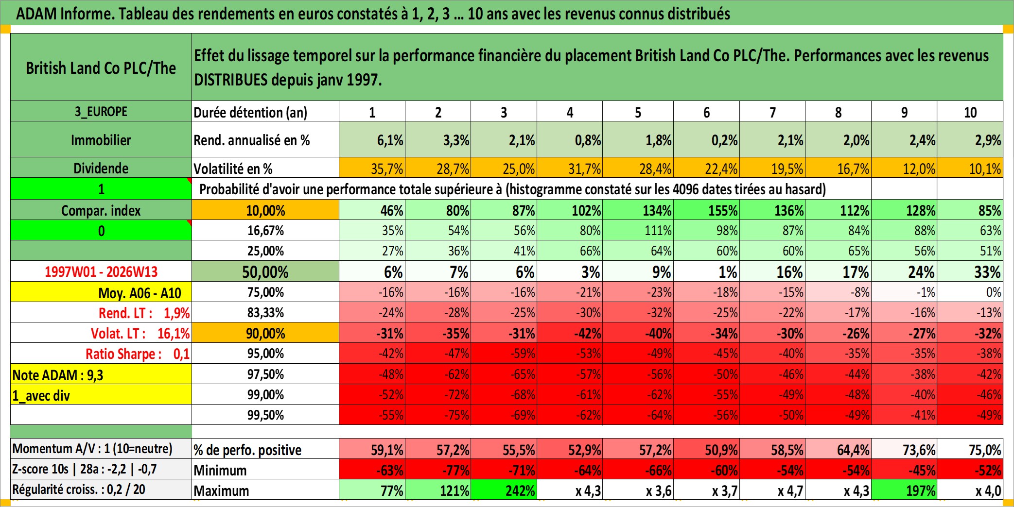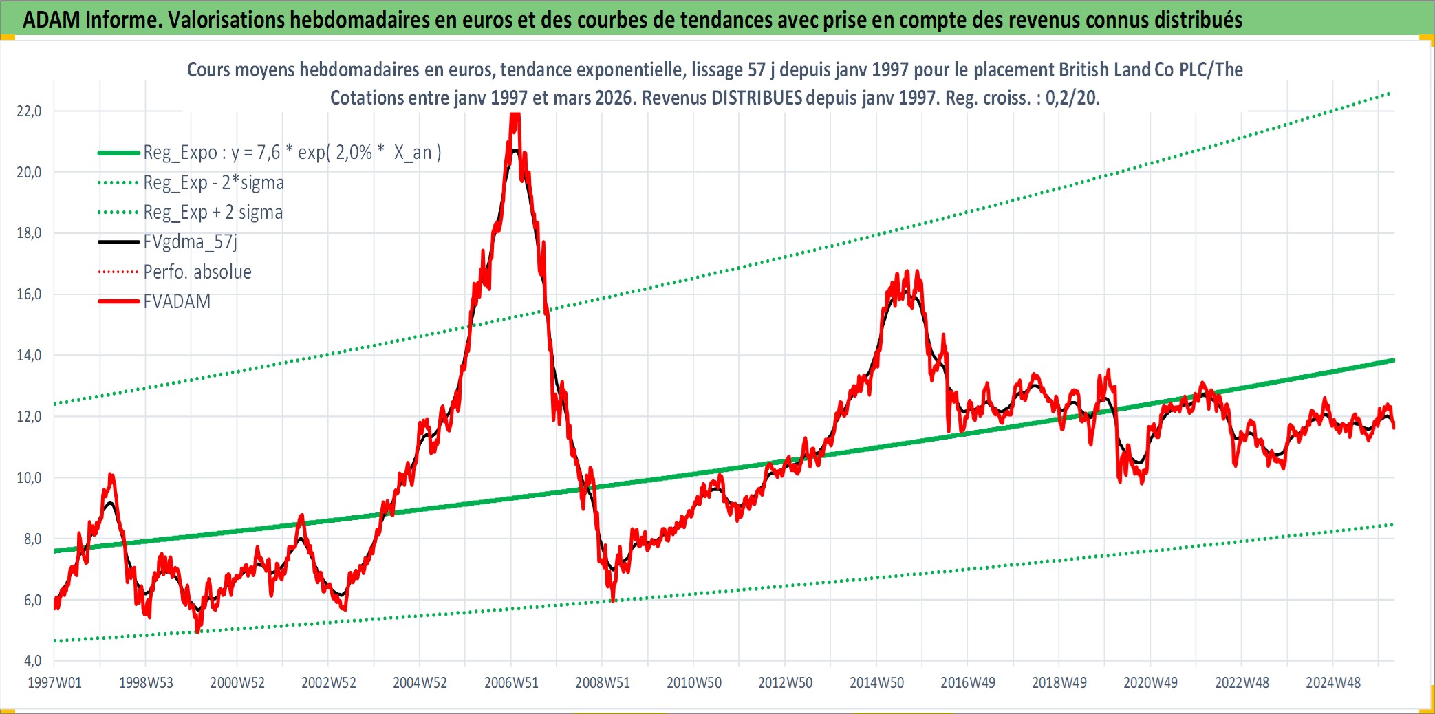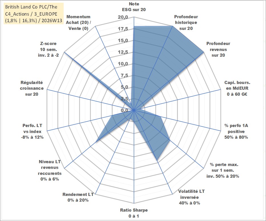 Site dédié aux investisseursPage dédiée sur site financeAnalyse des valorisations hebdomadaires de l'action British Land Co PLC/The. Cet actif est cote en GBX. Les valorisations sont en contrevaleur EURO et couvrent les semaines 1997W01 a 2026W13. Les revenus de cet actif financier sont pris en compte depuis la semaine 1997W03. La note globale ESG de cet actif est estimee a 18.0 (apres rebasage entre 0 et 20).