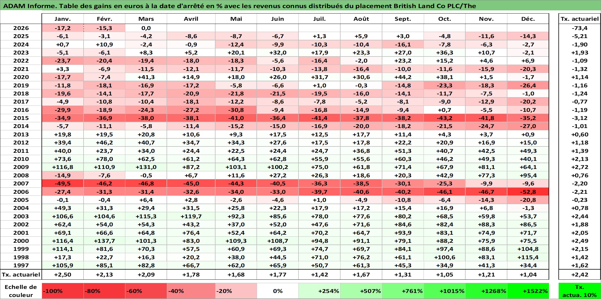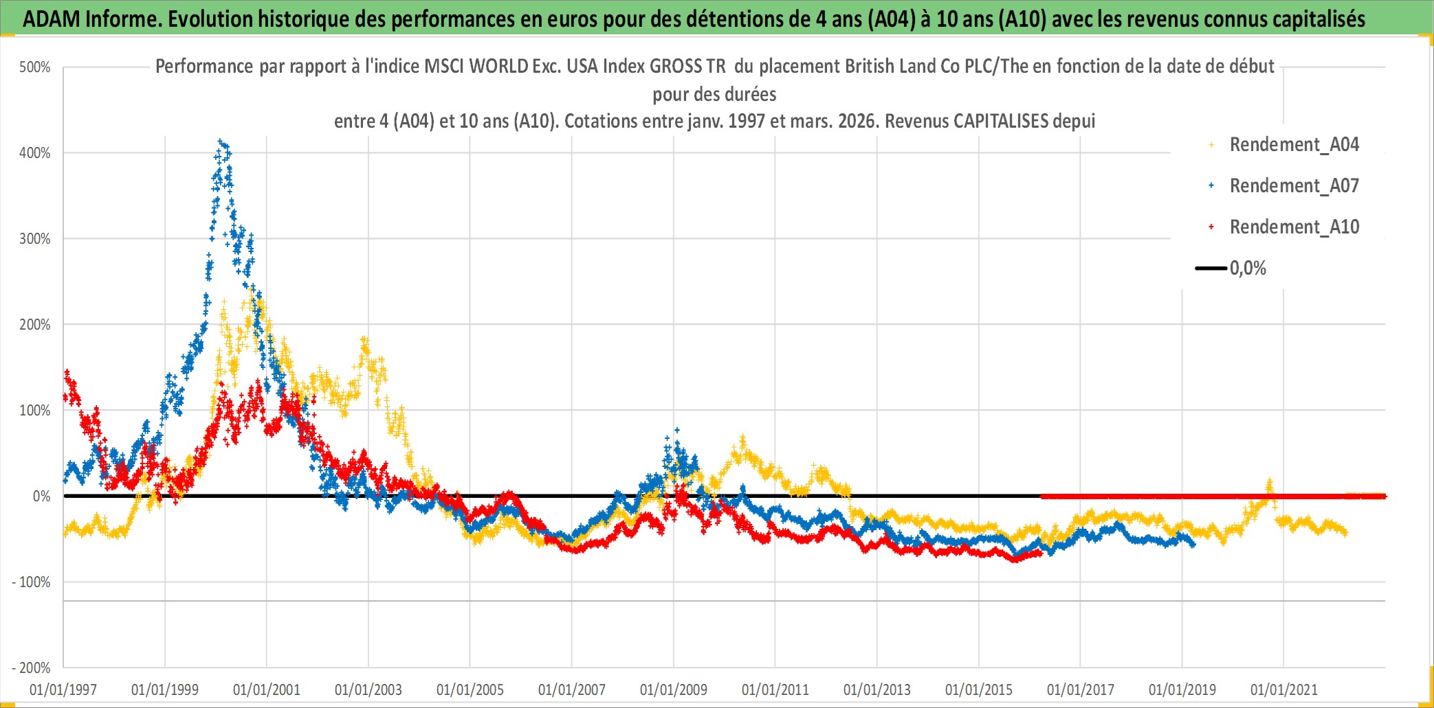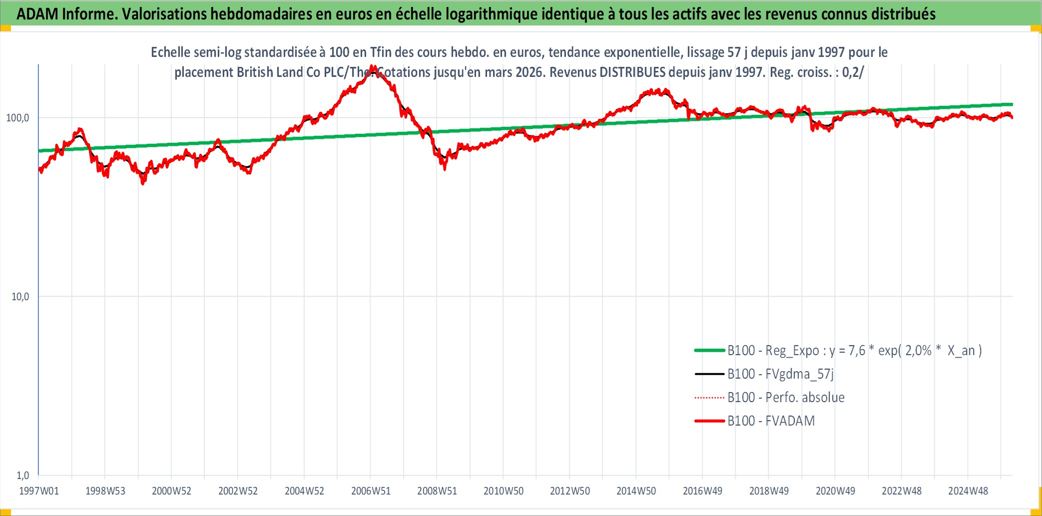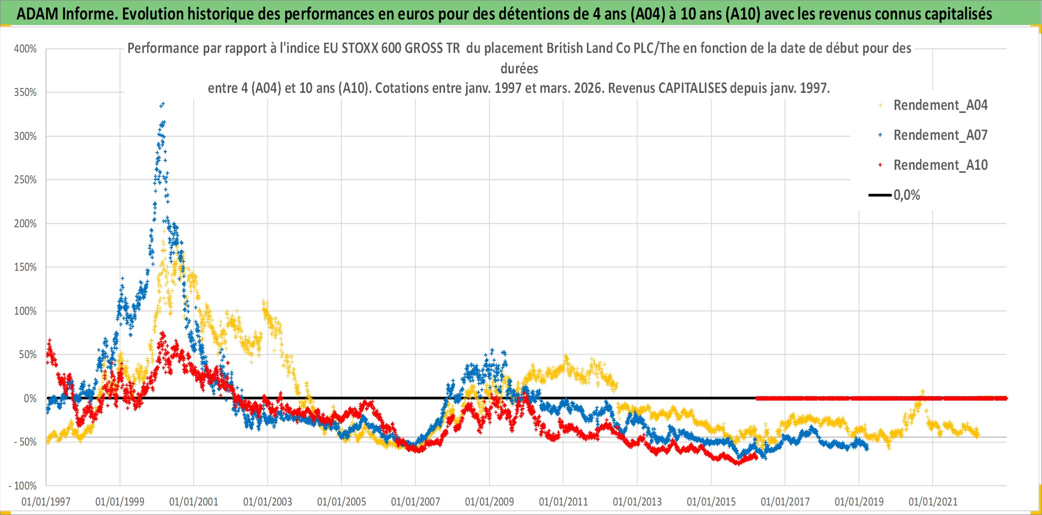 Site dédié aux investisseursPage dédiée sur site financeAnalyse des valorisations hebdomadaires de l'action British Land Co PLC/The. Cet actif est cote en GBX. Les valorisations sont en contrevaleur EURO et couvrent les semaines 1997W01 a 2026W13. Les revenus de cet actif financier sont pris en compte depuis la semaine 1997W03. La note globale ESG de cet actif est estimee a 18.0 (apres rebasage entre 0 et 20).
