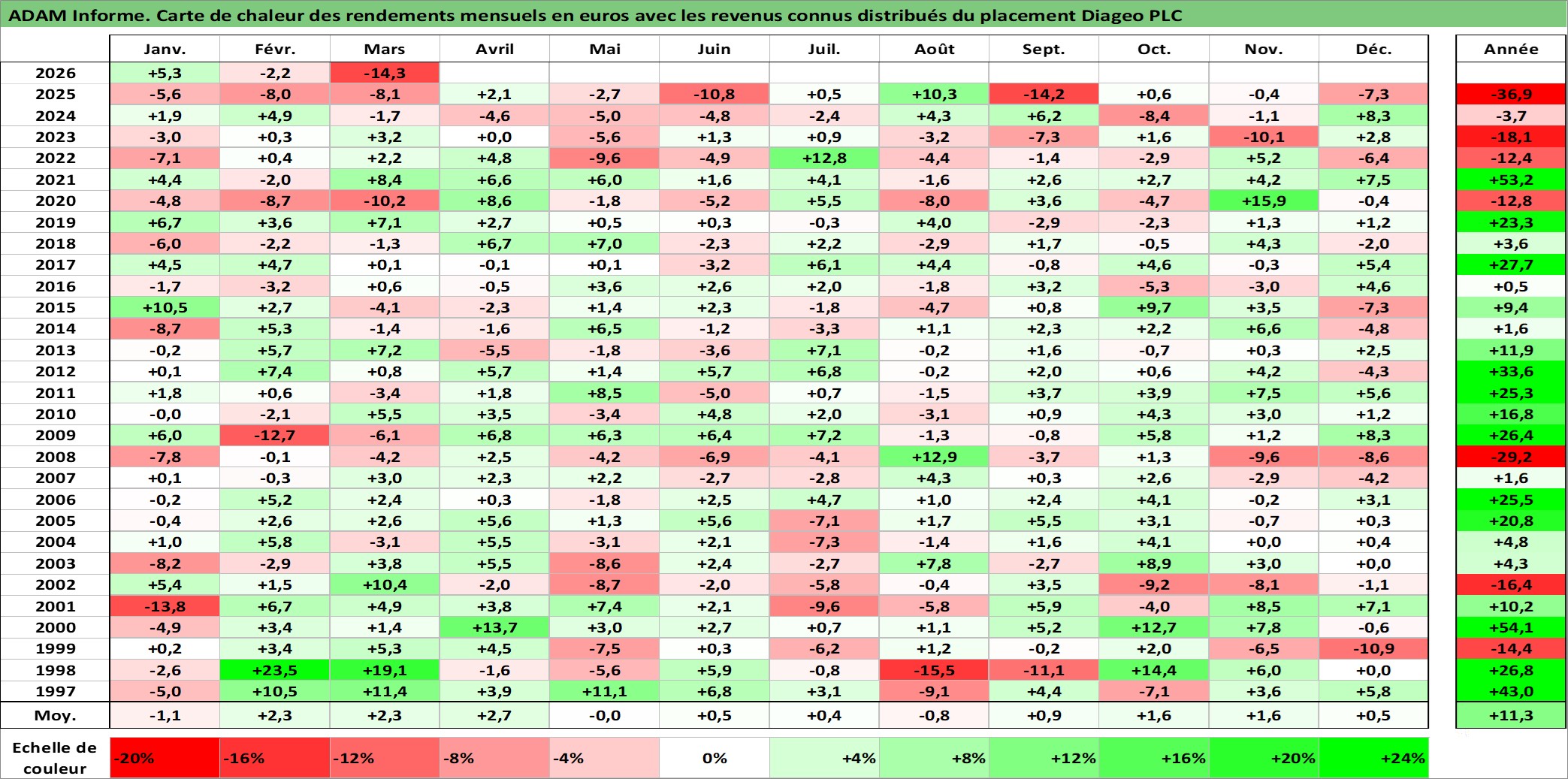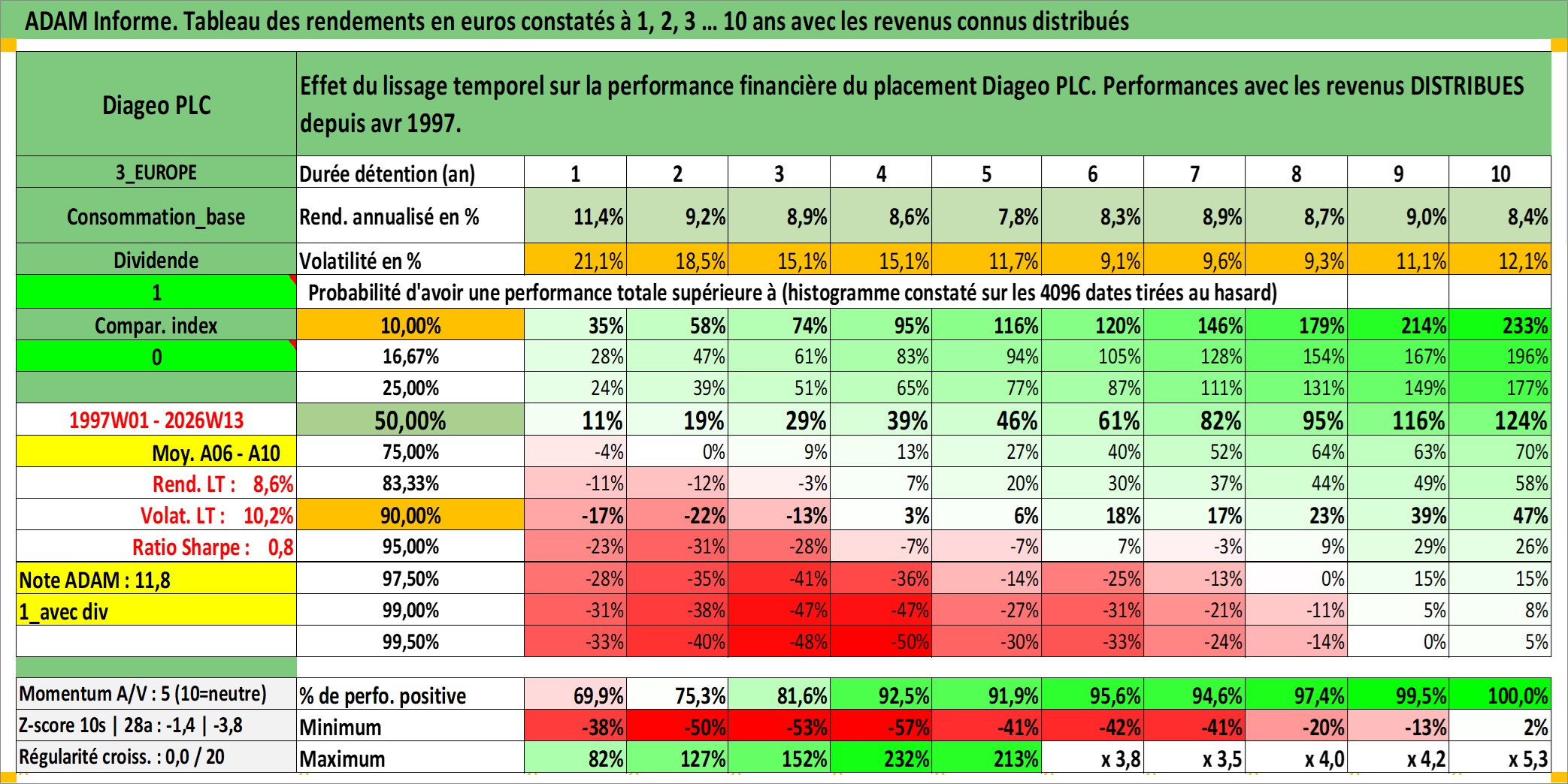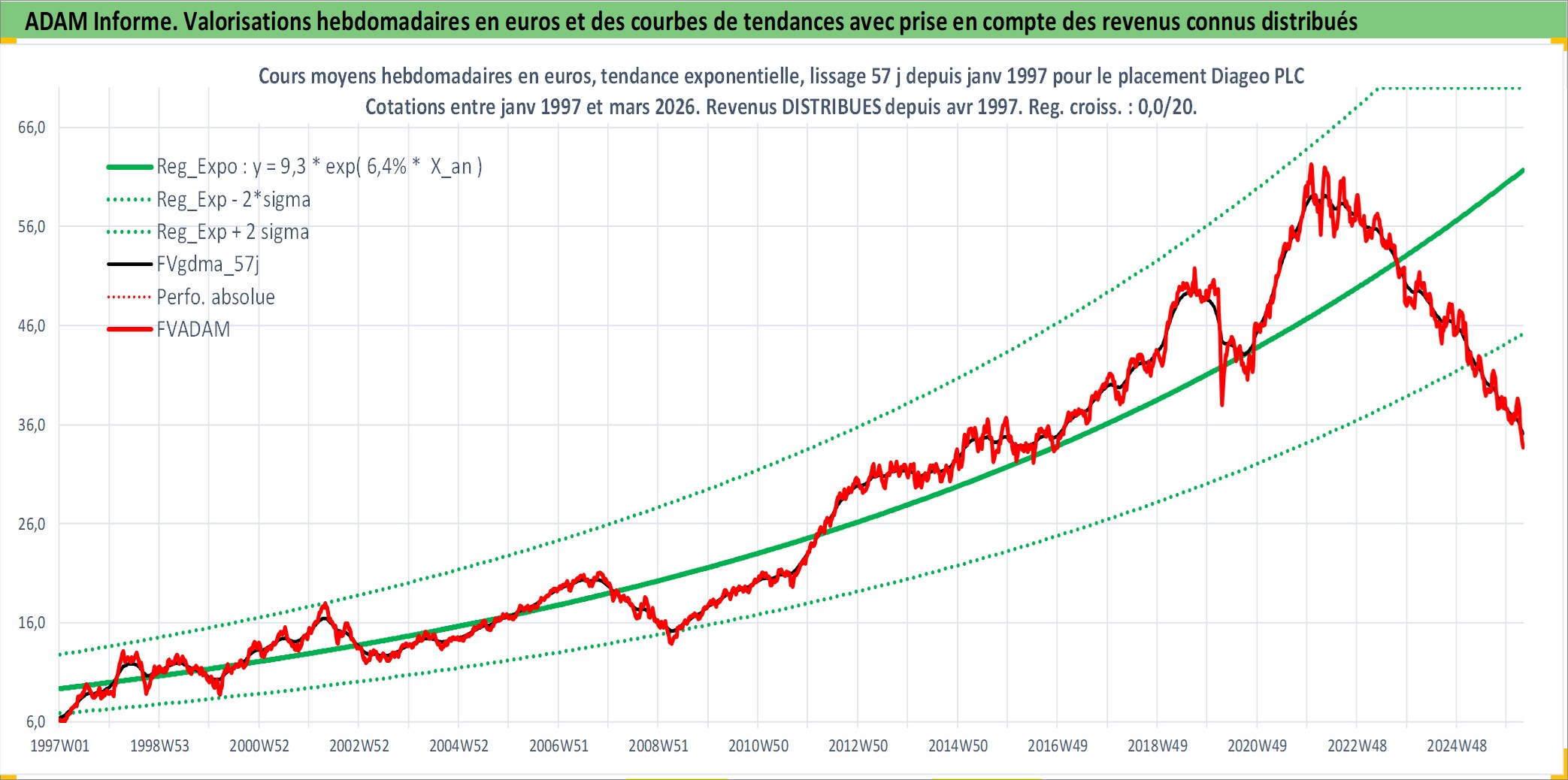 Site dédié aux investisseursPage dédiée sur site financeAnalyse des valorisations hebdomadaires de l'action Diageo PLC. Cet actif est cote en GBX. Les valorisations sont en contrevaleur EURO et couvrent les semaines 1997W01 a 2026W13. Les revenus de cet actif financier sont pris en compte depuis la semaine 1997W14. La note globale ESG de cet actif est estimee a 12.0 (apres rebasage entre 0 et 20).