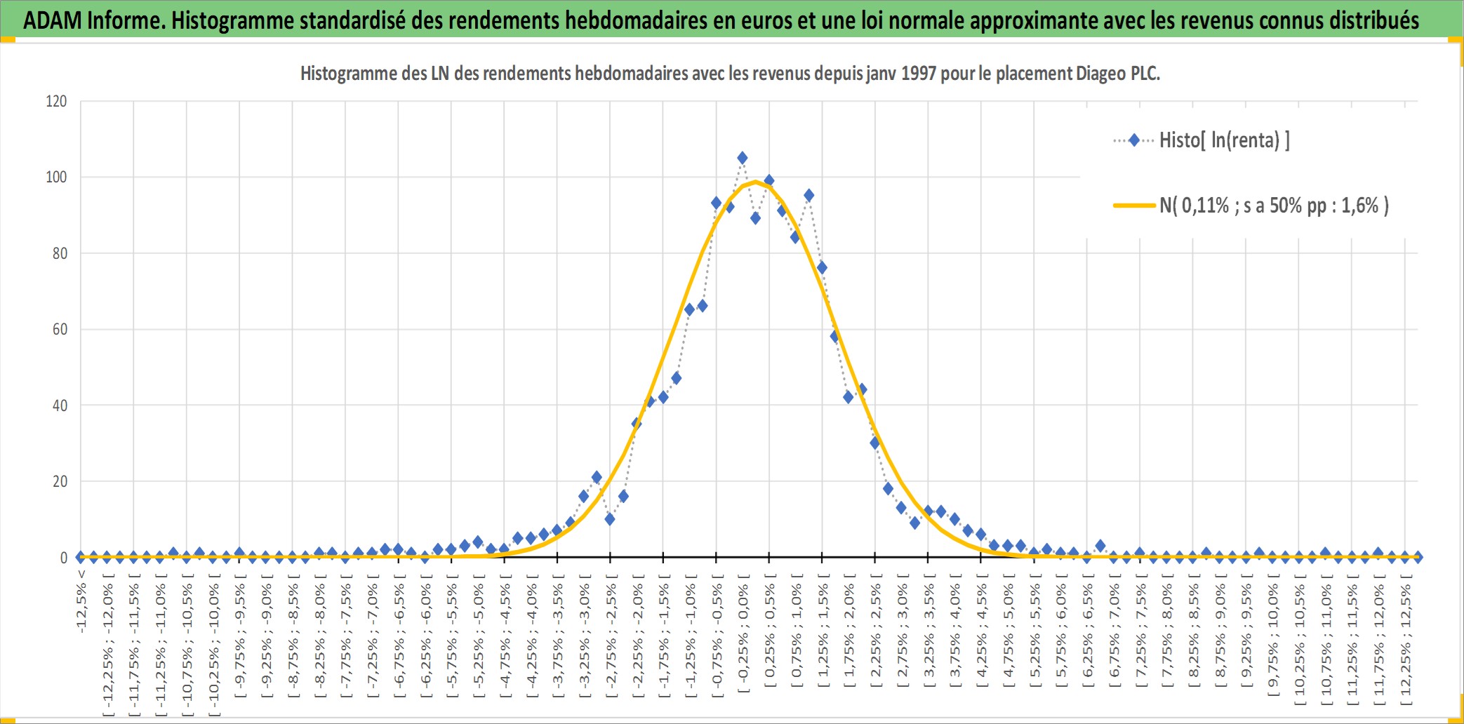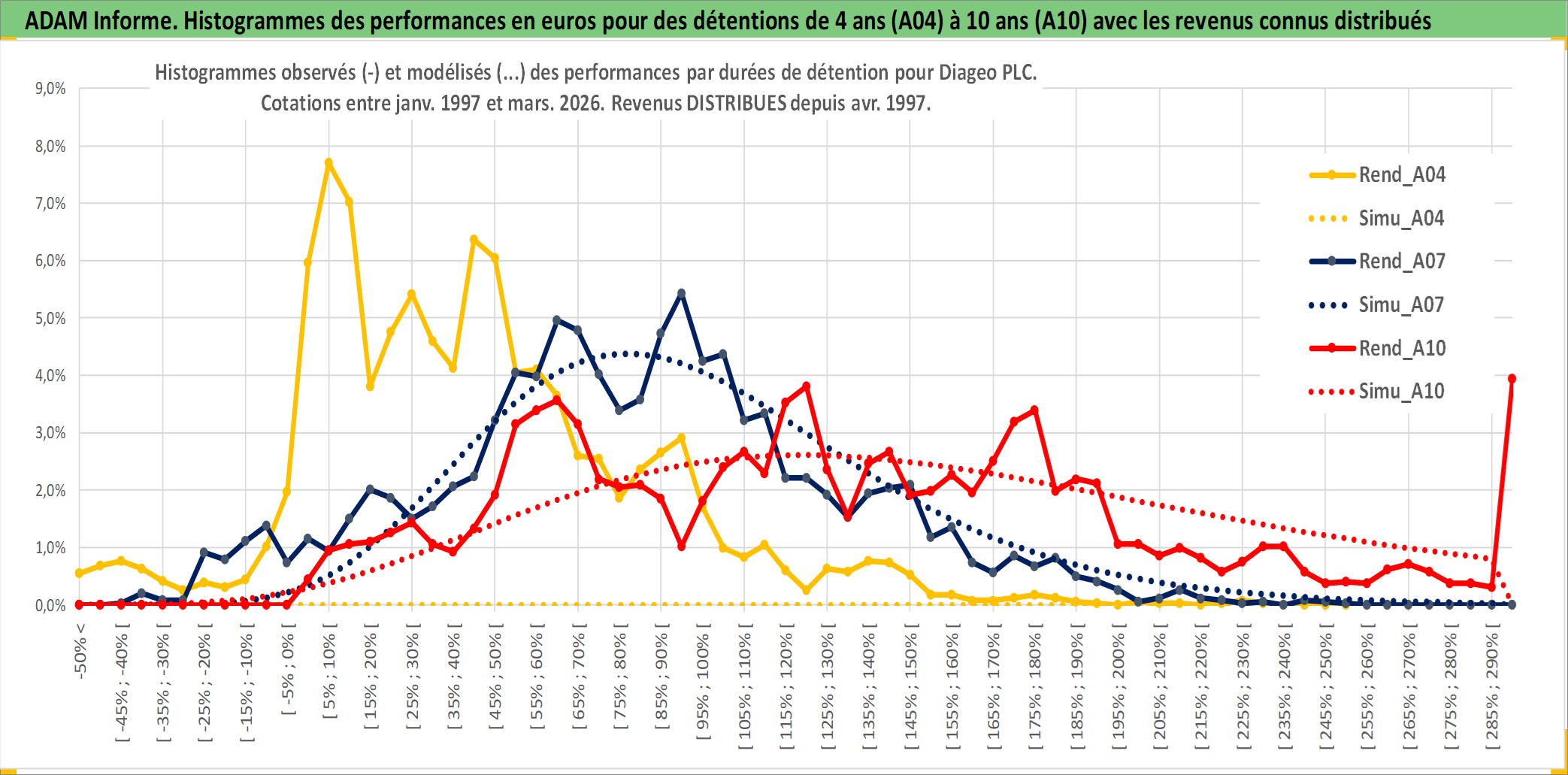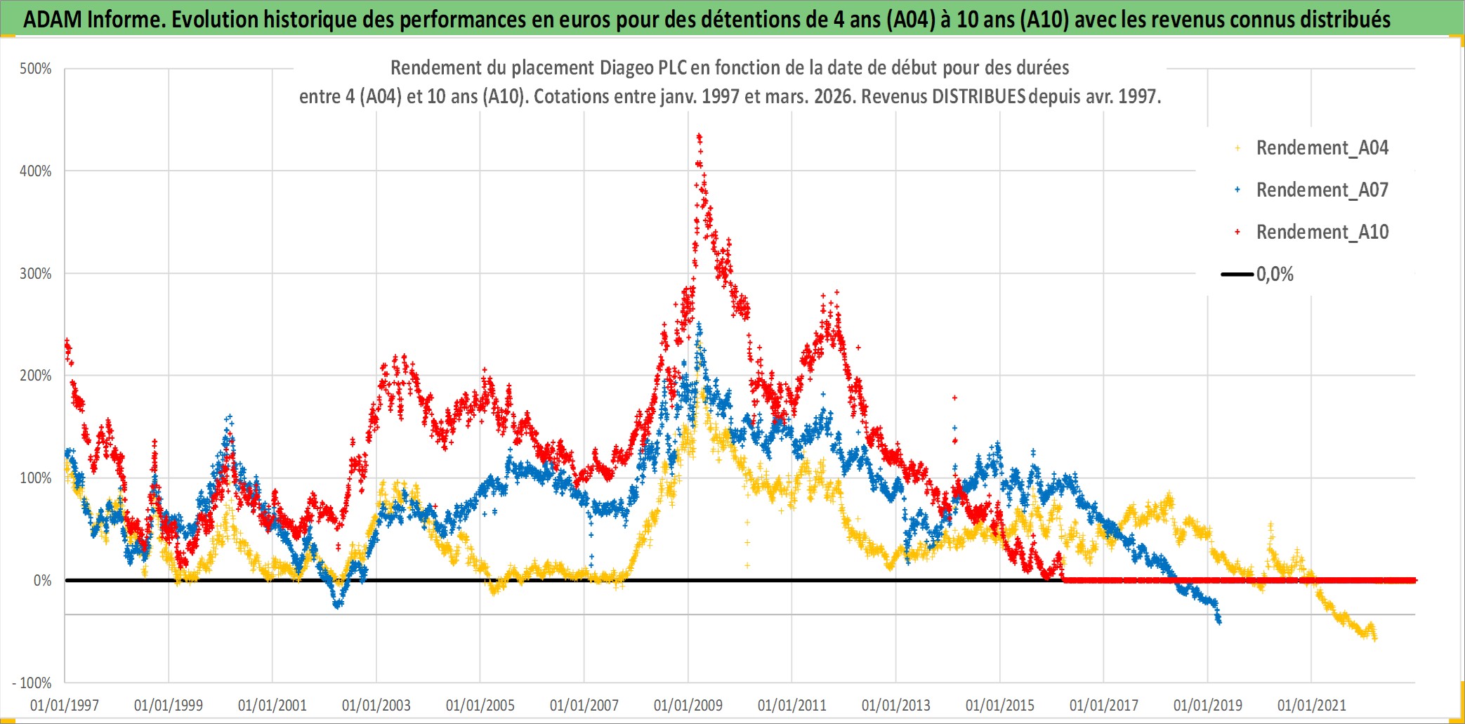 Site dédié aux investisseursPage dédiée sur site financeAnalyse des valorisations hebdomadaires de l'action Diageo PLC. Cet actif est cote en GBX. Les valorisations sont en contrevaleur EURO et couvrent les semaines 1997W01 a 2026W13. Les revenus de cet actif financier sont pris en compte depuis la semaine 1997W14. La note globale ESG de cet actif est estimee a 12.0 (apres rebasage entre 0 et 20).