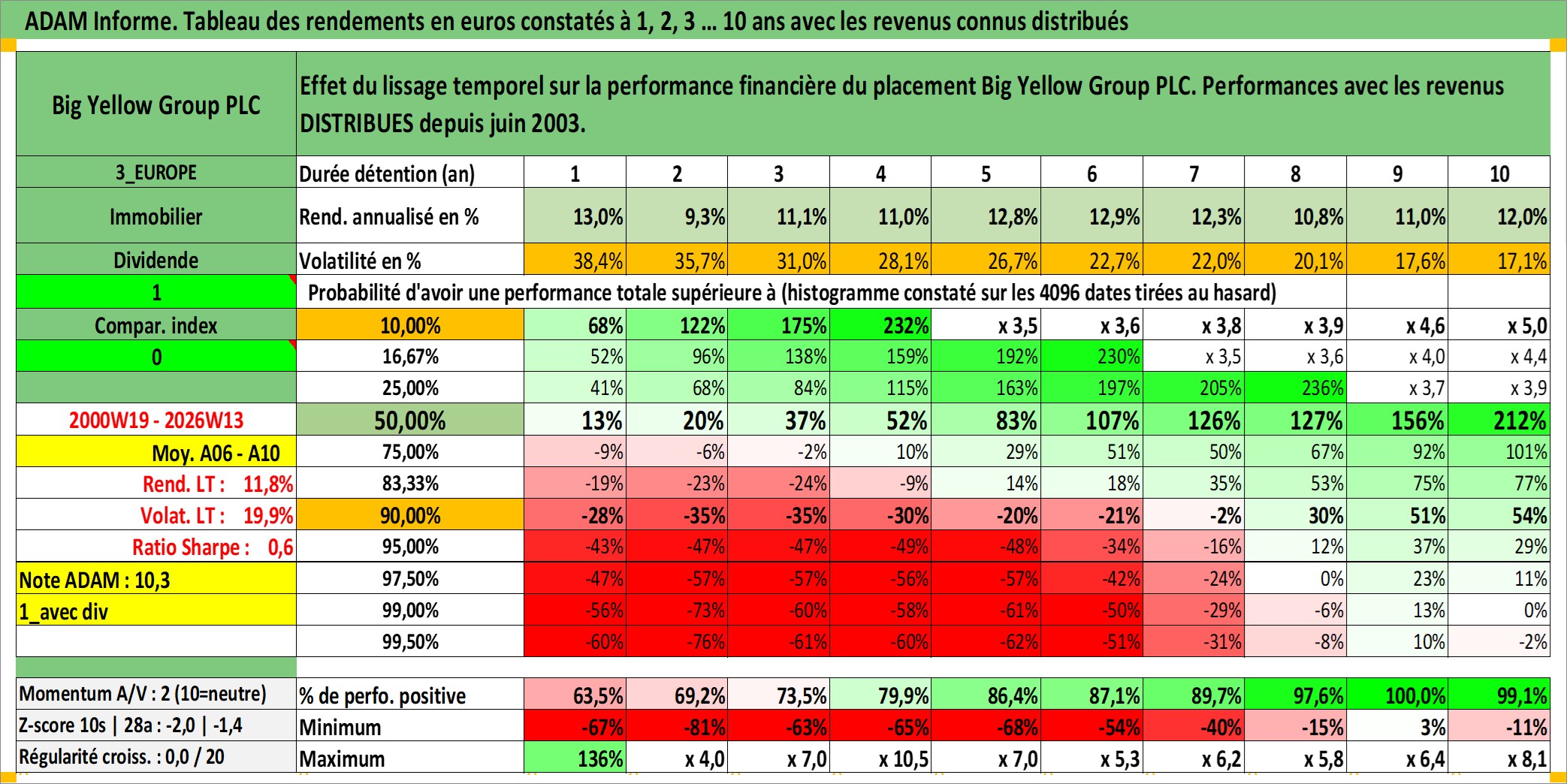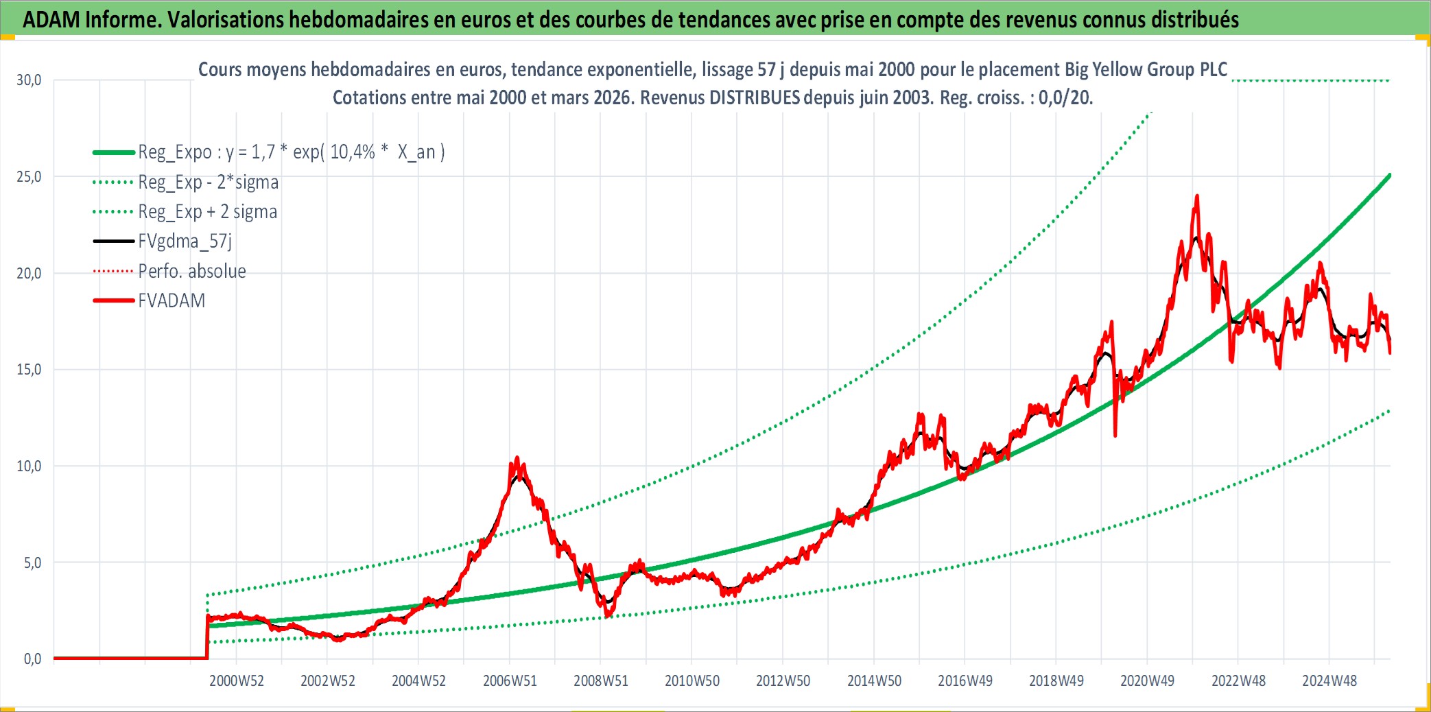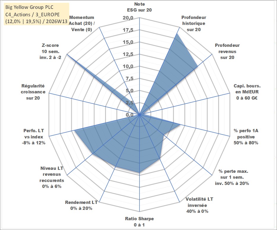 Site dédié aux investisseursPage dédiée sur site financeAnalyse des valorisations hebdomadaires de l'action Big Yellow Group PLC. Cet actif est cote en GBX. Les valorisations sont en contrevaleur EURO et couvrent les semaines 2000W19 a 2026W13. Les revenus de cet actif financier sont pris en compte depuis la semaine 2003W23. La note ESG de cet actif n'est pas connue.