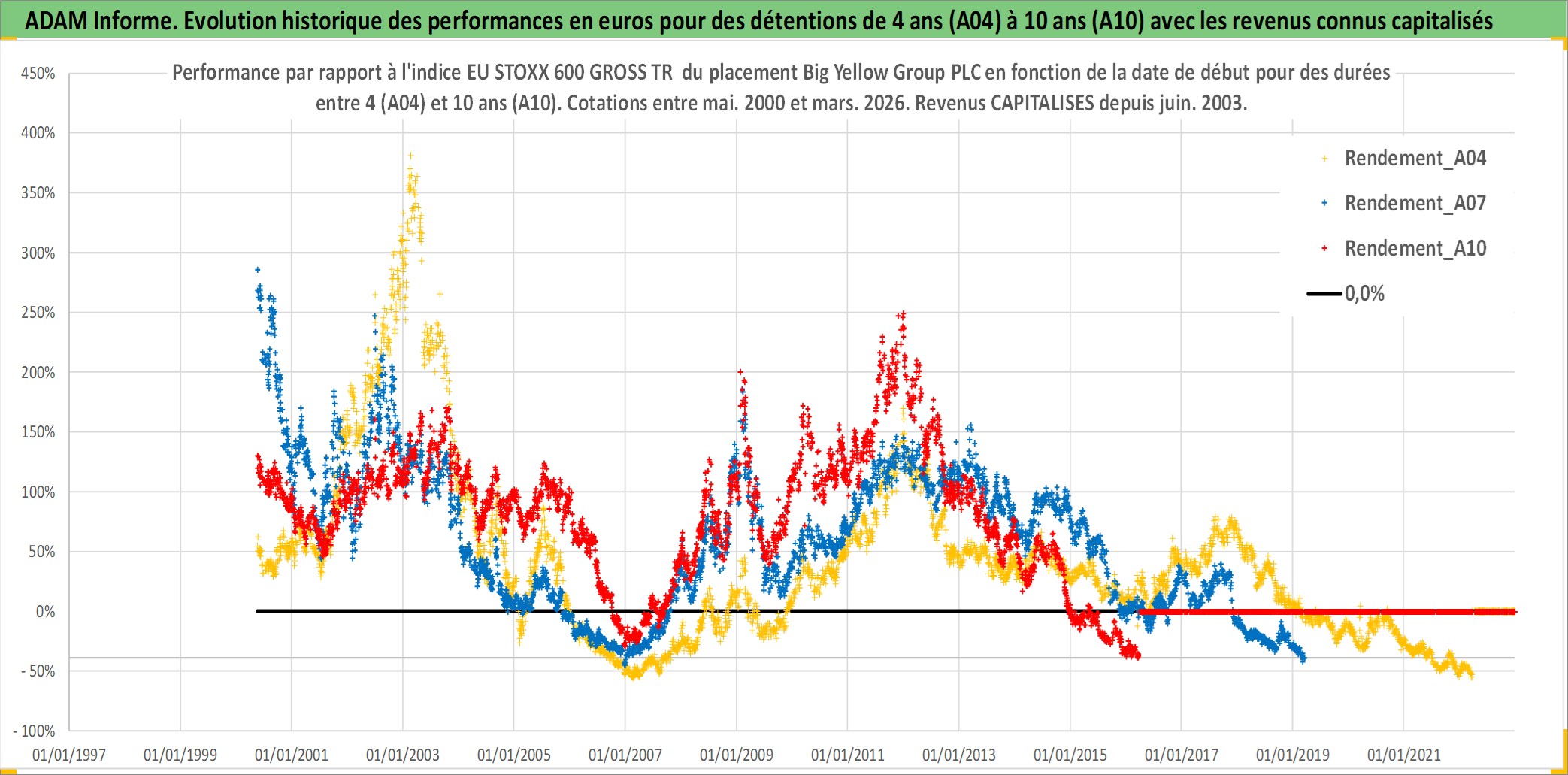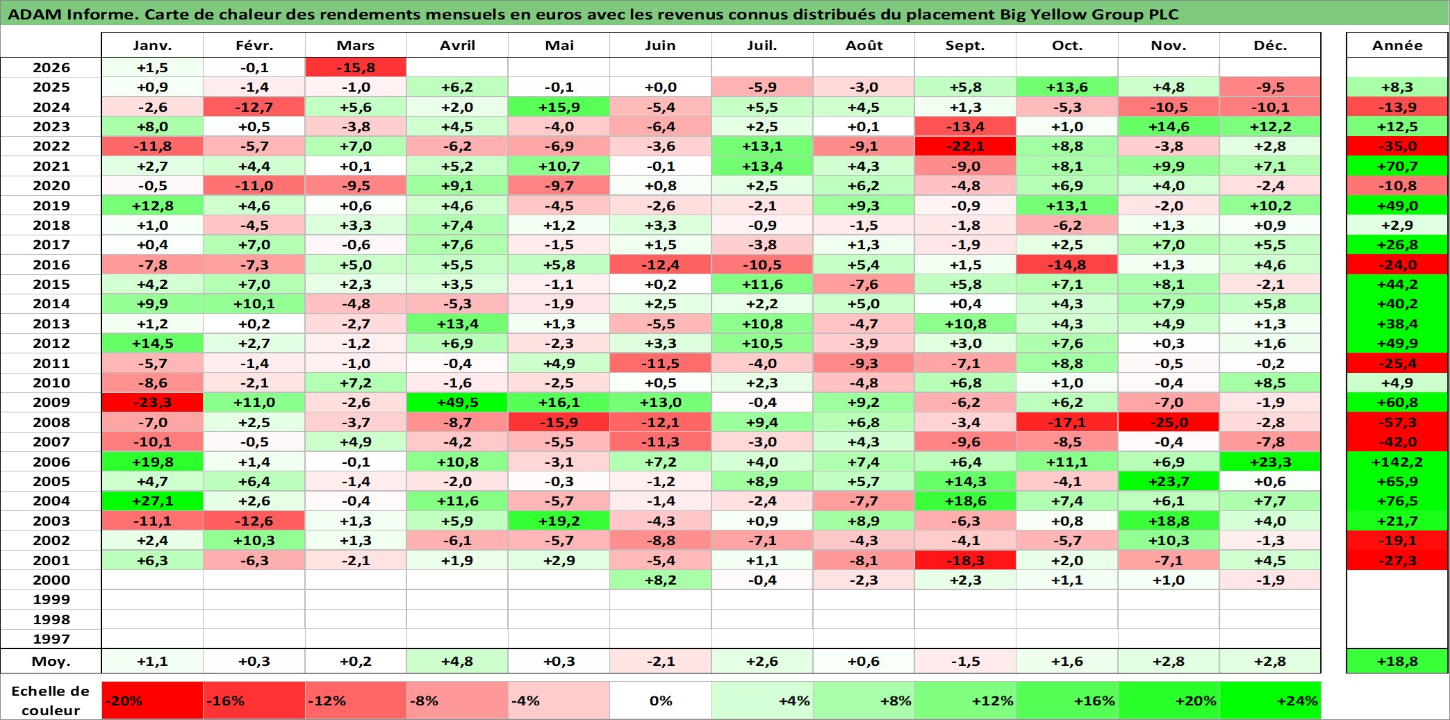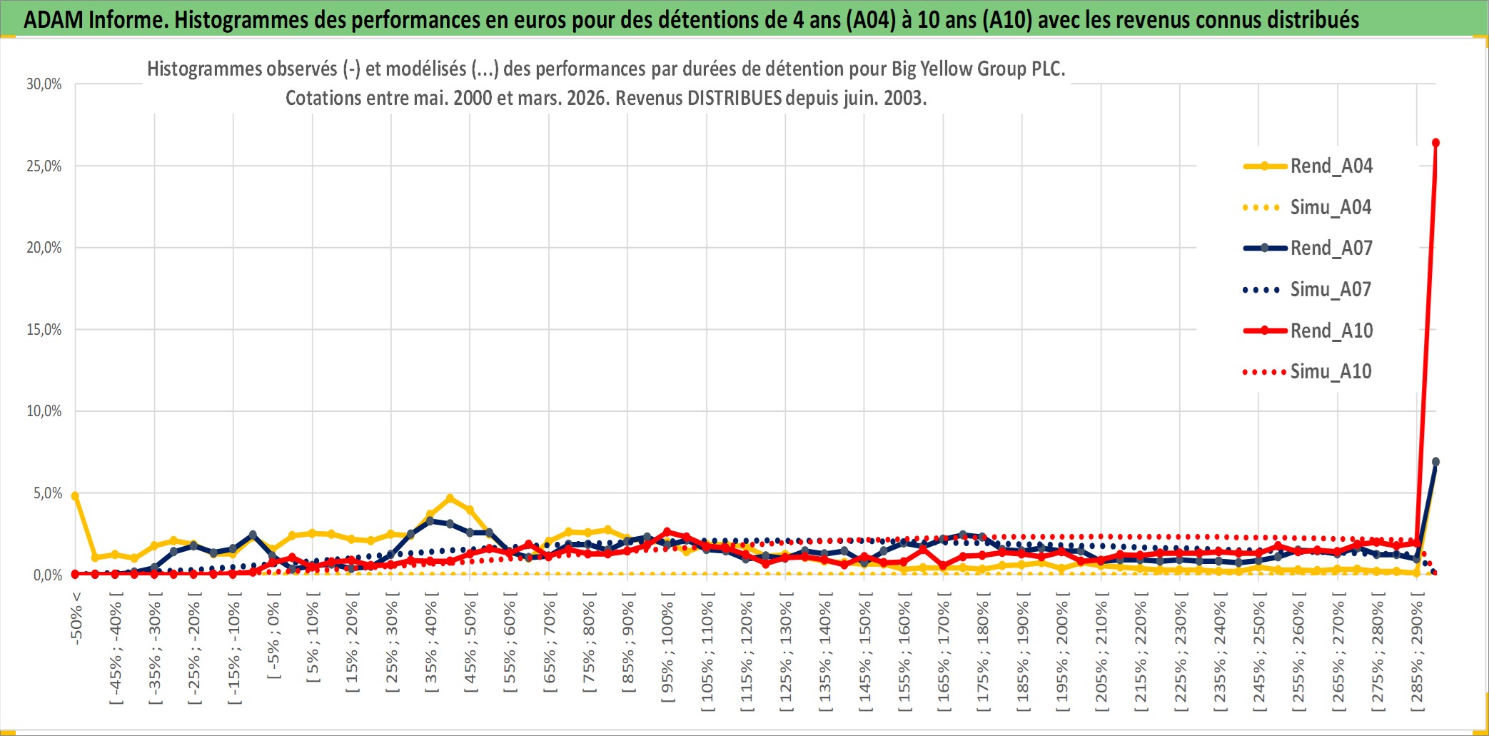 Site dédié aux investisseursPage dédiée sur site financeAnalyse des valorisations hebdomadaires de l'action Big Yellow Group PLC. Cet actif est cote en GBX. Les valorisations sont en contrevaleur EURO et couvrent les semaines 2000W19 a 2026W13. Les revenus de cet actif financier sont pris en compte depuis la semaine 2003W23. La note ESG de cet actif n'est pas connue.