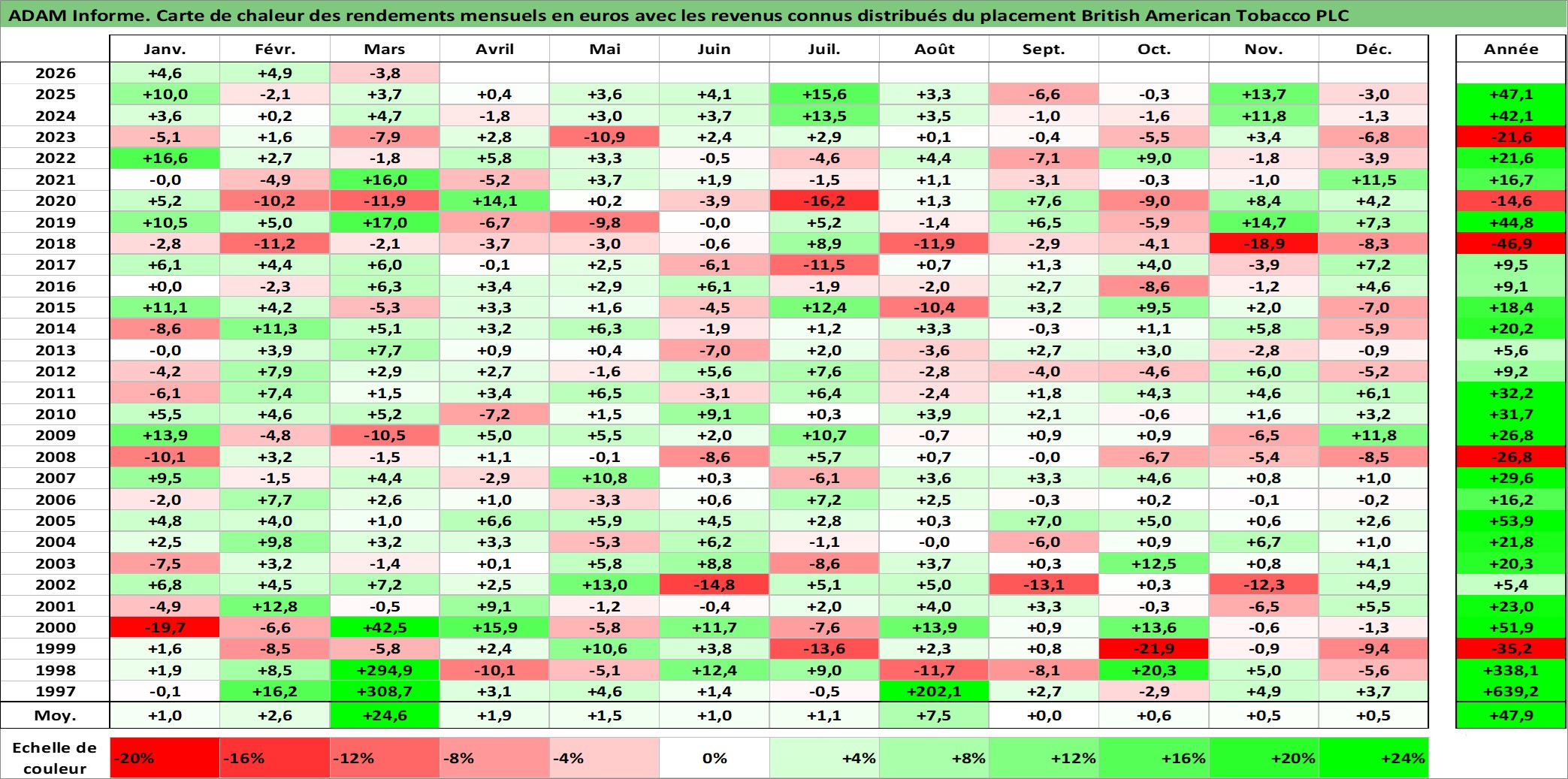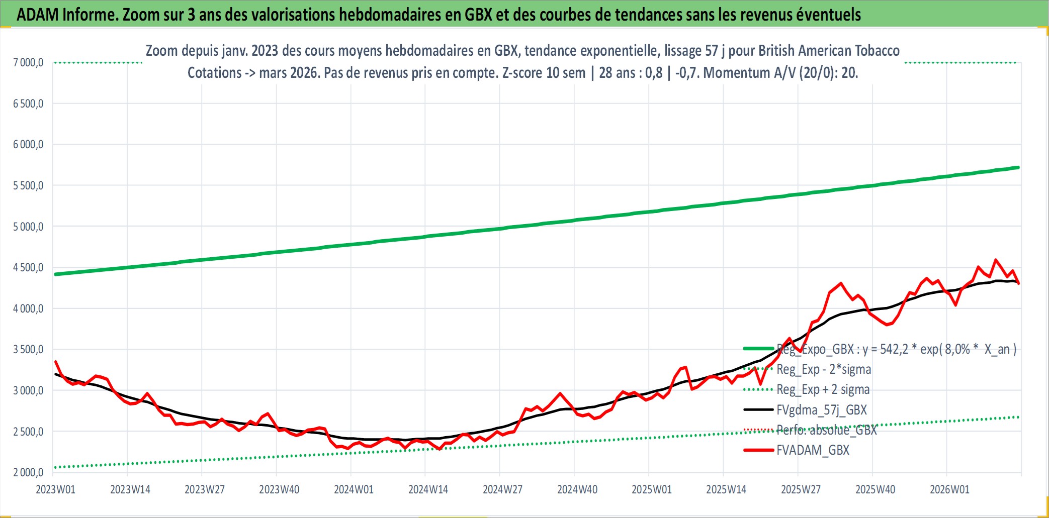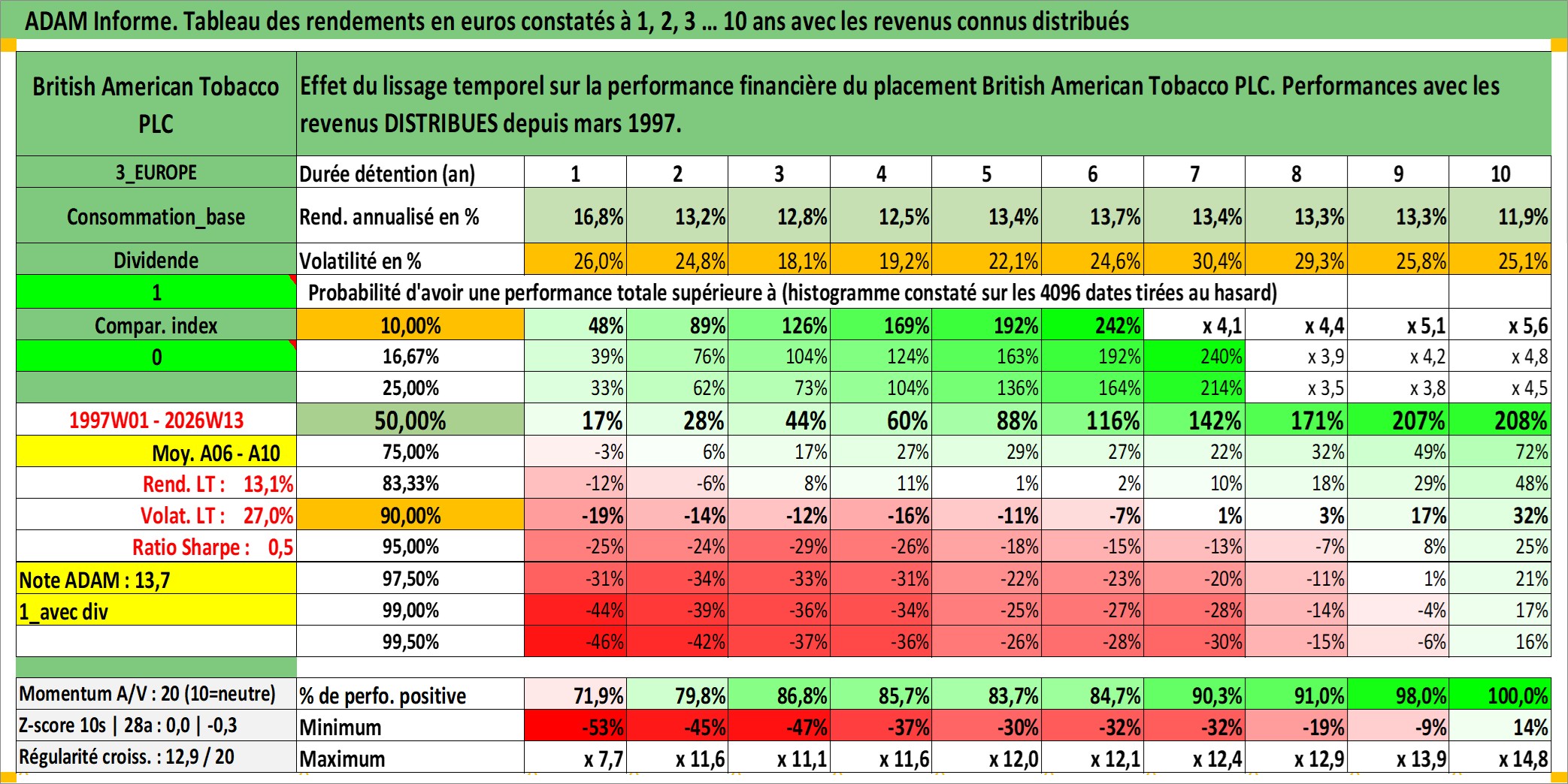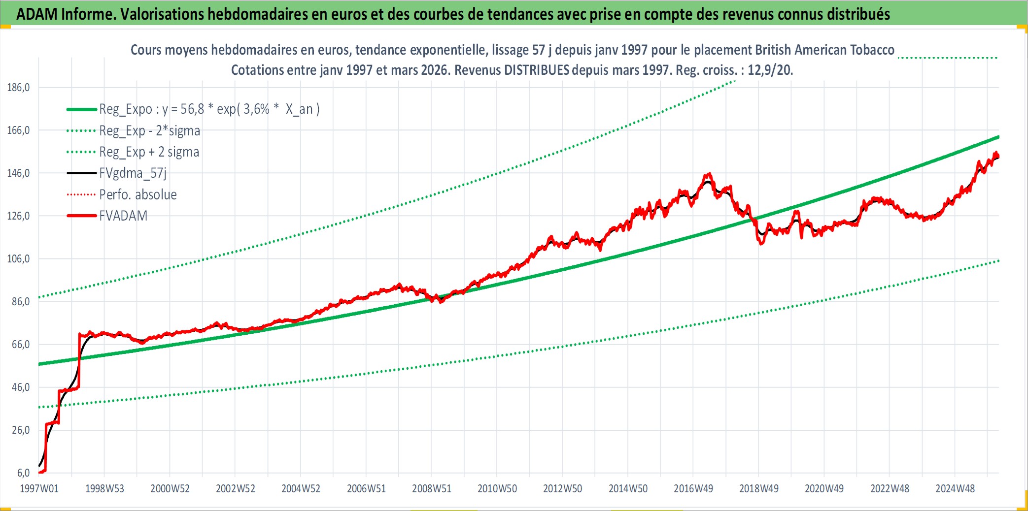 Site dédié aux investisseursPage dédiée sur site financeAnalyse des valorisations hebdomadaires de l'action British American Tobacco PLC. Cet actif est cote en GBX. Les valorisations sont en contrevaleur EURO et couvrent les semaines 1997W01 a 2026W13. Les revenus de cet actif financier sont pris en compte depuis la semaine 1997W12. La note globale ESG de cet actif est estimee a 7.0 (apres rebasage entre 0 et 20).