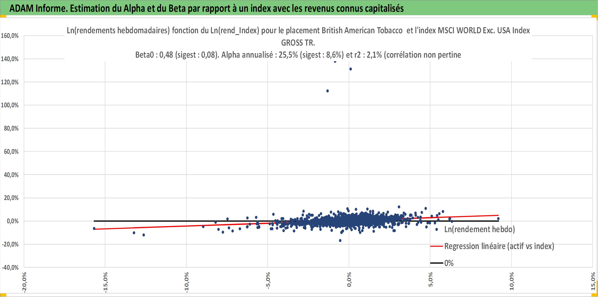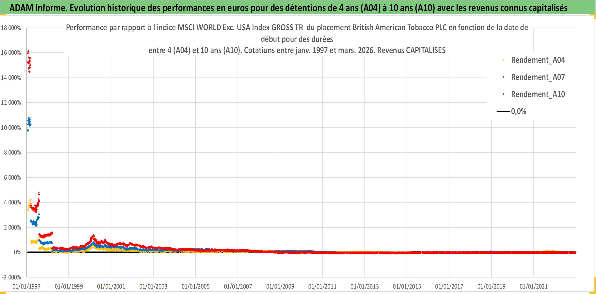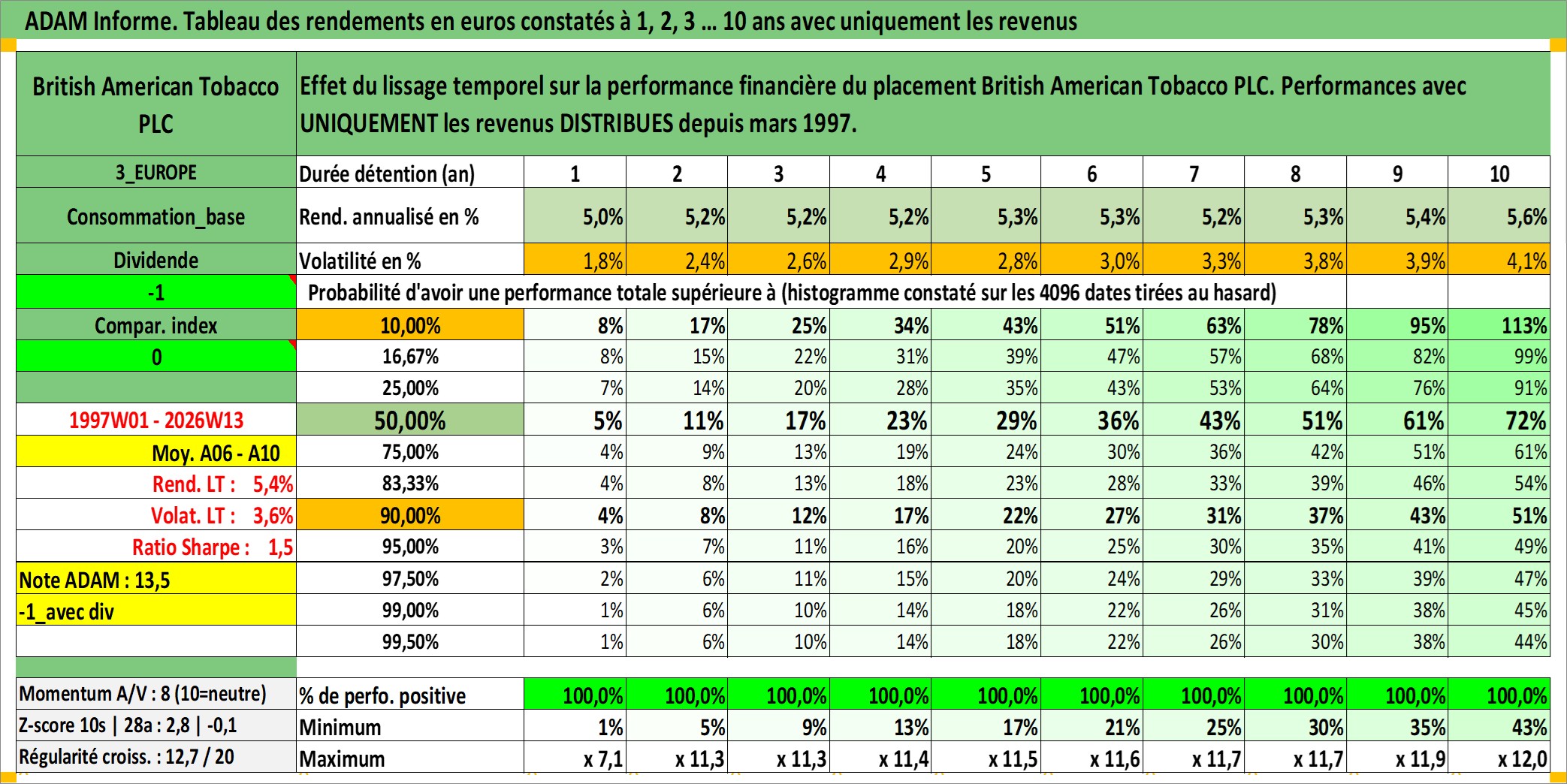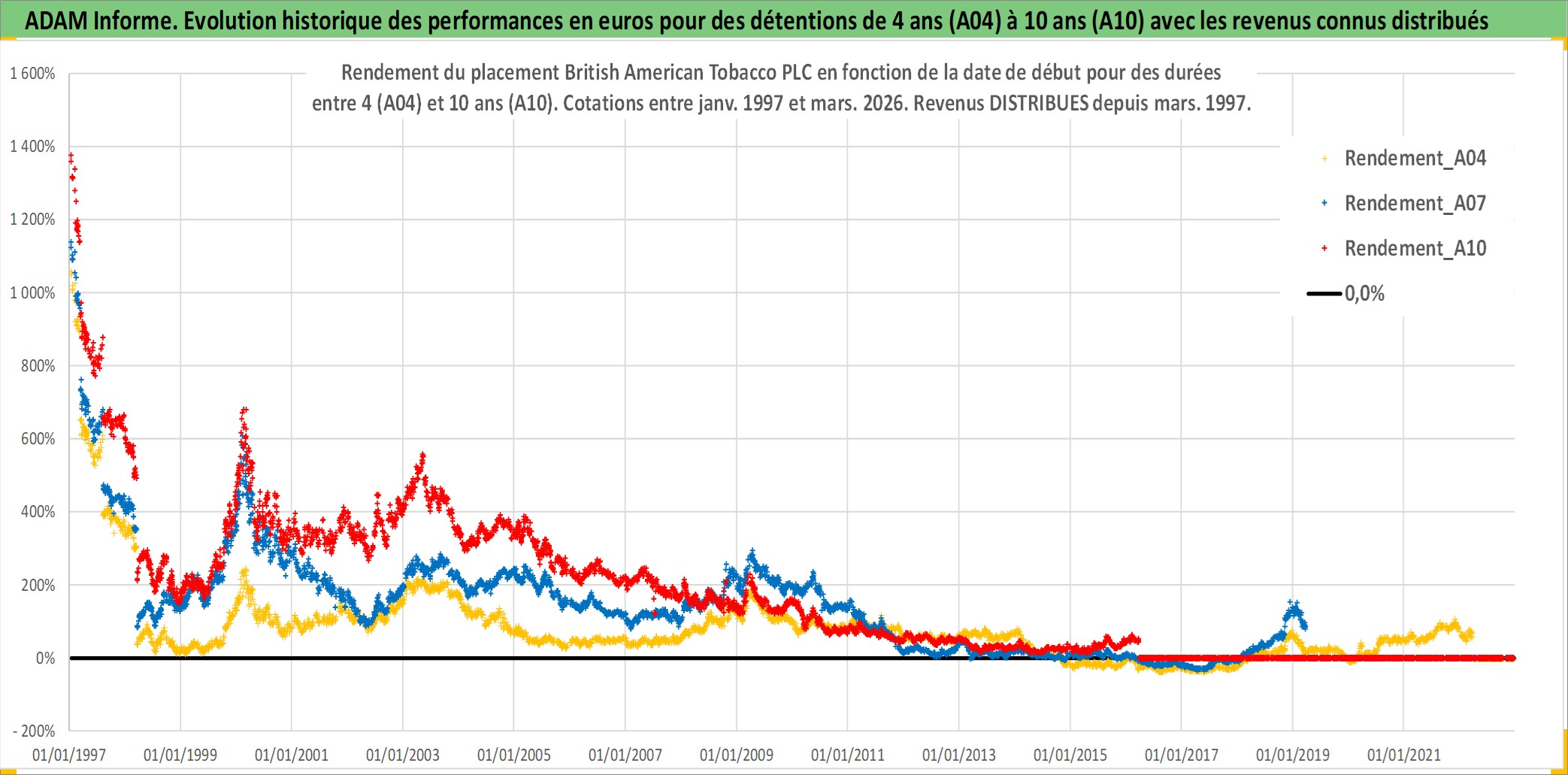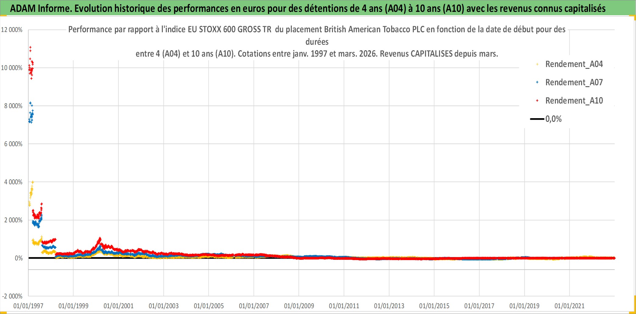 Site dédié aux investisseursPage dédiée sur site financeAnalyse des valorisations hebdomadaires de l'action British American Tobacco PLC. Cet actif est cote en GBX. Les valorisations sont en contrevaleur EURO et couvrent les semaines 1997W01 a 2026W13. Les revenus de cet actif financier sont pris en compte depuis la semaine 1997W12. La note globale ESG de cet actif est estimee a 7.0 (apres rebasage entre 0 et 20).