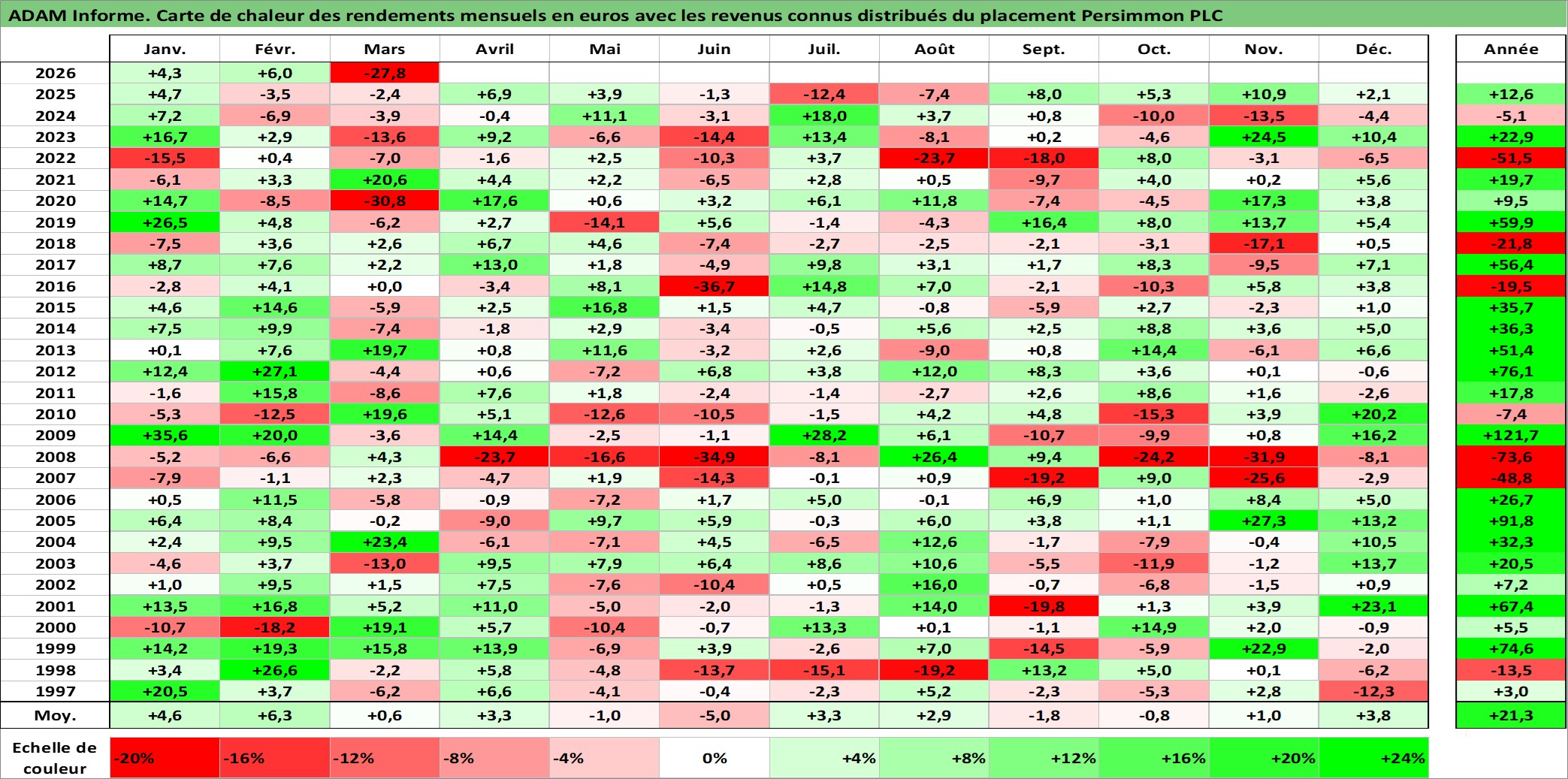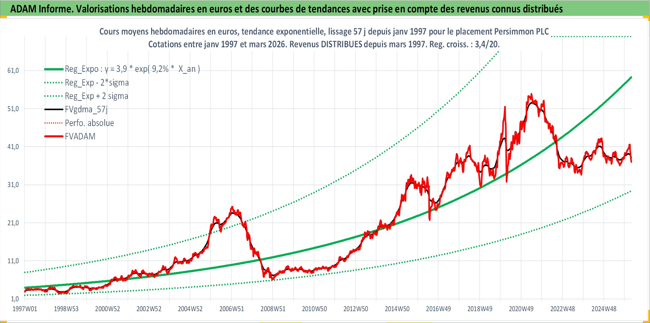 Site dédié aux investisseursPage dédiée sur site financeAnalyse des valorisations hebdomadaires de l'action Persimmon PLC. Cet actif est cote en GBX. Les valorisations sont en contrevaleur EURO et couvrent les semaines 1997W01 a 2026W13. Les revenus de cet actif financier sont pris en compte depuis la semaine 1997W13. La note globale ESG de cet actif est estimee a 12.0 (apres rebasage entre 0 et 20).