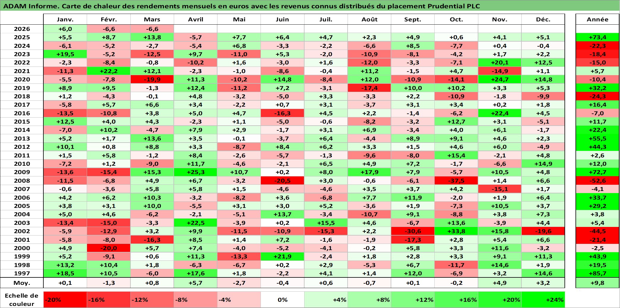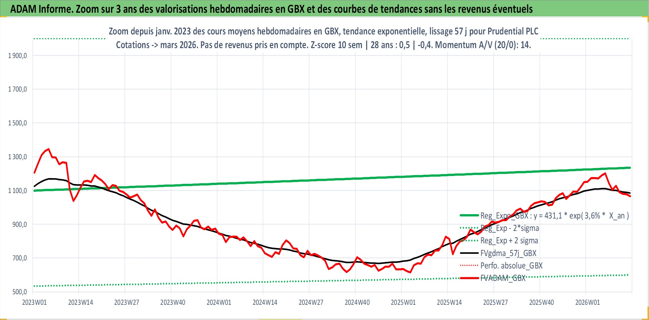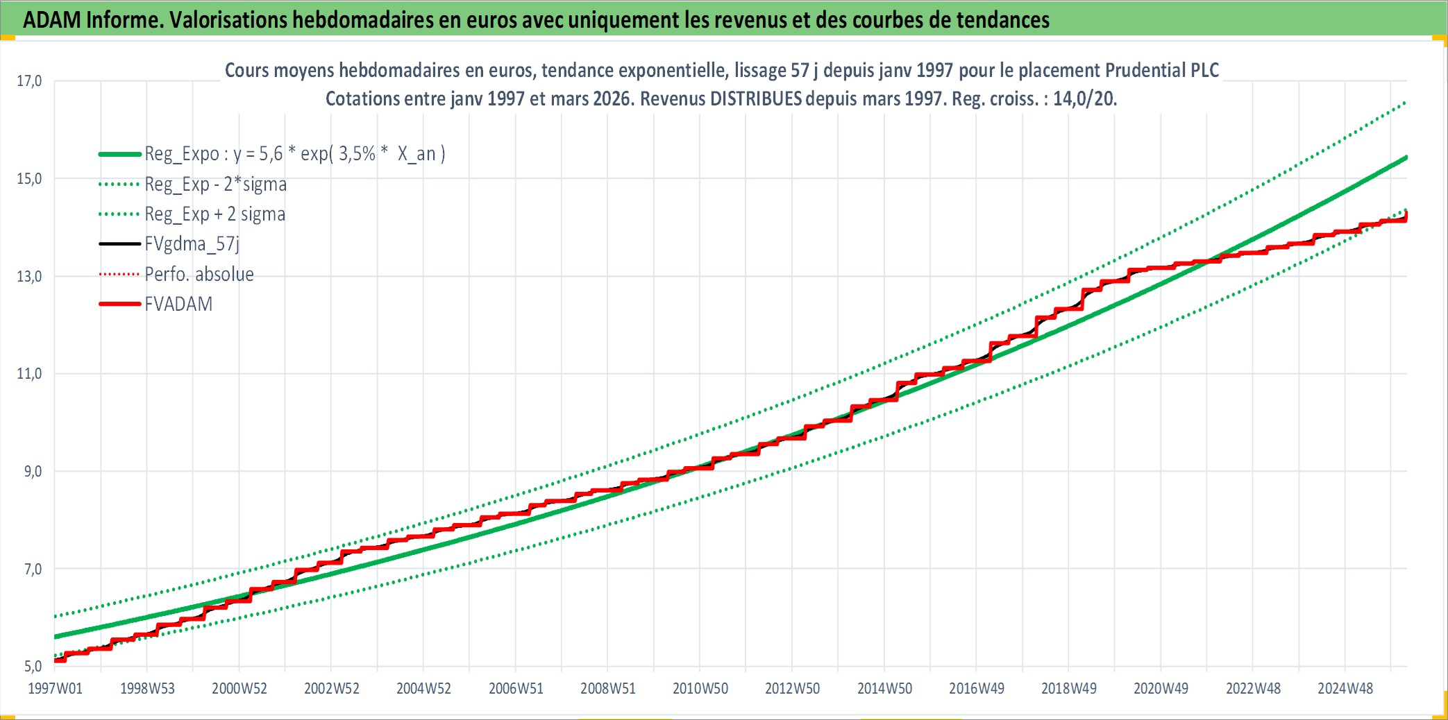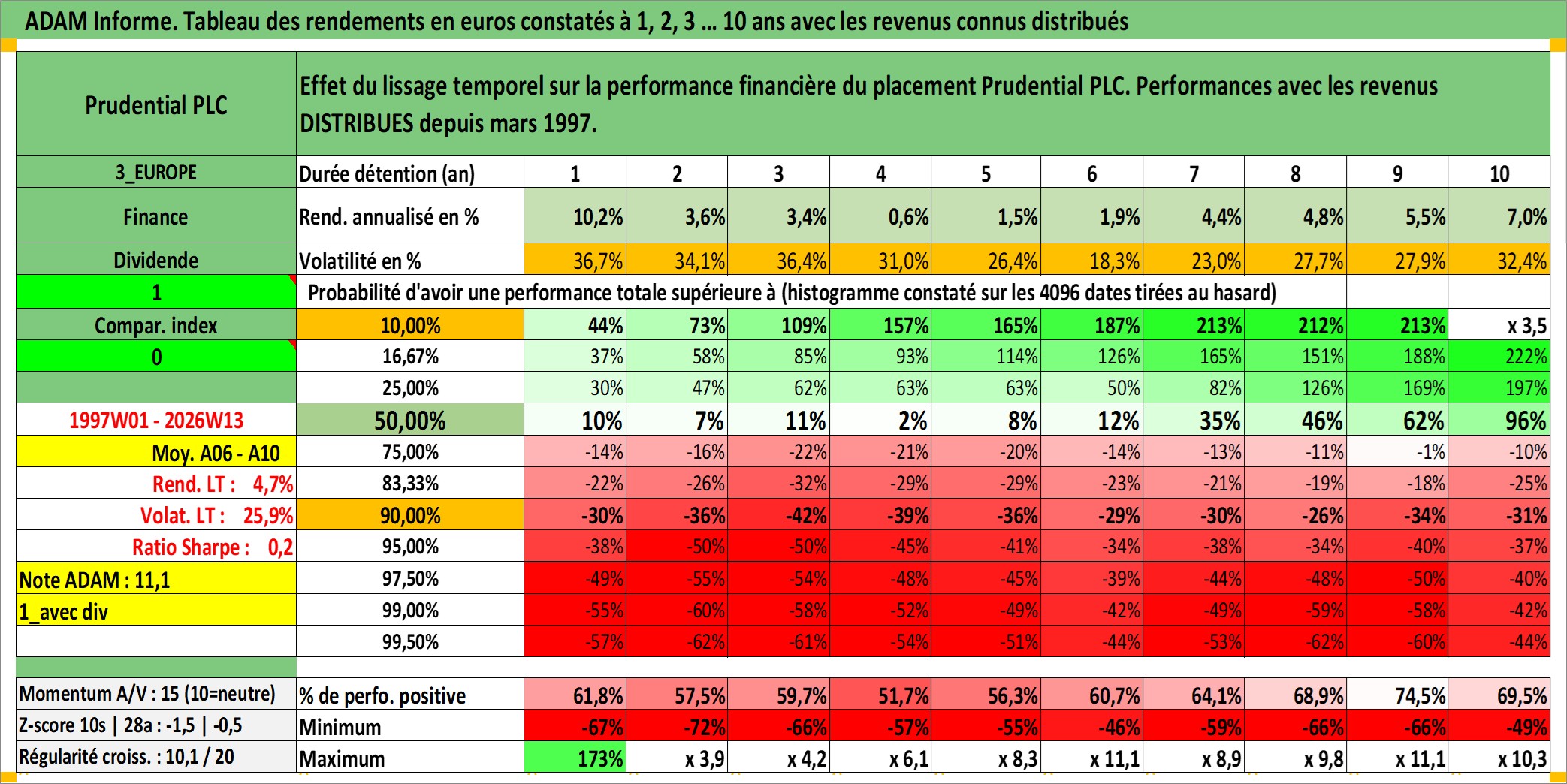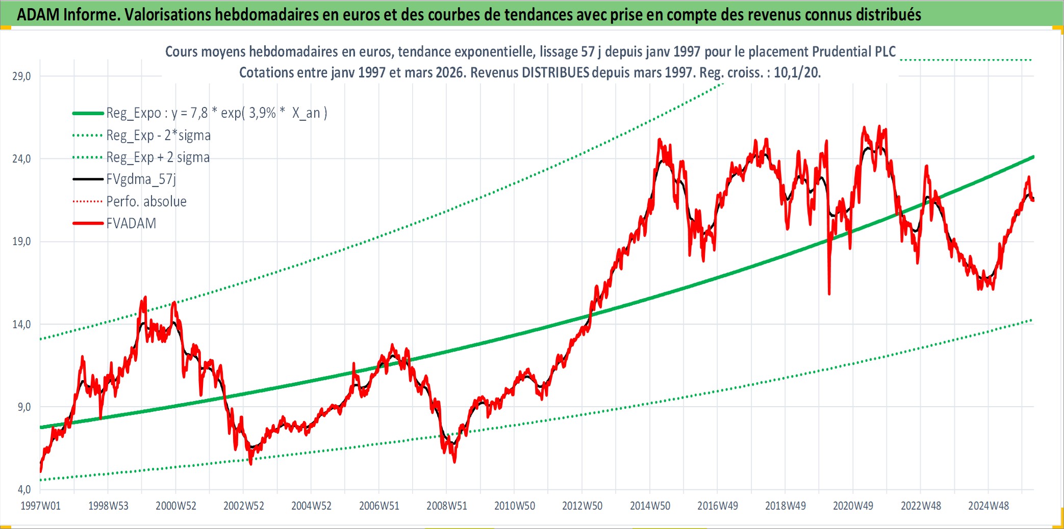 Site dédié aux investisseursPage dédiée sur site financeAnalyse des valorisations hebdomadaires de l'action Prudential PLC. Cet actif est cote en GBX. Les valorisations sont en contrevaleur EURO et couvrent les semaines 1997W01 a 2026W13. Les revenus de cet actif financier sont pris en compte depuis la semaine 1997W13. La note globale ESG de cet actif est estimee a 13.0 (apres rebasage entre 0 et 20).