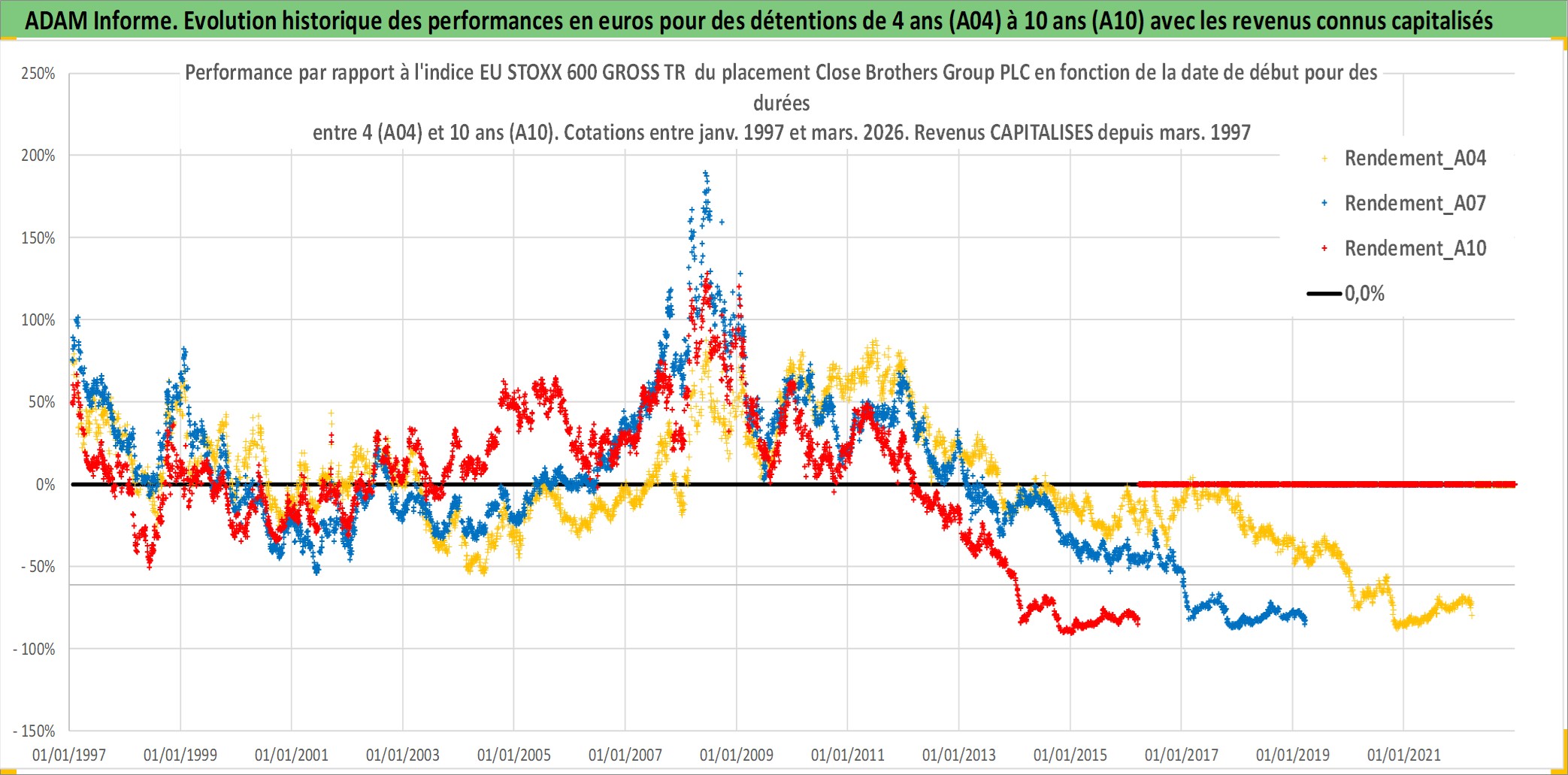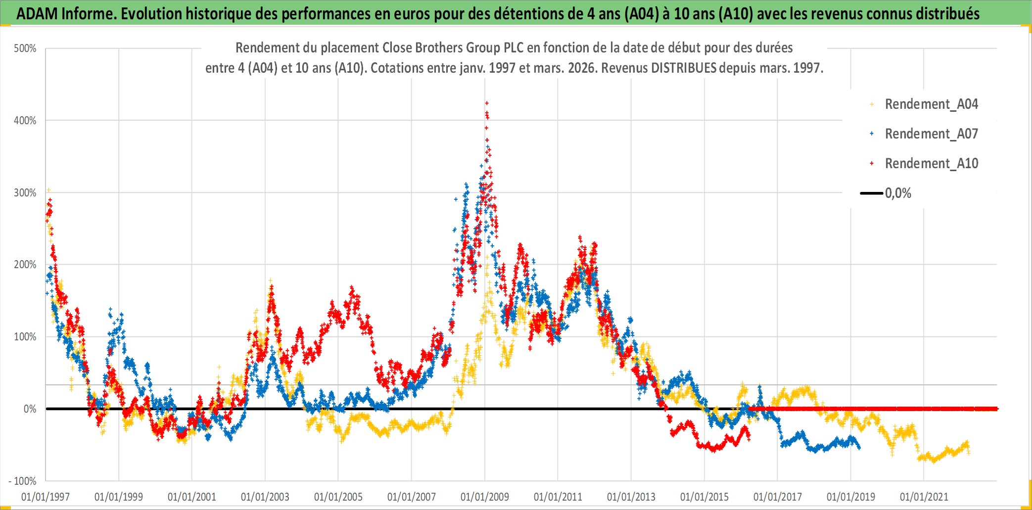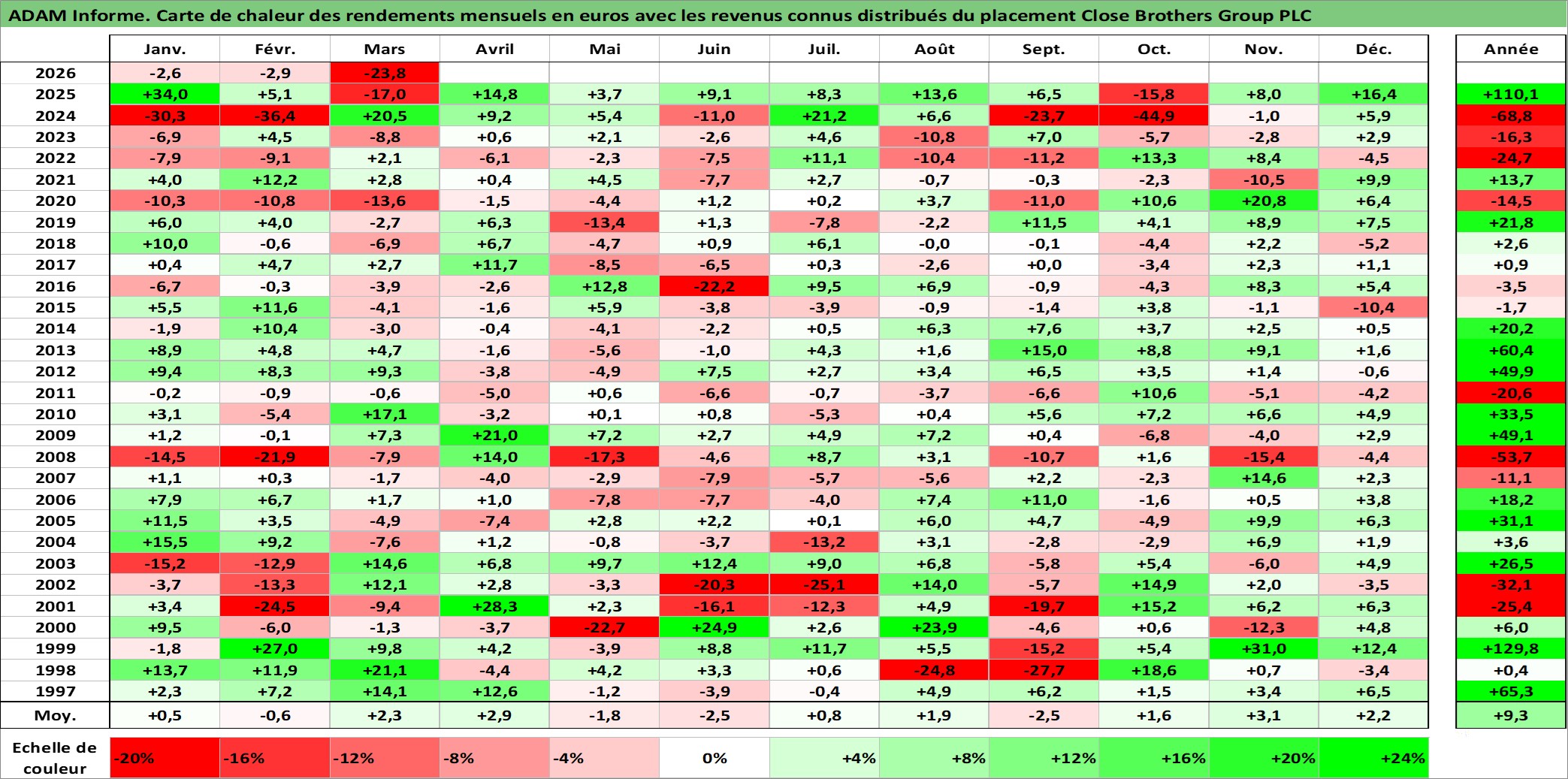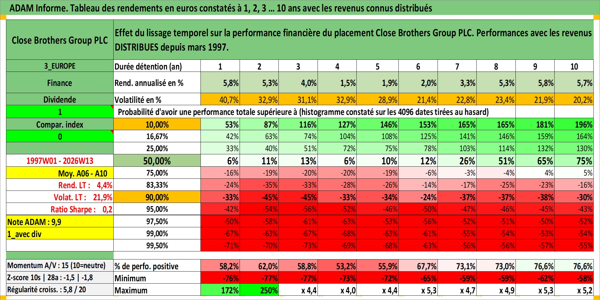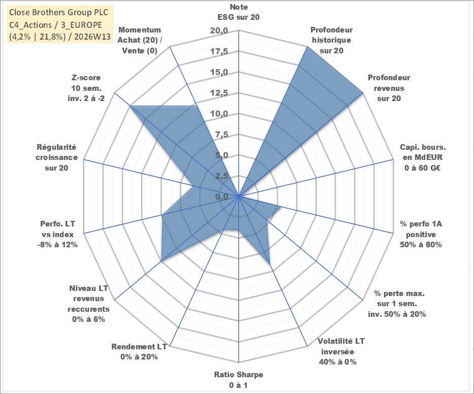 Site dédié aux investisseursPage dédiée sur site financeAnalyse des valorisations hebdomadaires de l'action Close Brothers Group PLC. Cet actif est cote en GBX. Les valorisations sont en contrevaleur EURO et couvrent les semaines 1997W01 a 2026W13. Les revenus de cet actif financier sont pris en compte depuis la semaine 1997W11. La note ESG de cet actif n'est pas connue.