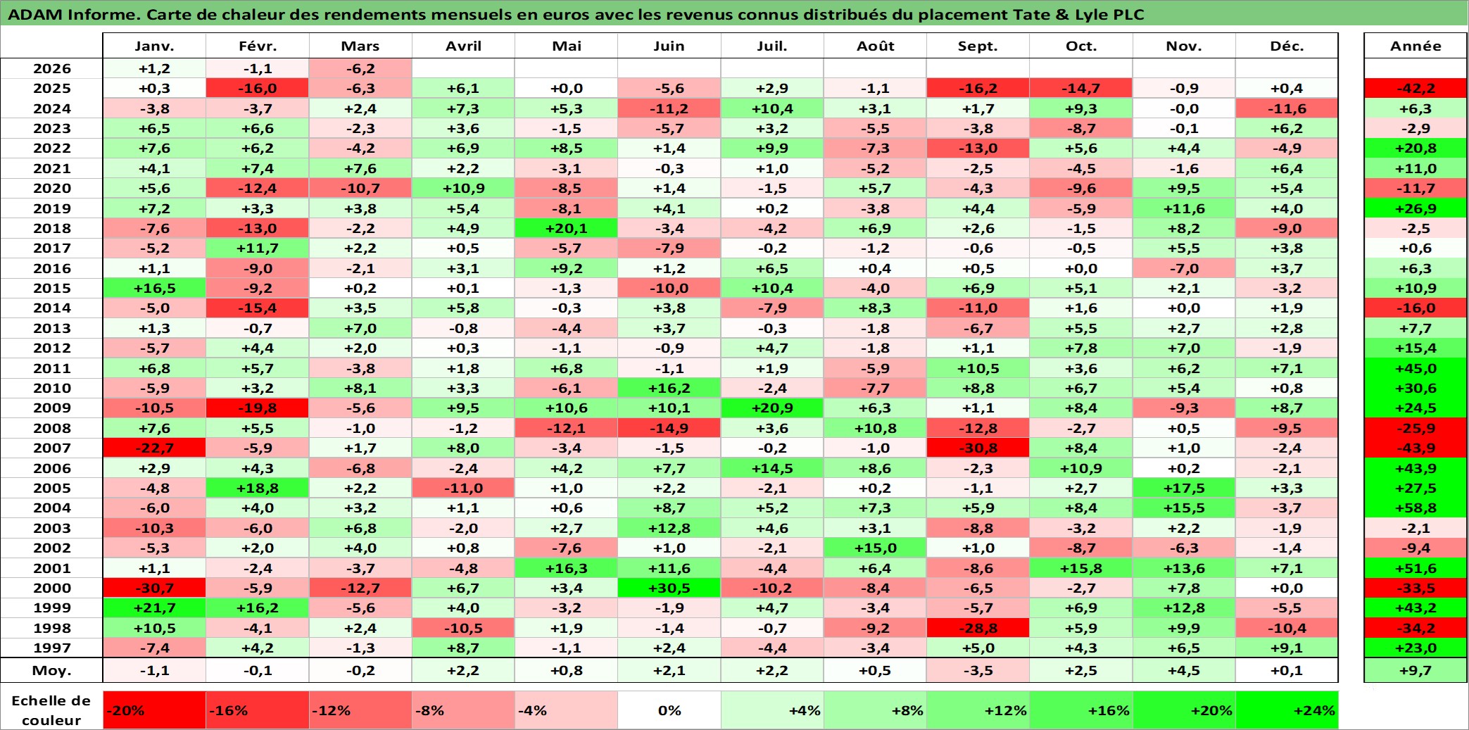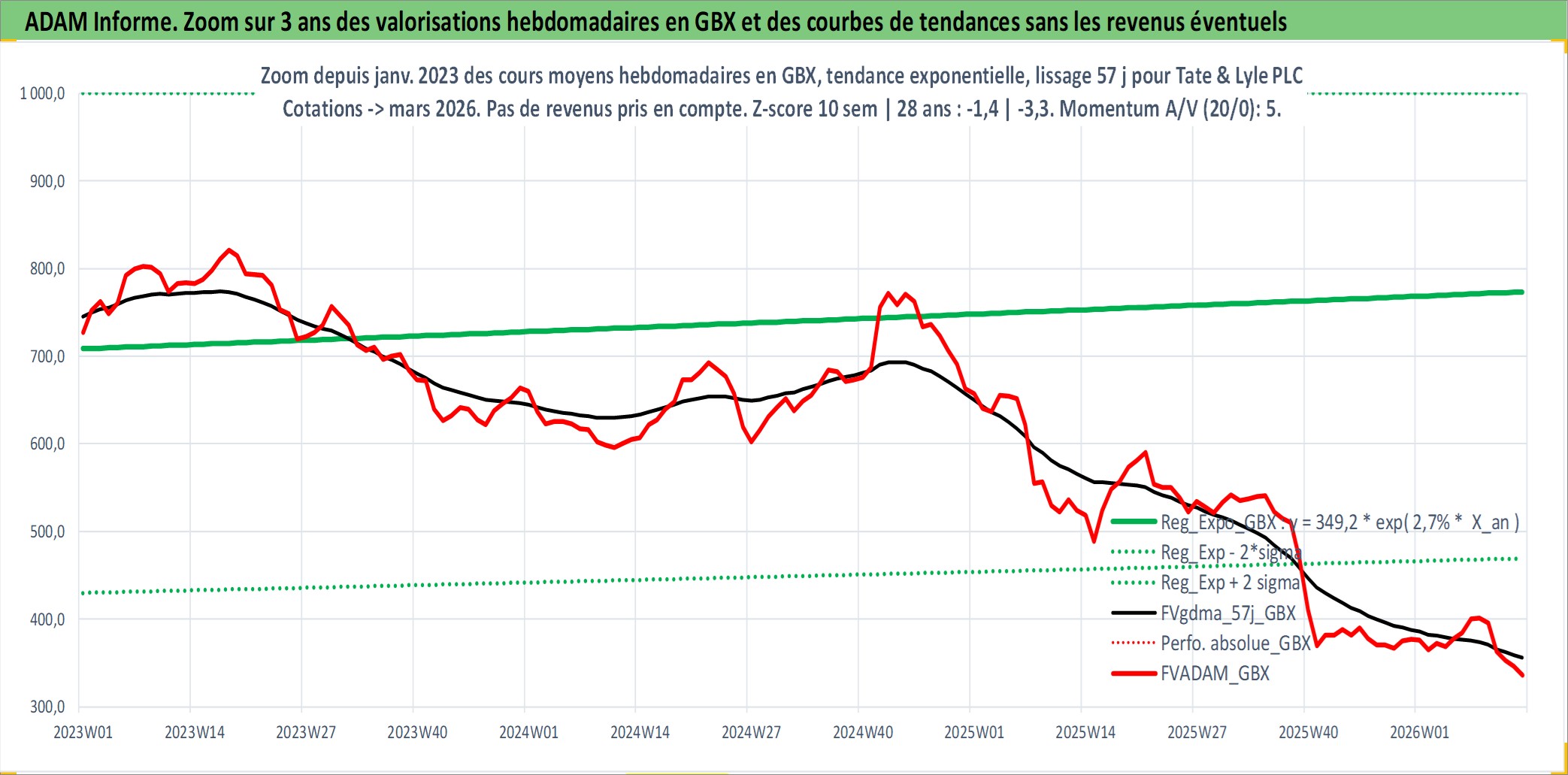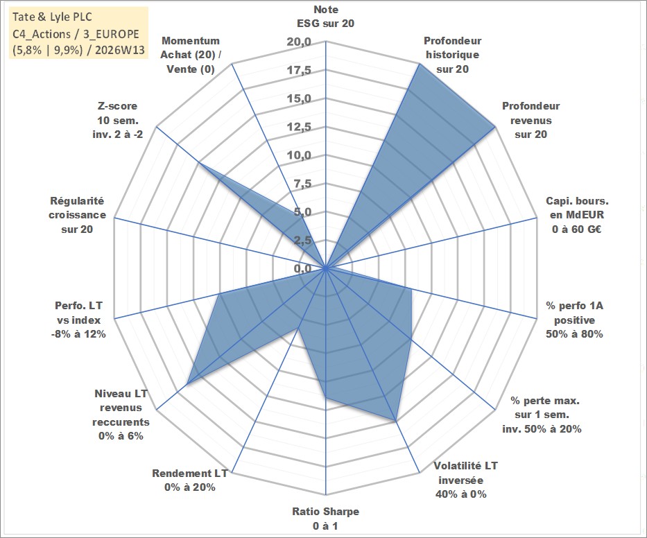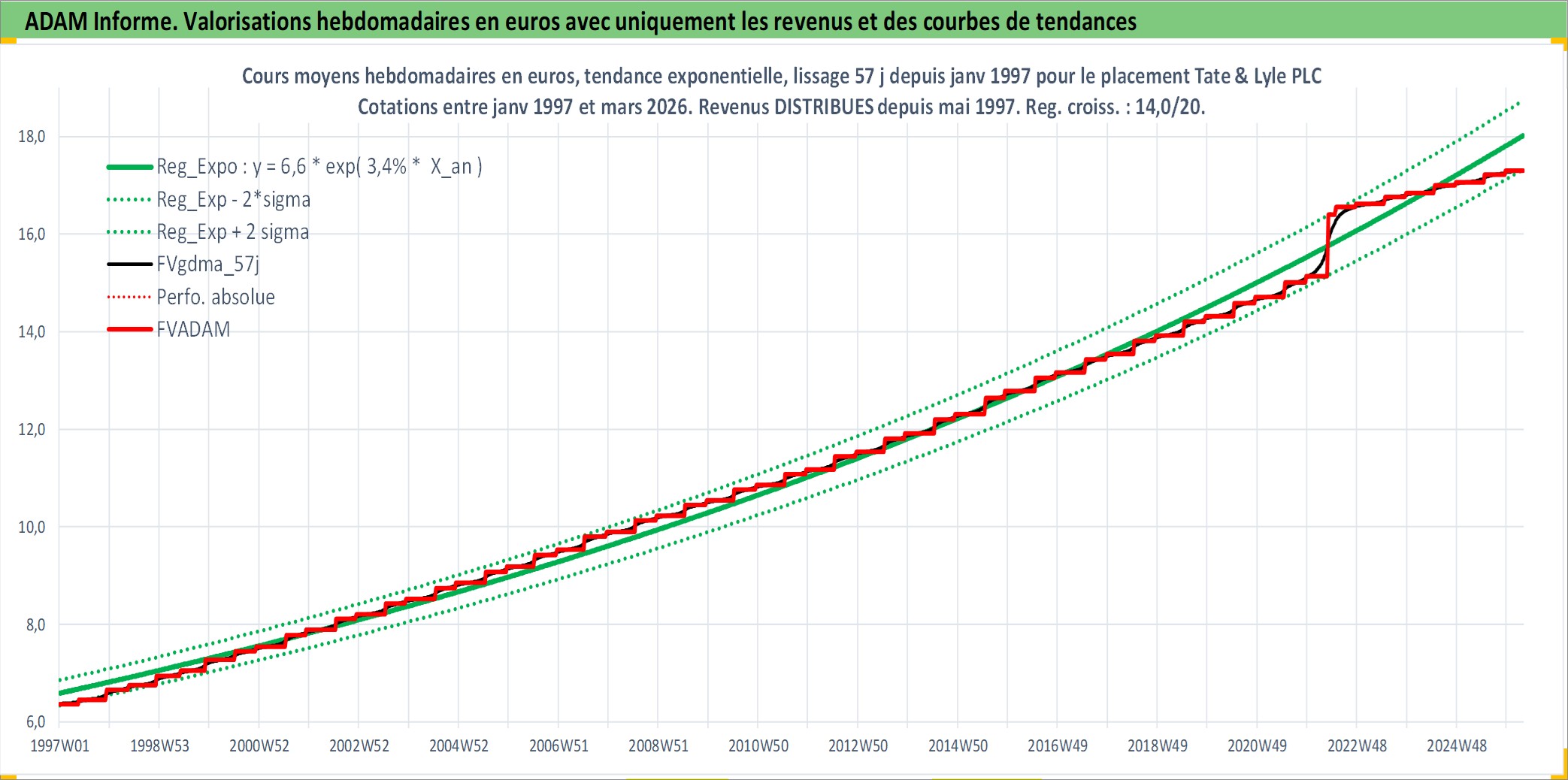 Site dédié aux investisseursPage dédiée sur site financeAnalyse des valorisations hebdomadaires de l'action Tate & Lyle PLC. Cet actif est cote en GBX. Les valorisations sont en contrevaleur EURO et couvrent les semaines 1997W01 a 2026W13. Les revenus de cet actif financier sont pris en compte depuis la semaine 1997W21. La note ESG de cet actif n'est pas connue.