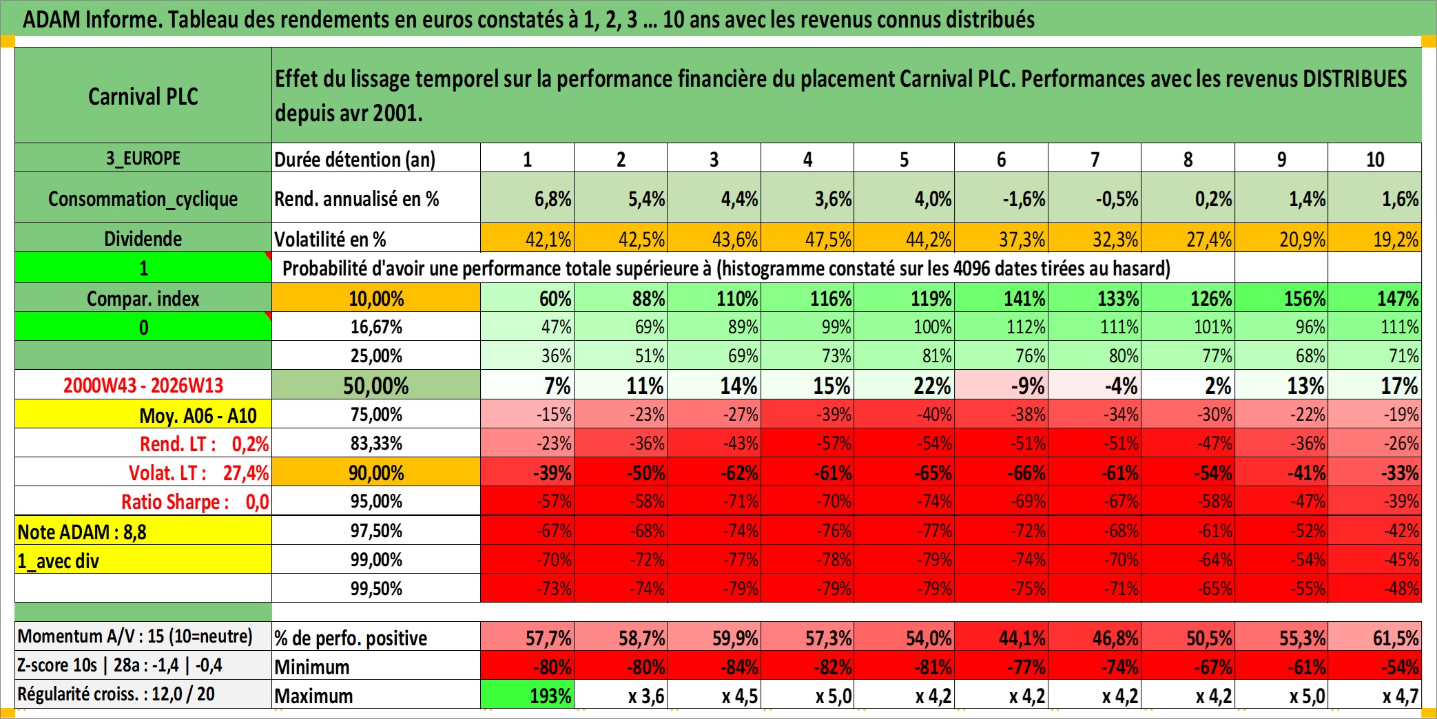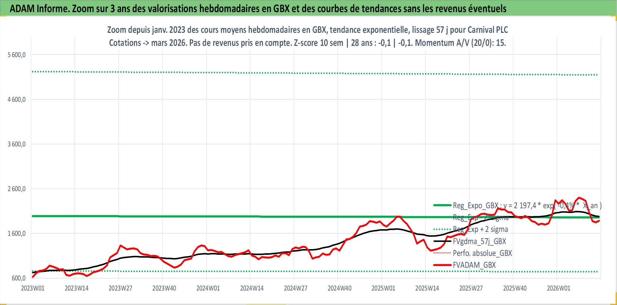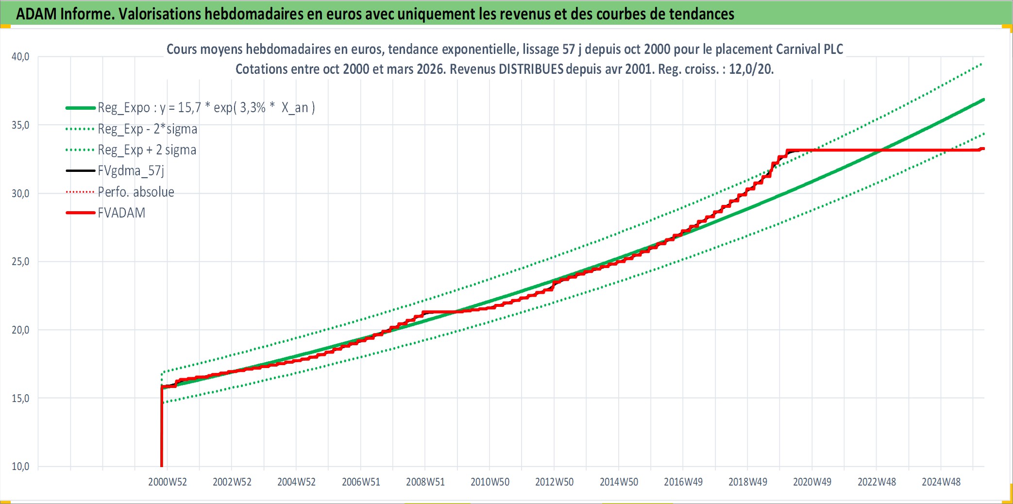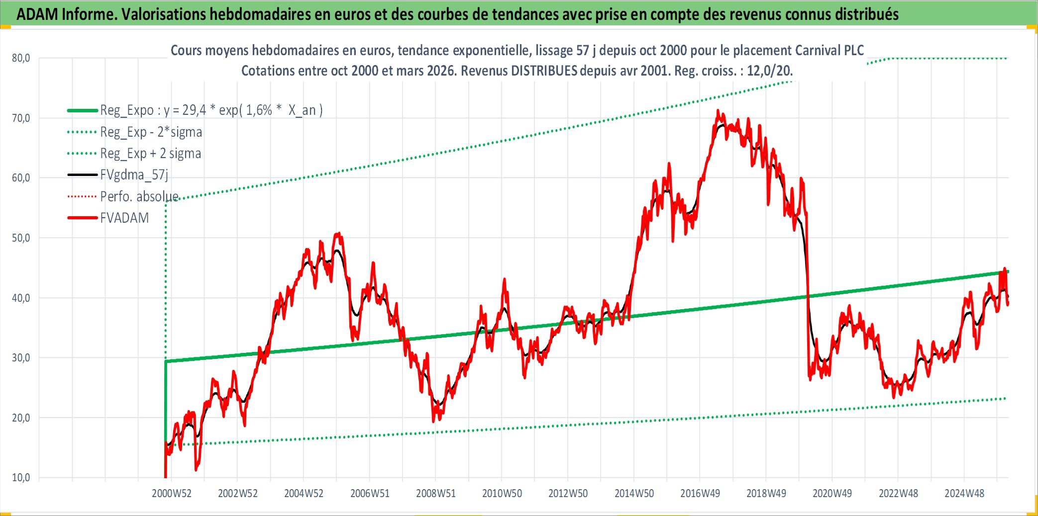 Site dédié aux investisseursPage dédiée sur site financeAnalyse des valorisations hebdomadaires de l'action Carnival PLC. Cet actif est cote en GBX. Les valorisations sont en contrevaleur EURO et couvrent les semaines 2000W43 a 2026W13. Les revenus de cet actif financier sont pris en compte depuis la semaine 2001W14. La note globale ESG de cet actif est estimee a 8.0 (apres rebasage entre 0 et 20).