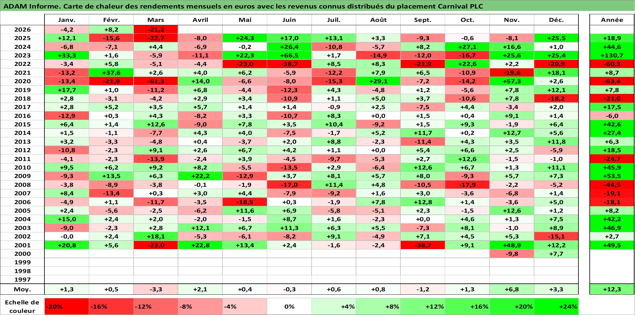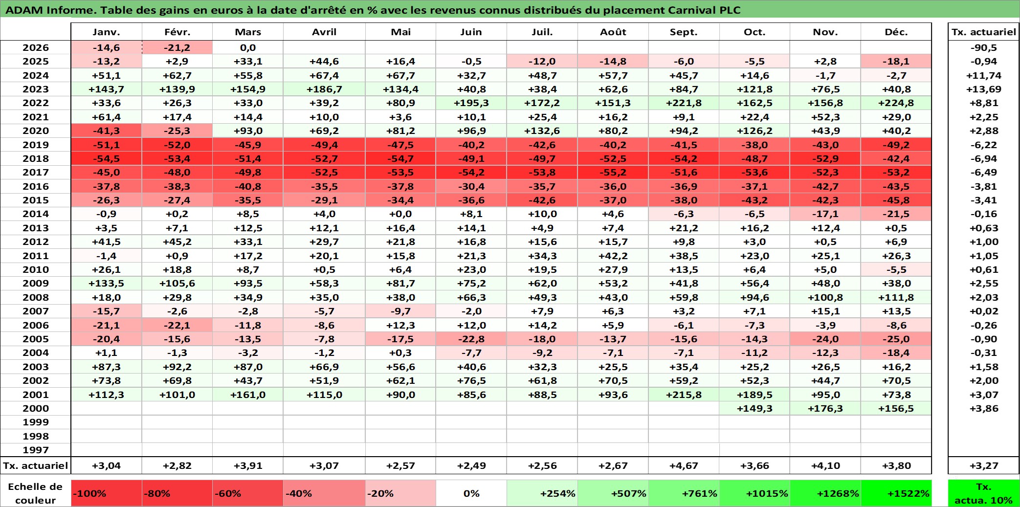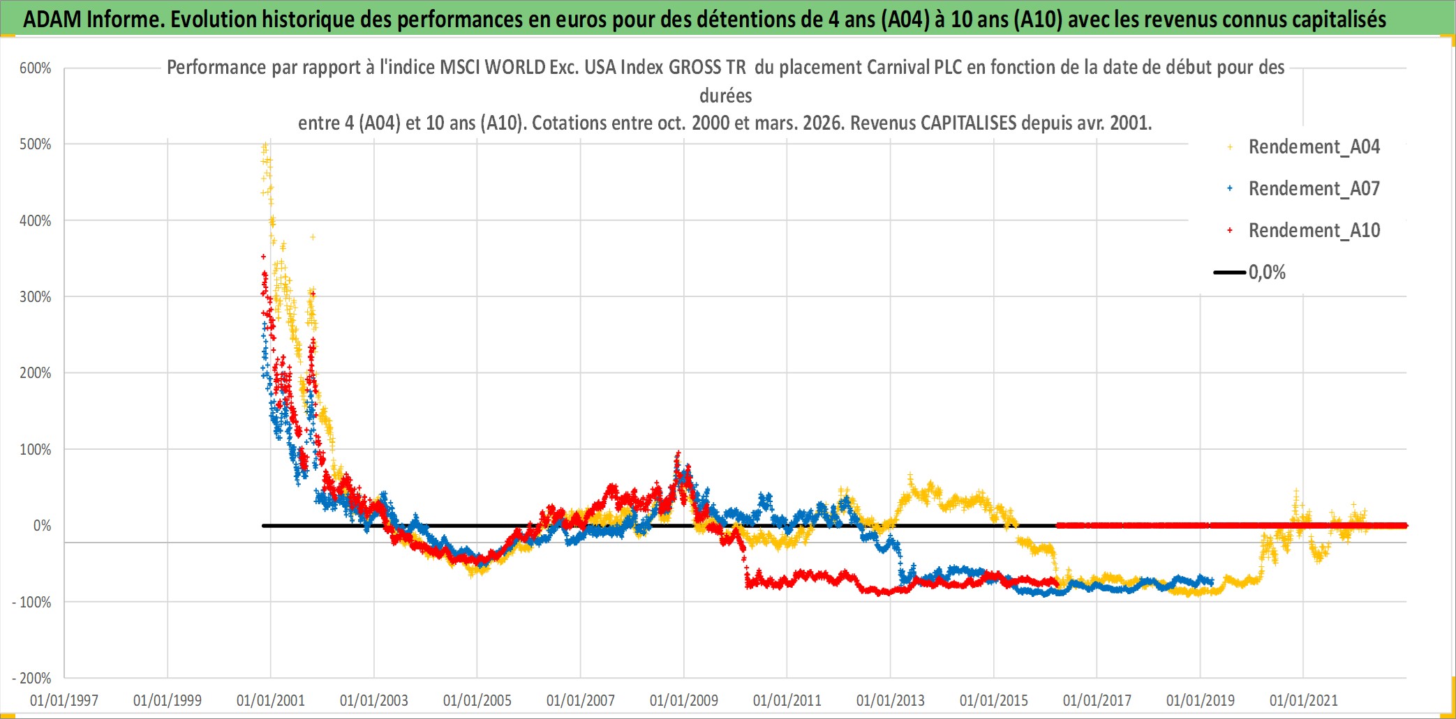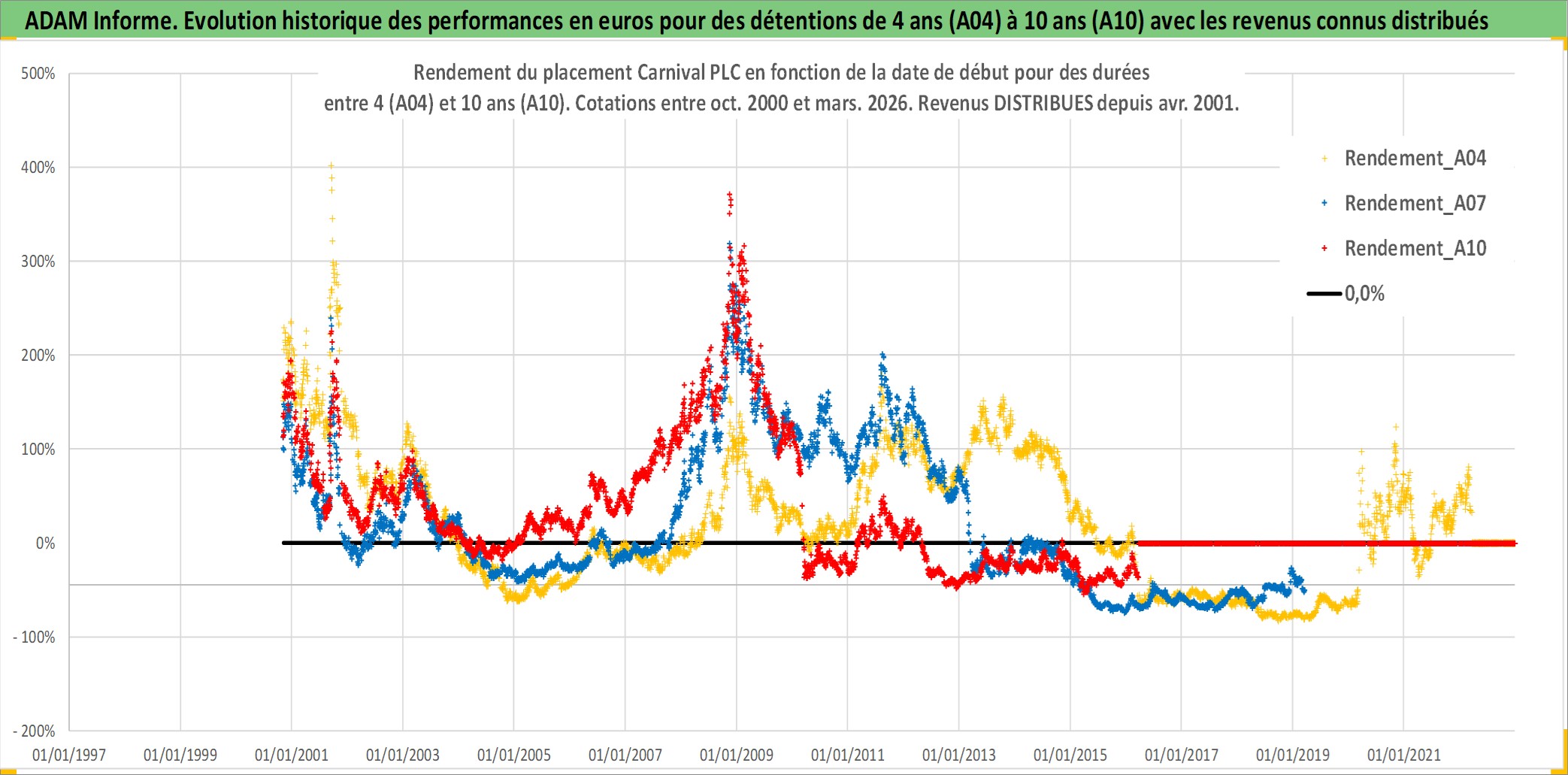 Site dédié aux investisseursPage dédiée sur site financeAnalyse des valorisations hebdomadaires de l'action Carnival PLC. Cet actif est cote en GBX. Les valorisations sont en contrevaleur EURO et couvrent les semaines 2000W43 a 2026W13. Les revenus de cet actif financier sont pris en compte depuis la semaine 2001W14. La note globale ESG de cet actif est estimee a 8.0 (apres rebasage entre 0 et 20).
