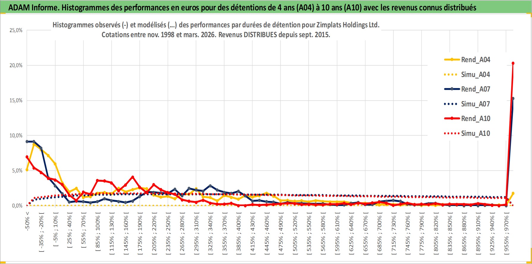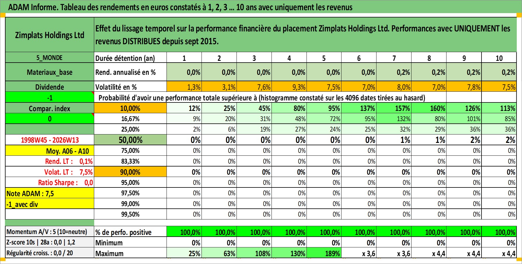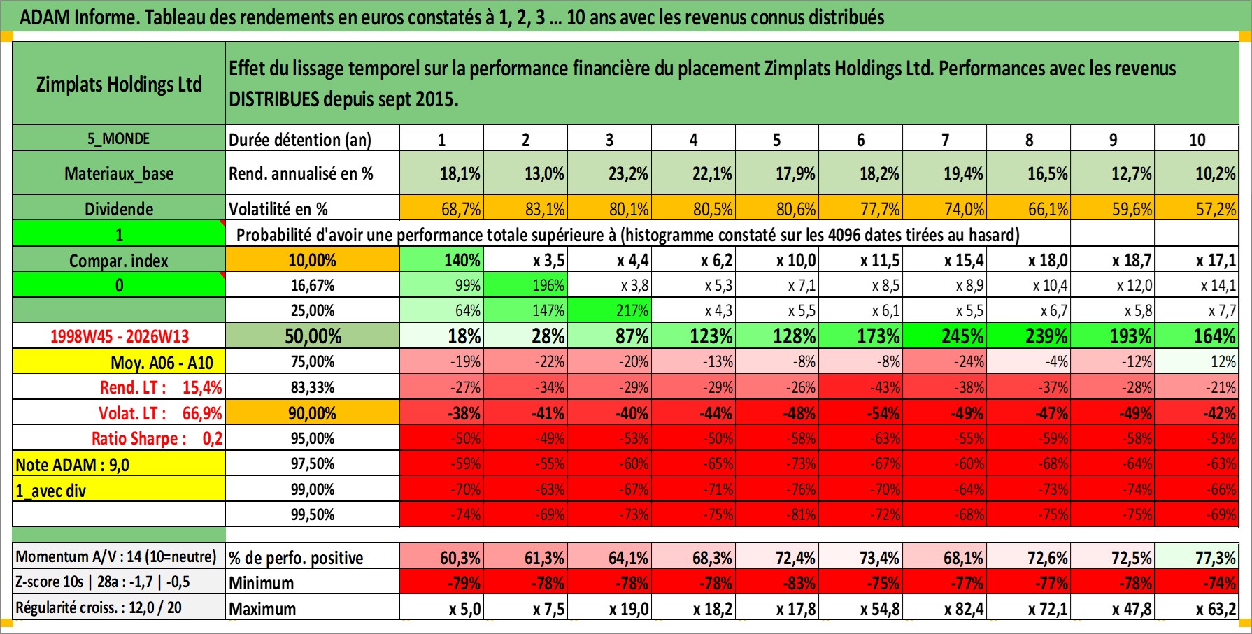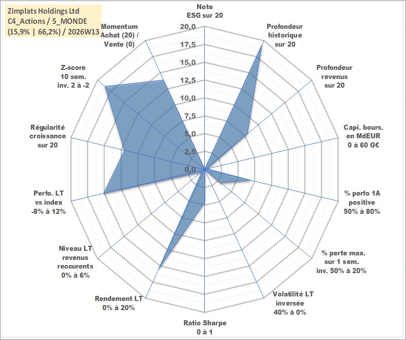 Site dédié aux investisseursPage dédiée sur site financeAnalyse des valorisations hebdomadaires de l'action Zimplats Holdings Ltd. Cet actif est cote en AUD. Les valorisations sont en contrevaleur EURO et couvrent les semaines 1998W45 a 2026W13. Les revenus de cet actif financier sont pris en compte depuis la semaine 2015W37. La note ESG de cet actif n'est pas connue.