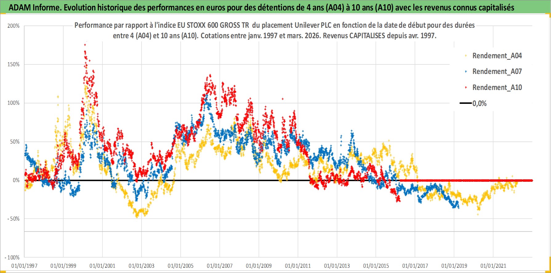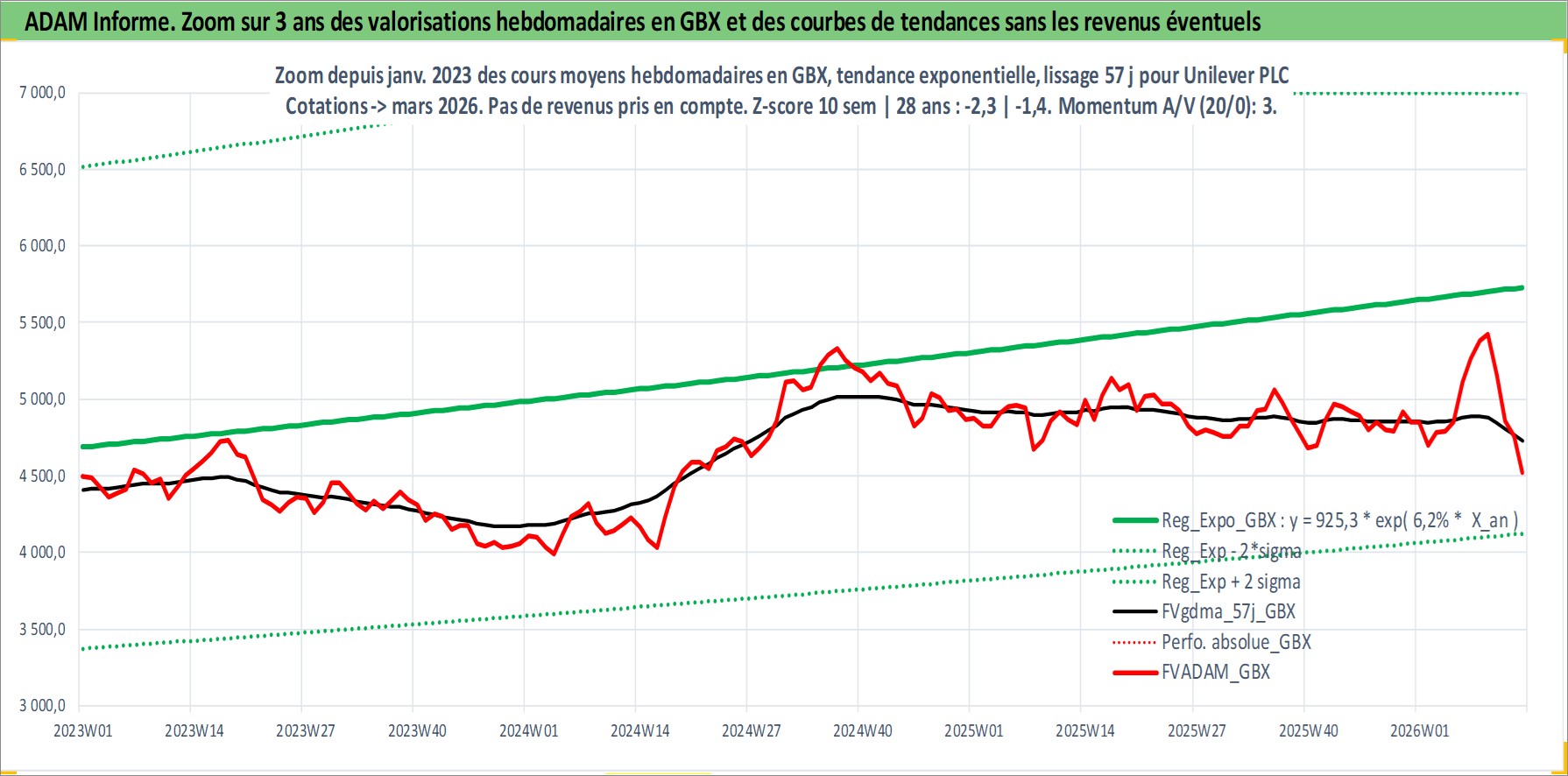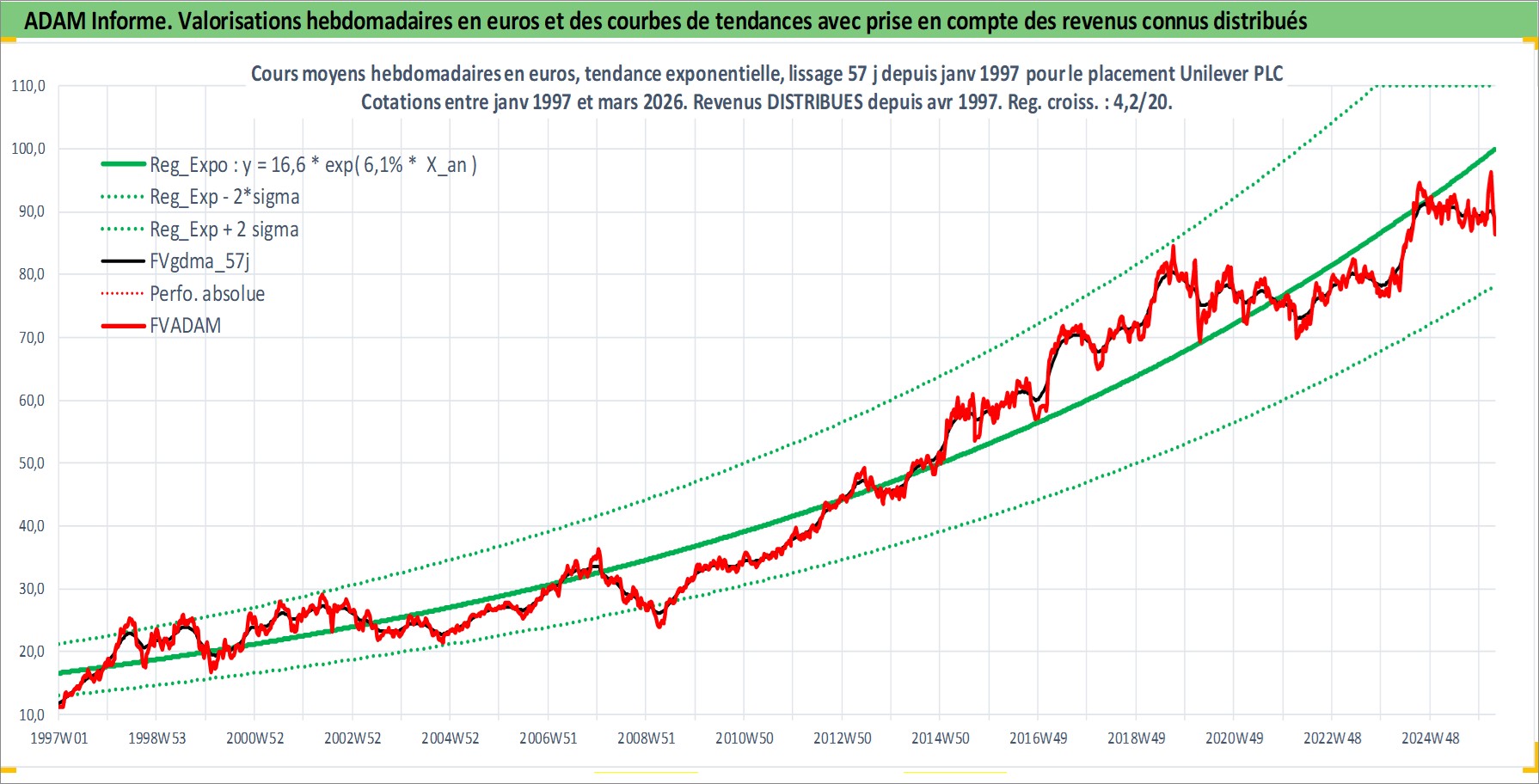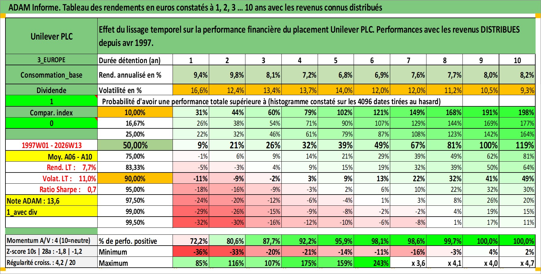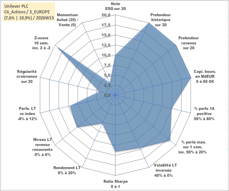 Site dédié aux investisseursPage dédiée sur site financeAnalyse des valorisations hebdomadaires de l'action Unilever PLC. Cet actif est cote en GBX. Les valorisations sont en contrevaleur EURO et couvrent les semaines 1997W01 a 2026W13. Les revenus de cet actif financier sont pris en compte depuis la semaine 1997W15. La note globale ESG de cet actif est estimee a 10.0 (apres rebasage entre 0 et 20).