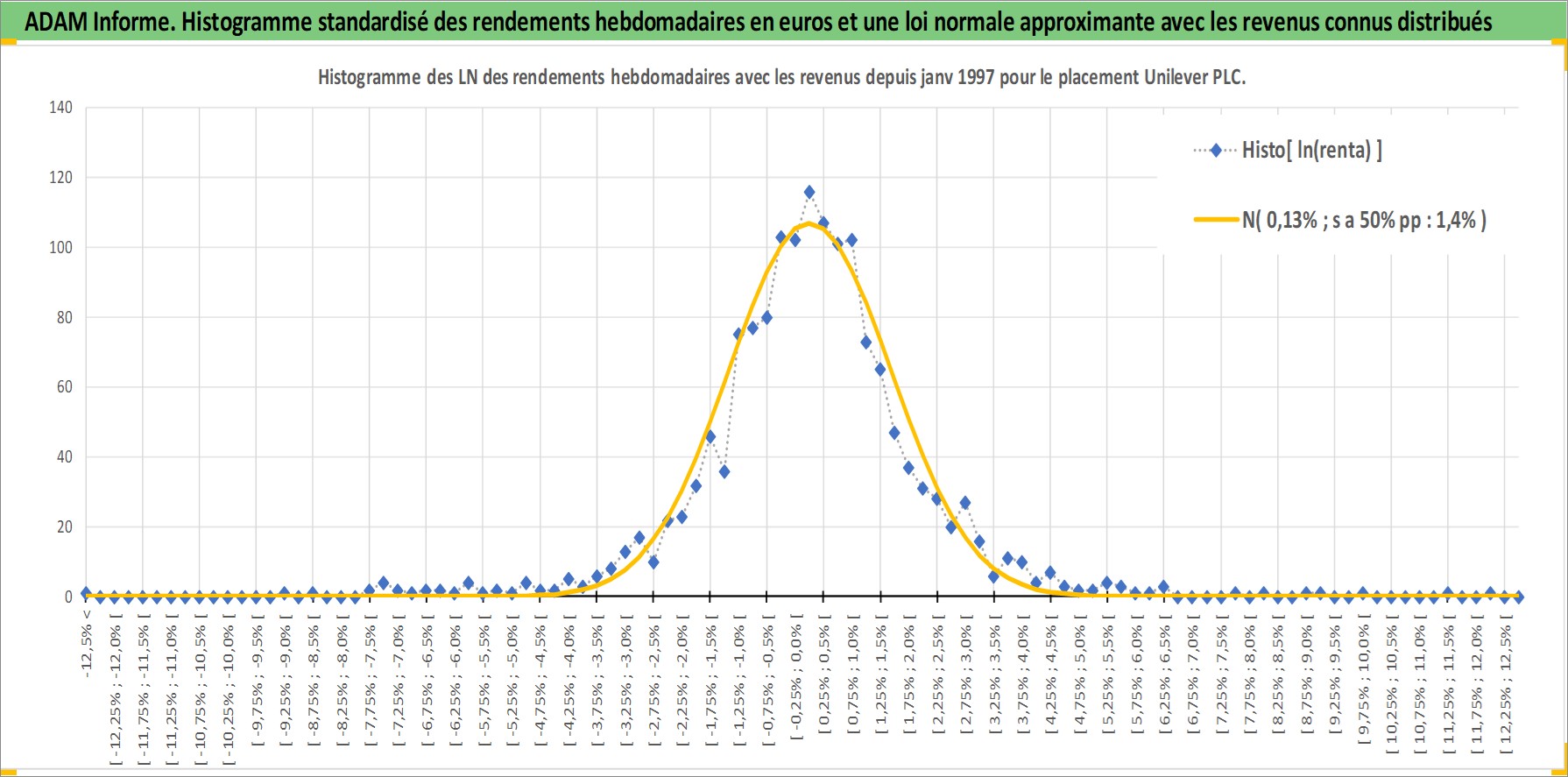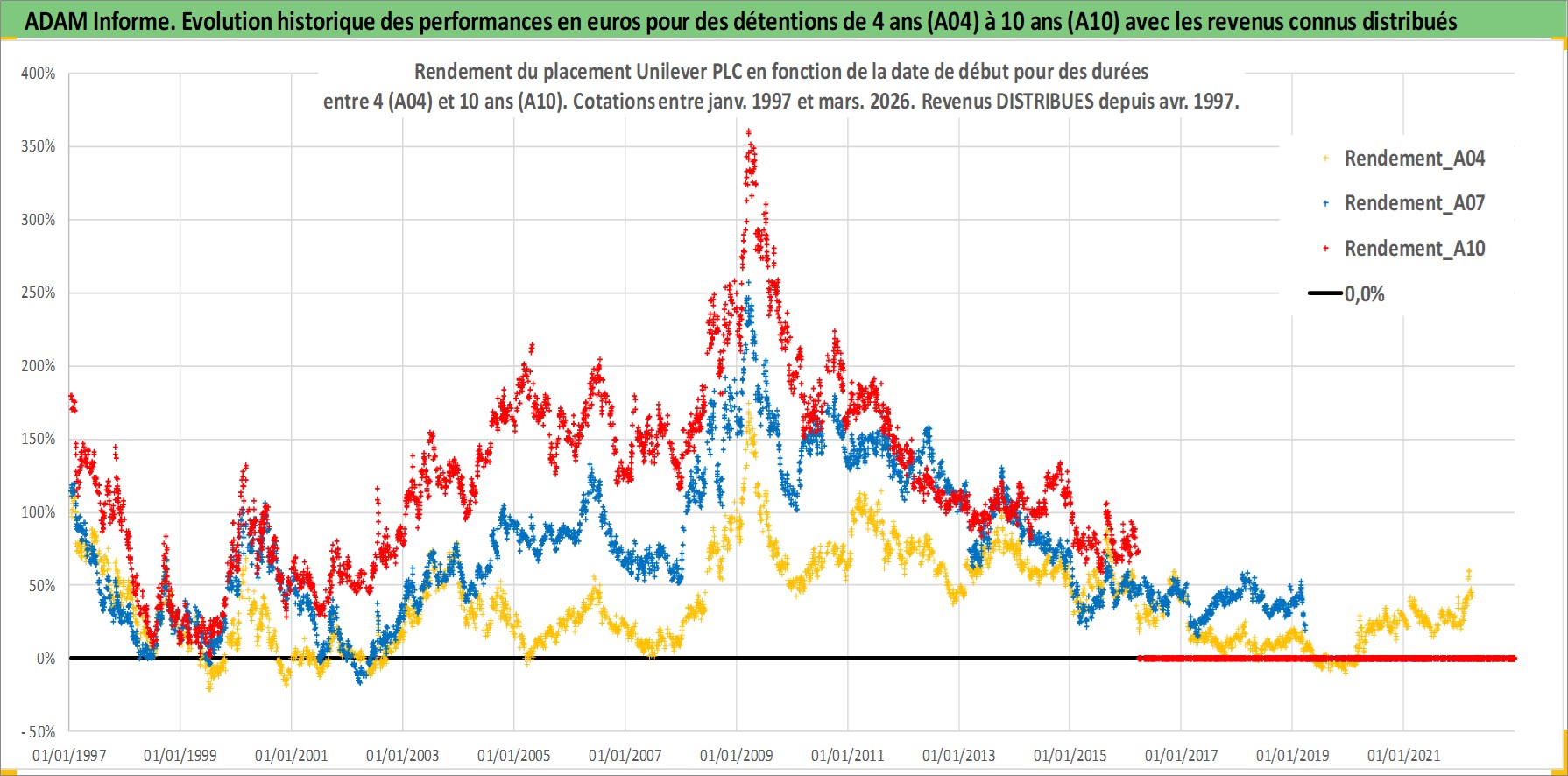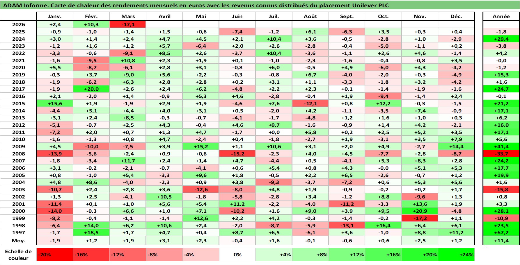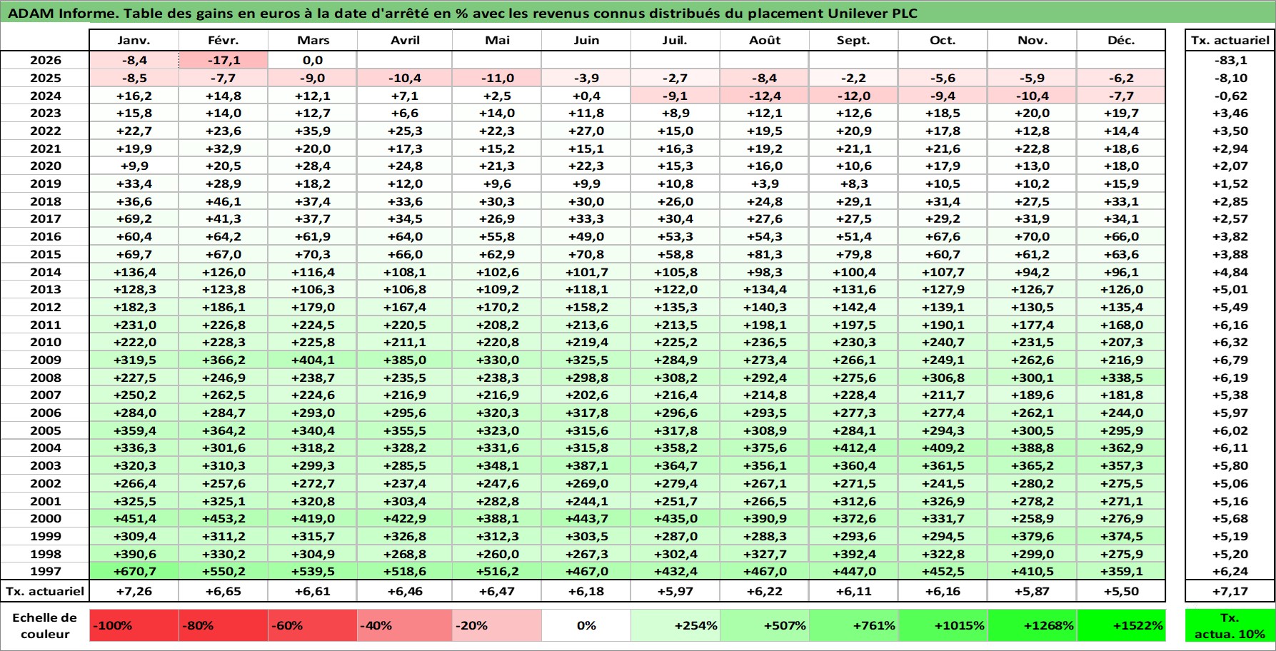 Site dédié aux investisseursPage dédiée sur site financeAnalyse des valorisations hebdomadaires de l'action Unilever PLC. Cet actif est cote en GBX. Les valorisations sont en contrevaleur EURO et couvrent les semaines 1997W01 a 2026W13. Les revenus de cet actif financier sont pris en compte depuis la semaine 1997W15. La note globale ESG de cet actif est estimee a 10.0 (apres rebasage entre 0 et 20).