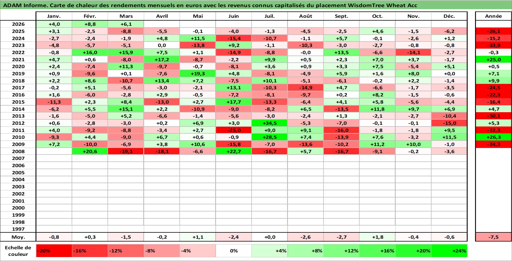 Site dédié aux investisseursPage dédiée sur site financeAnalyse des valorisations hebdomadaires du fonds WisdomTree Wheat Acc. Cet actif est cote en EUR. Les valorisations couvrent les semaines 2008W01 a 2026W13. Les revenus de cet actif financier sont pris en compte depuis la semaine 2008W01. La note ESG de cet actif n'est pas connue.