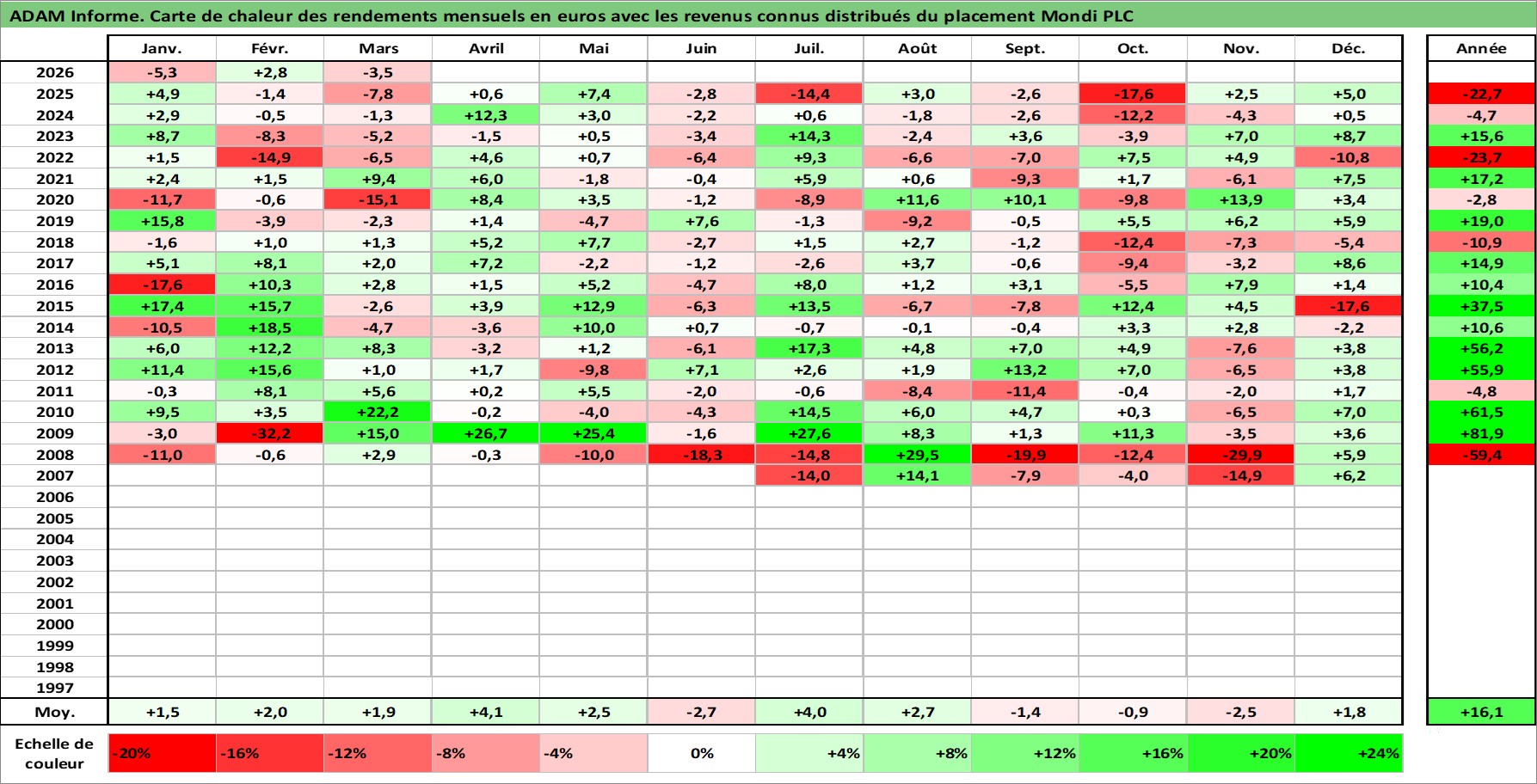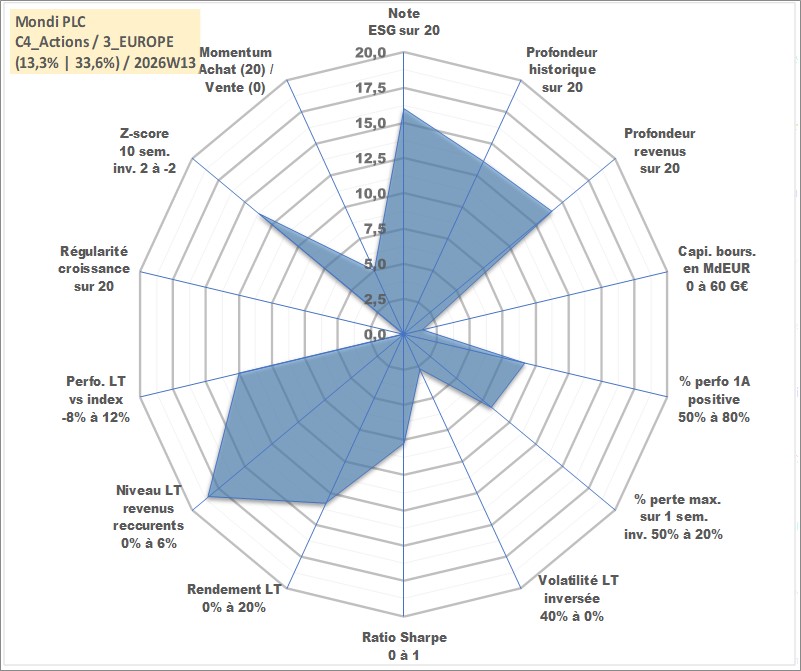 Site dédié aux investisseursPage dédiée sur site financeAnalyse des valorisations hebdomadaires de l'action Mondi PLC. Cet actif est cote en GBX. Les valorisations sont en contrevaleur EURO et couvrent les semaines 2007W26 a 2026W13. Les revenus de cet actif financier sont pris en compte depuis la semaine 2007W35. La note globale ESG de cet actif est estimee a 16.0 (apres rebasage entre 0 et 20).