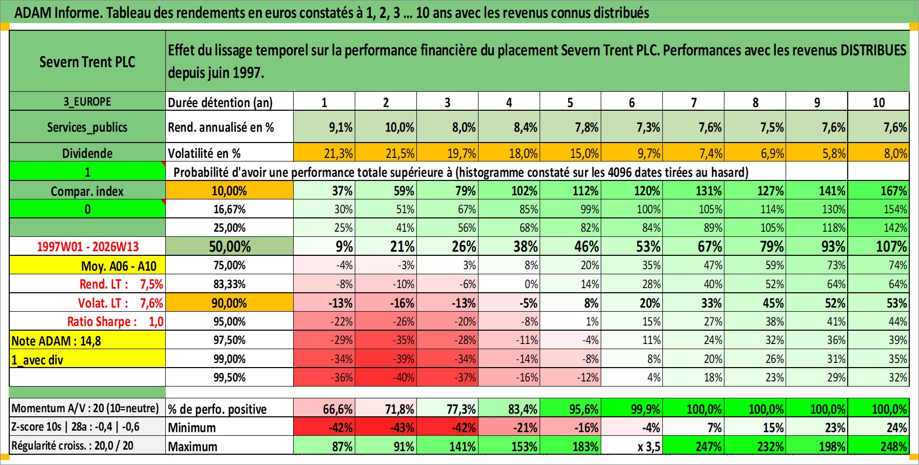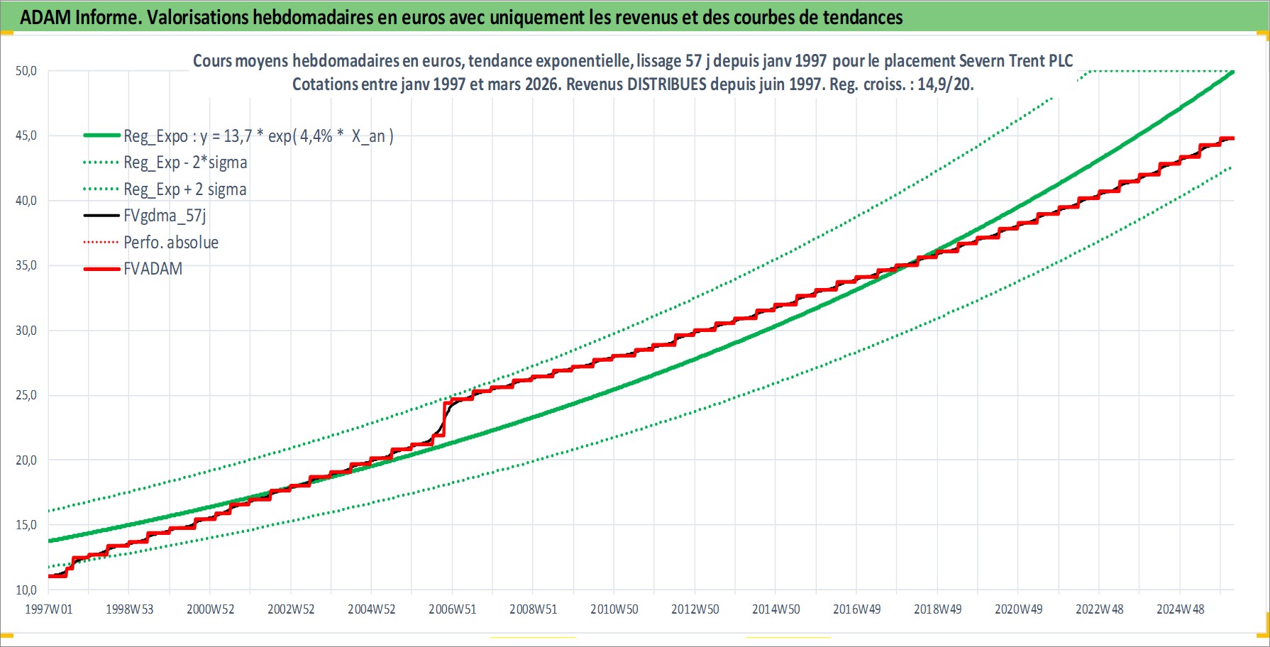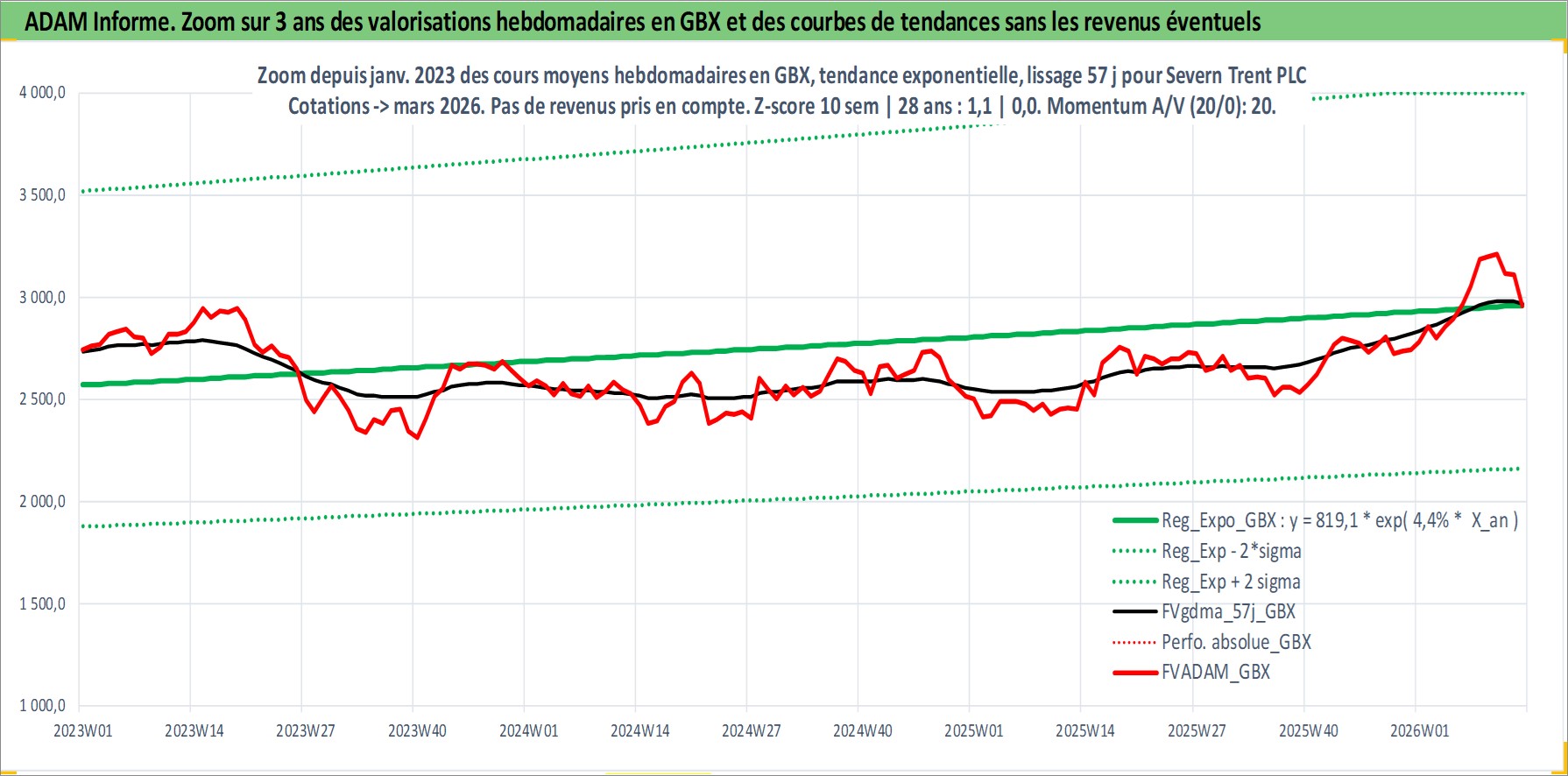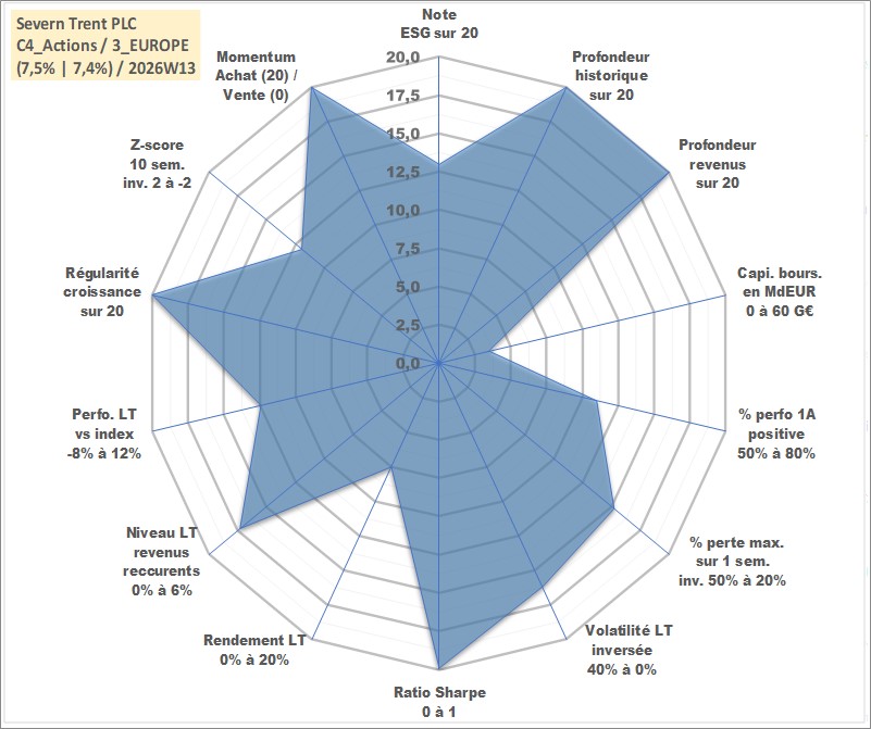 Site dédié aux investisseursPage dédiée sur site financeAnalyse des valorisations hebdomadaires de l'action Severn Trent PLC. Cet actif est cote en GBX. Les valorisations sont en contrevaleur EURO et couvrent les semaines 1997W01 a 2026W13. Les revenus de cet actif financier sont pris en compte depuis la semaine 1997W25. La note globale ESG de cet actif est estimee a 13.0 (apres rebasage entre 0 et 20).