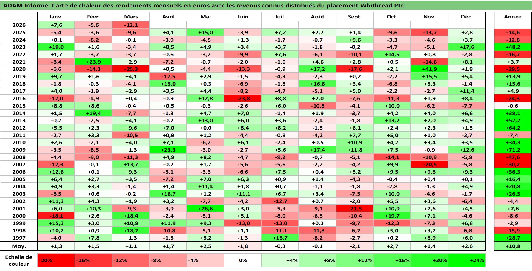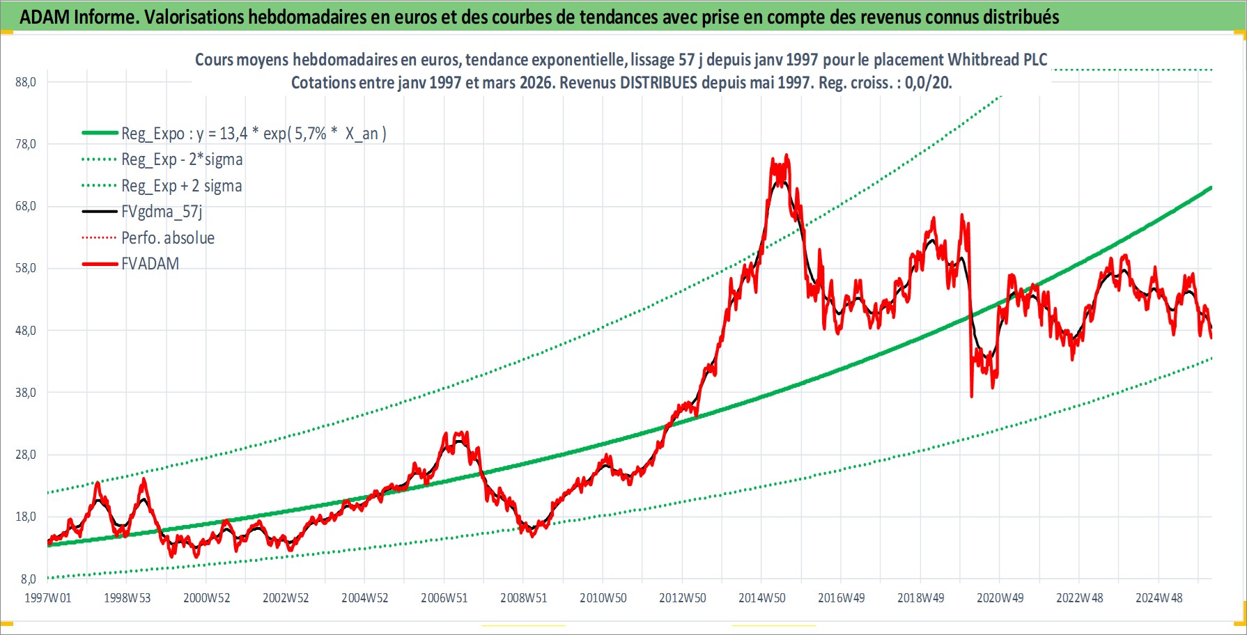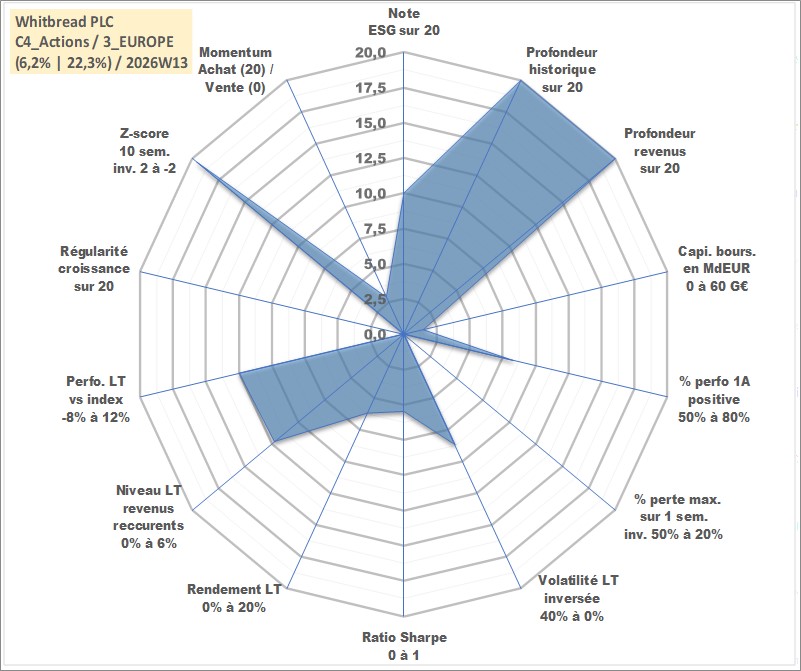 Site dédié aux investisseursPage dédiée sur site financeAnalyse des valorisations hebdomadaires de l'action Whitbread PLC. Cet actif est cote en GBX. Les valorisations sont en contrevaleur EURO et couvrent les semaines 1997W01 a 2026W13. Les revenus de cet actif financier sont pris en compte depuis la semaine 1997W21. La note globale ESG de cet actif est estimee a 10.0 (apres rebasage entre 0 et 20).