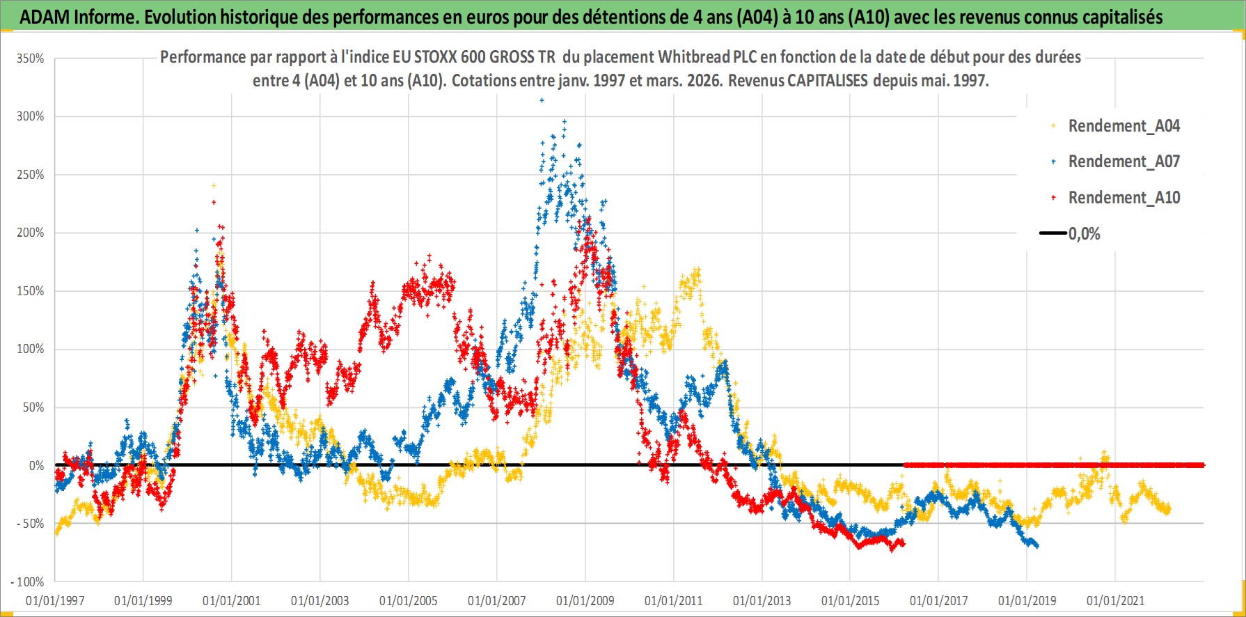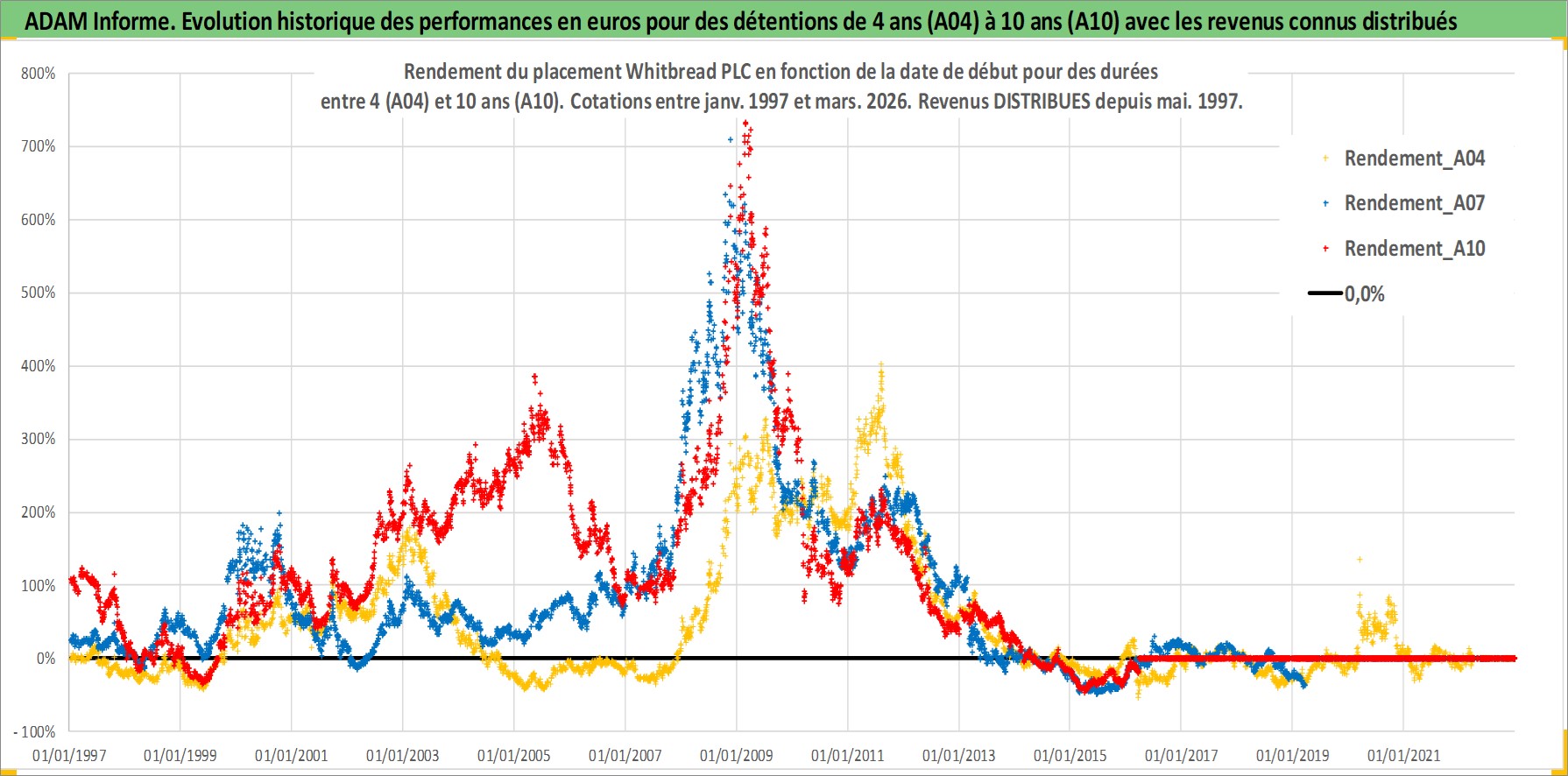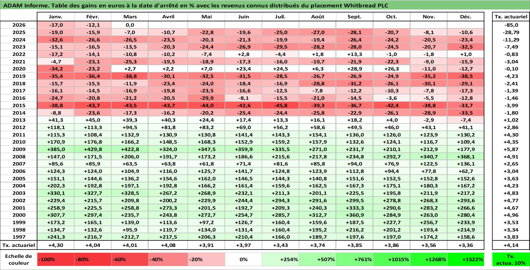 Site dédié aux investisseursPage dédiée sur site financeAnalyse des valorisations hebdomadaires de l'action Whitbread PLC. Cet actif est cote en GBX. Les valorisations sont en contrevaleur EURO et couvrent les semaines 1997W01 a 2026W13. Les revenus de cet actif financier sont pris en compte depuis la semaine 1997W21. La note globale ESG de cet actif est estimee a 10.0 (apres rebasage entre 0 et 20).