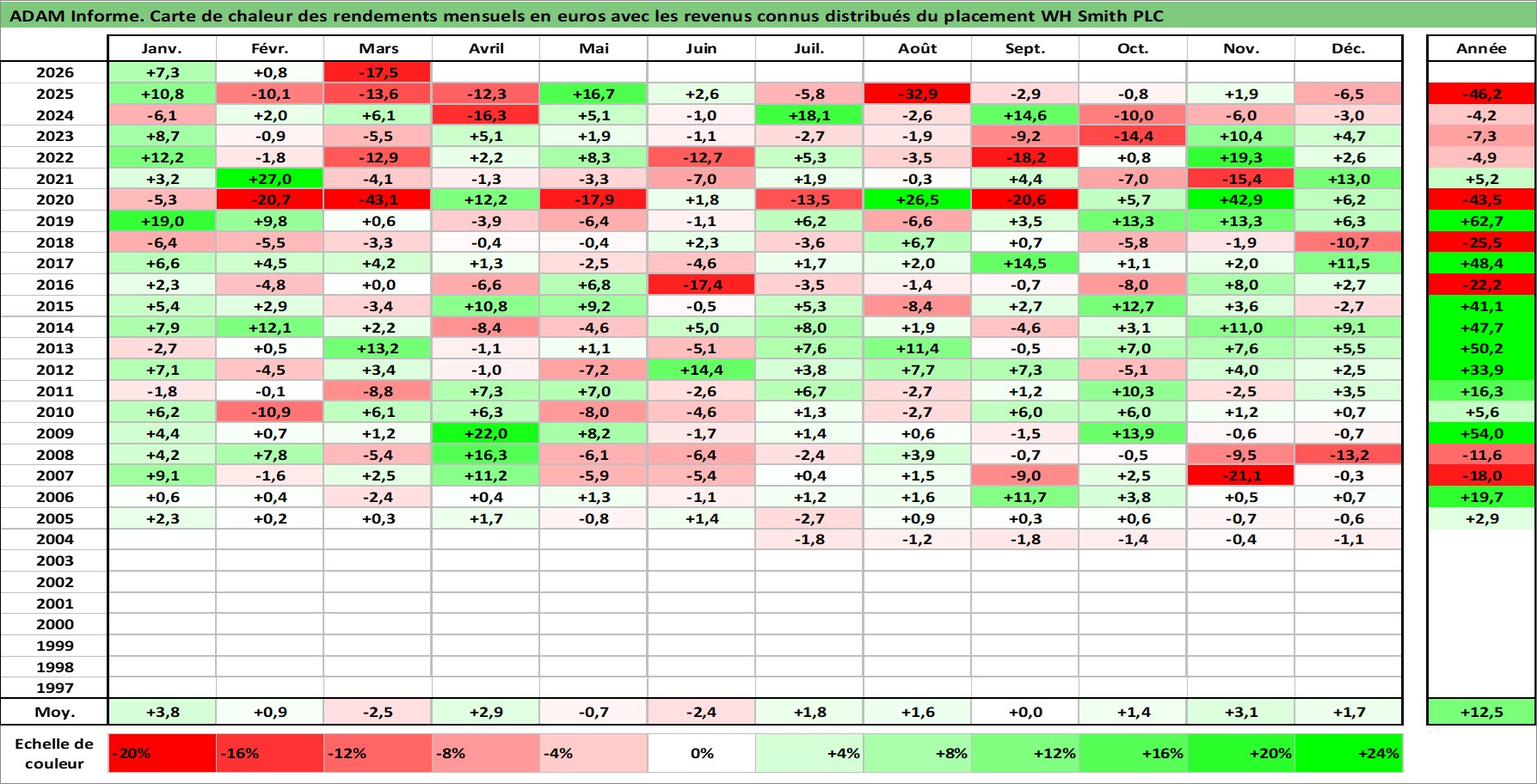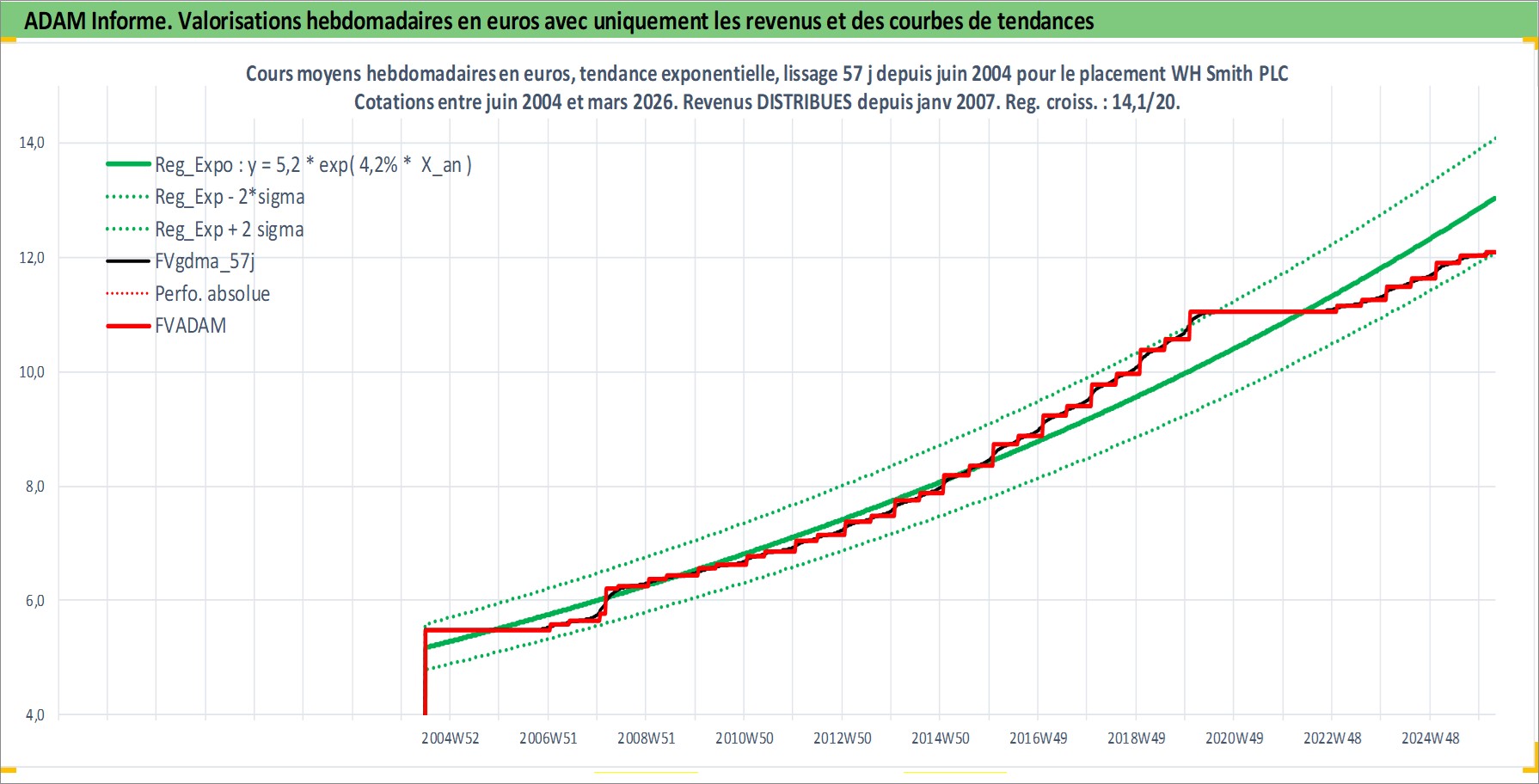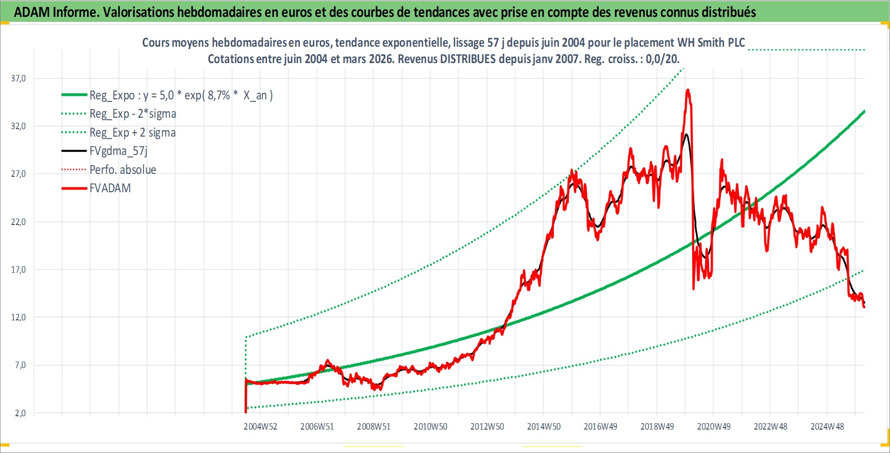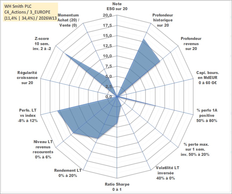 Site dédié aux investisseursPage dédiée sur site financeAnalyse des valorisations hebdomadaires de l'action WH Smith PLC. Cet actif est cote en GBX. Les valorisations sont en contrevaleur EURO et couvrent les semaines 2004W25 a 2026W13. Les revenus de cet actif financier sont pris en compte depuis la semaine 2007W01. La note ESG de cet actif n'est pas connue.