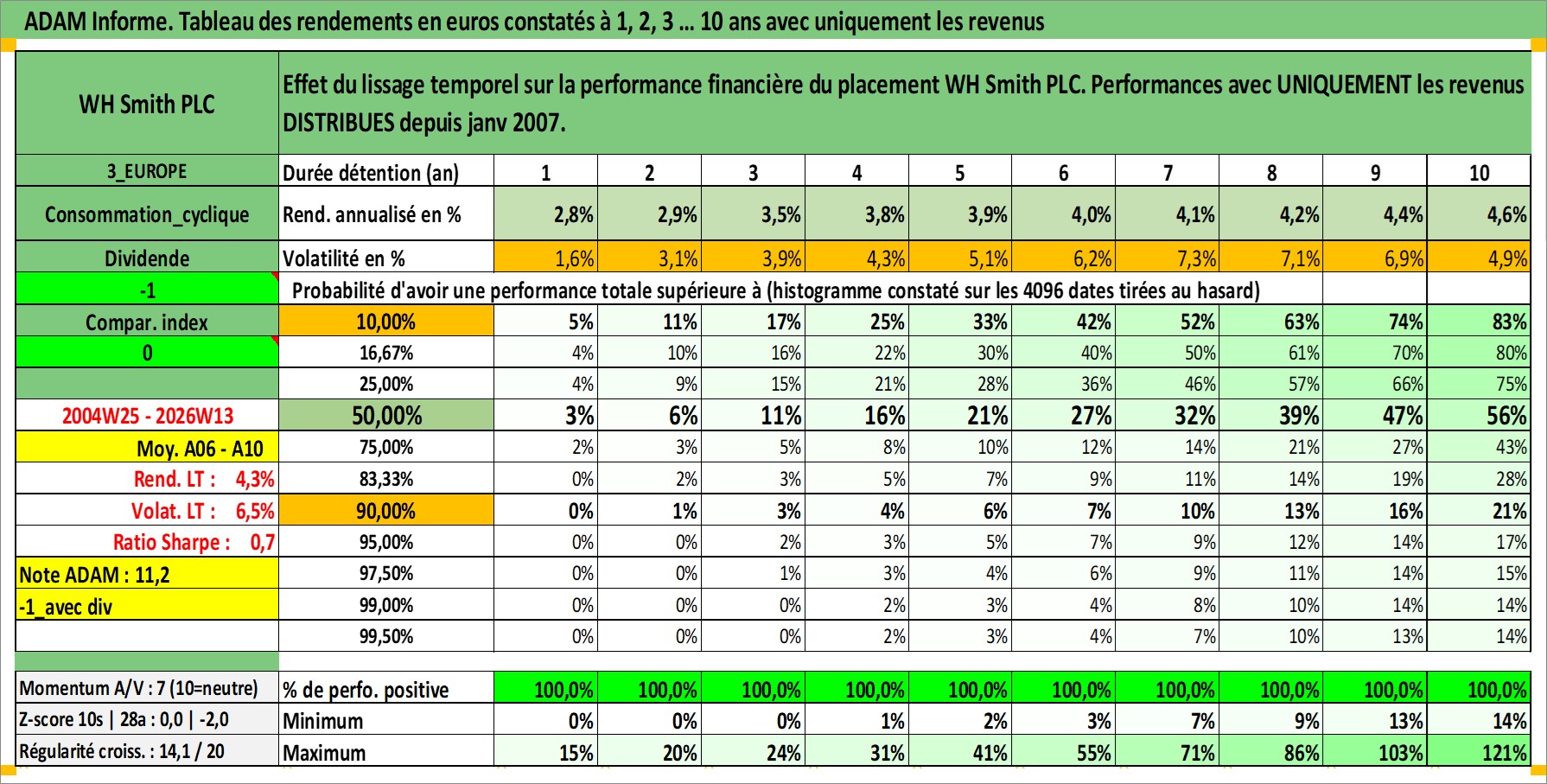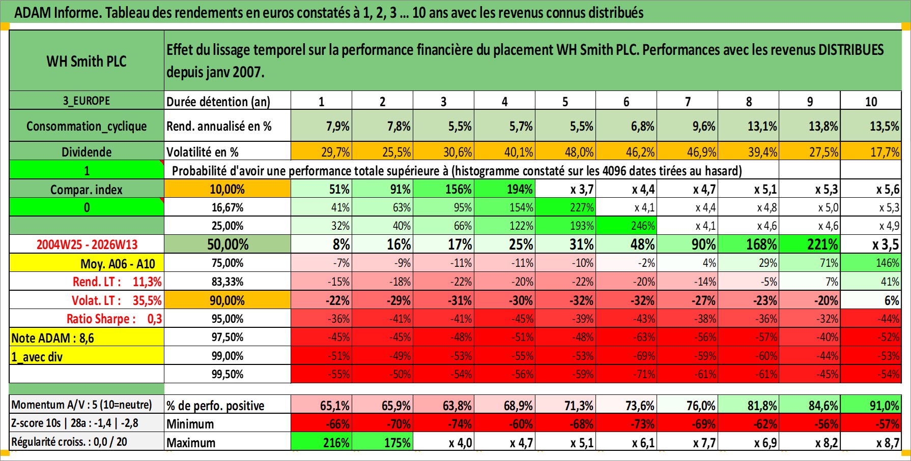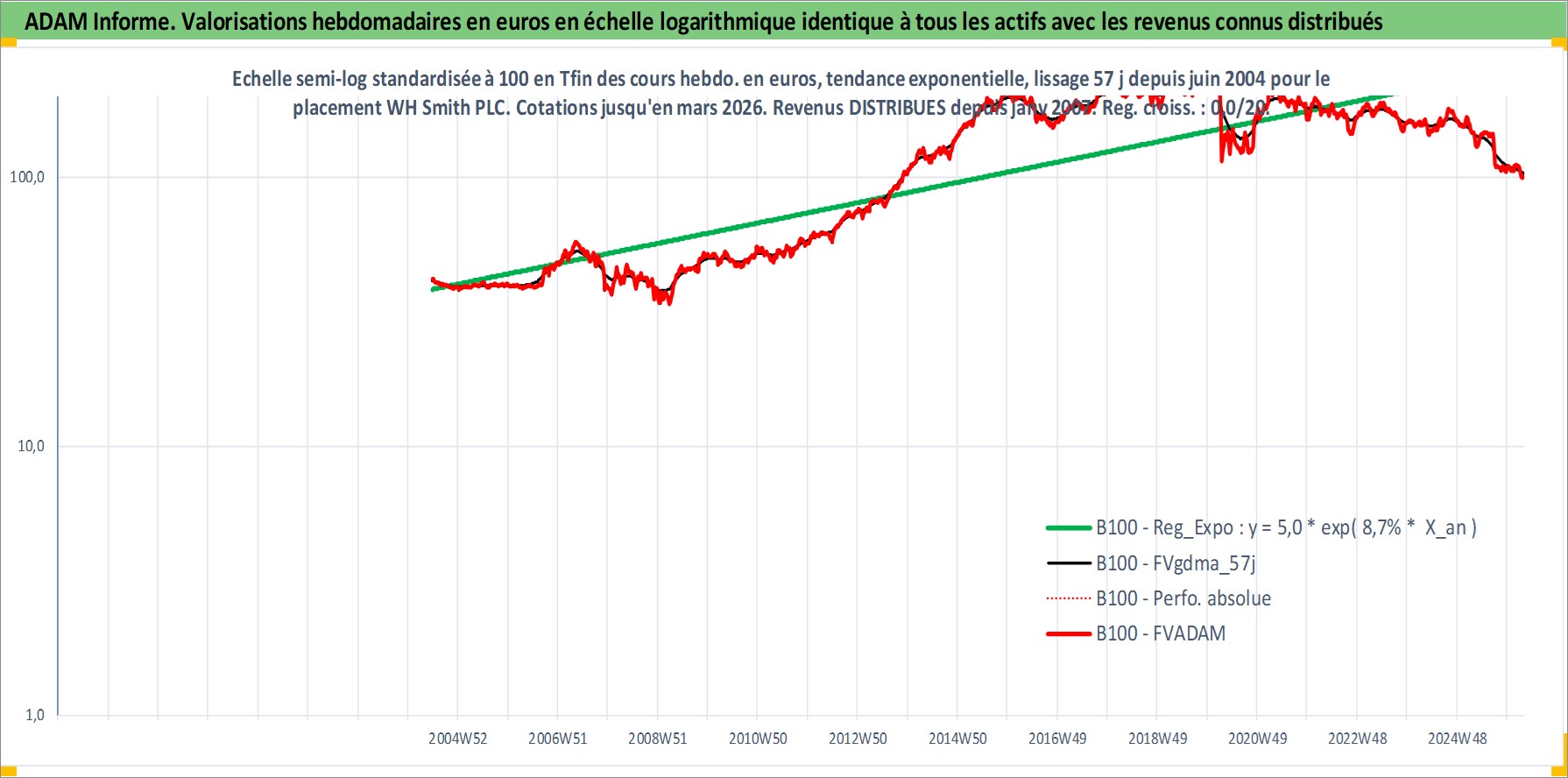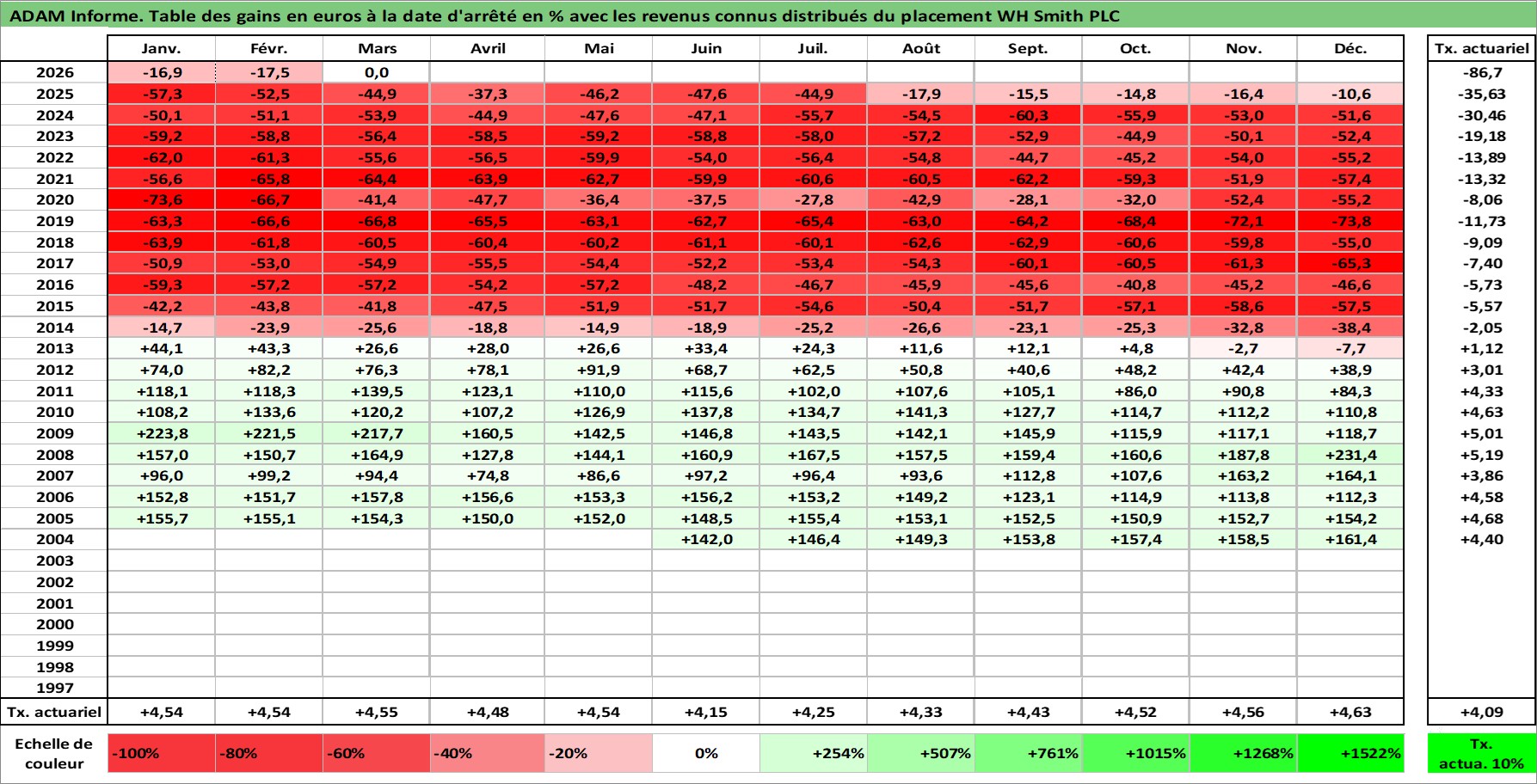 Site dédié aux investisseursPage dédiée sur site financeAnalyse des valorisations hebdomadaires de l'action WH Smith PLC. Cet actif est cote en GBX. Les valorisations sont en contrevaleur EURO et couvrent les semaines 2004W25 a 2026W13. Les revenus de cet actif financier sont pris en compte depuis la semaine 2007W01. La note ESG de cet actif n'est pas connue.