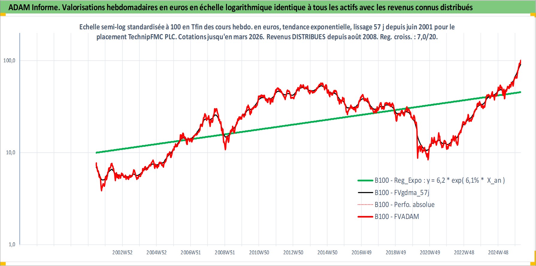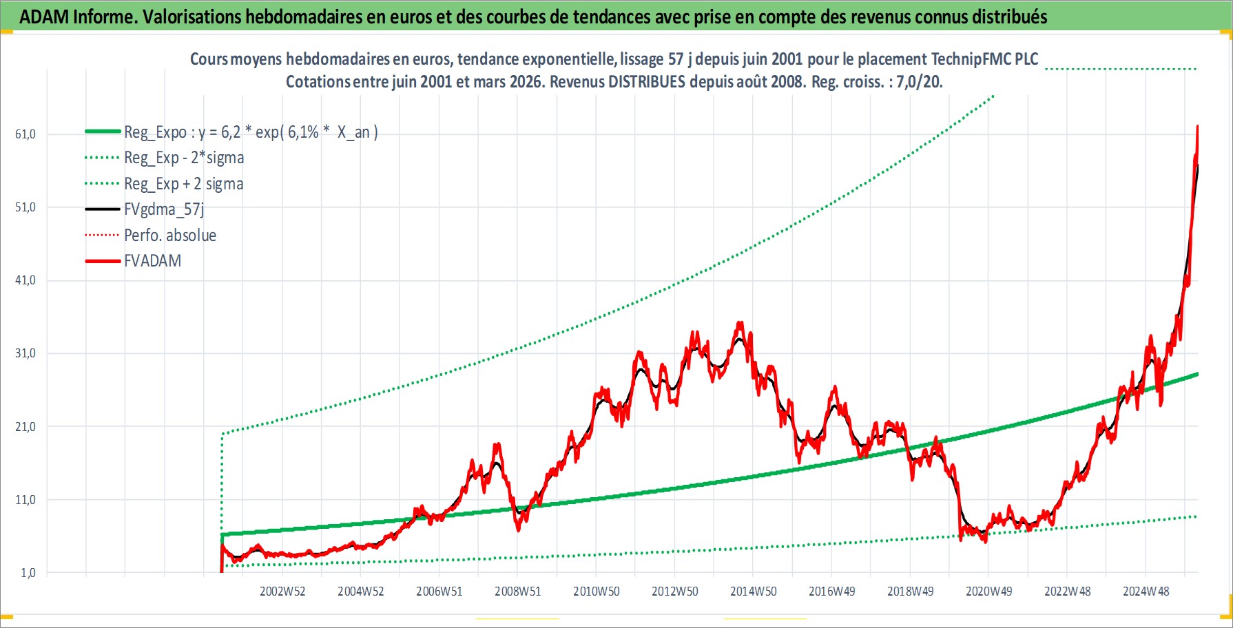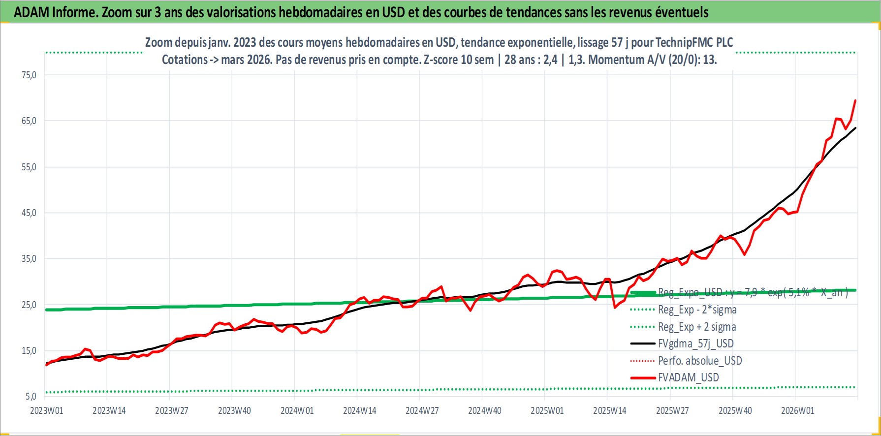 Site dédié aux investisseursPage dédiée sur site financeAnalyse des valorisations hebdomadaires de l'action TechnipFMC PLC. Cet actif est cote en USD. Les valorisations sont en contrevaleur EURO et couvrent les semaines 2001W24 a 2026W13. Les revenus de cet actif financier sont pris en compte depuis la semaine 2008W31. La note ESG de cet actif n'est pas connue.
