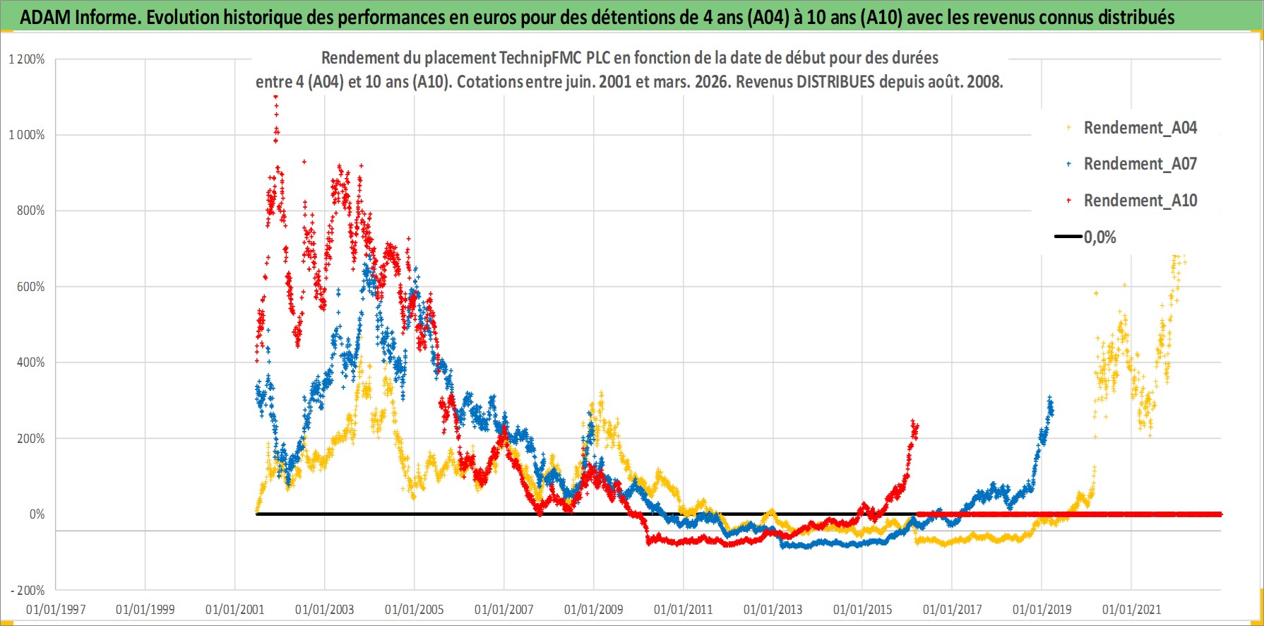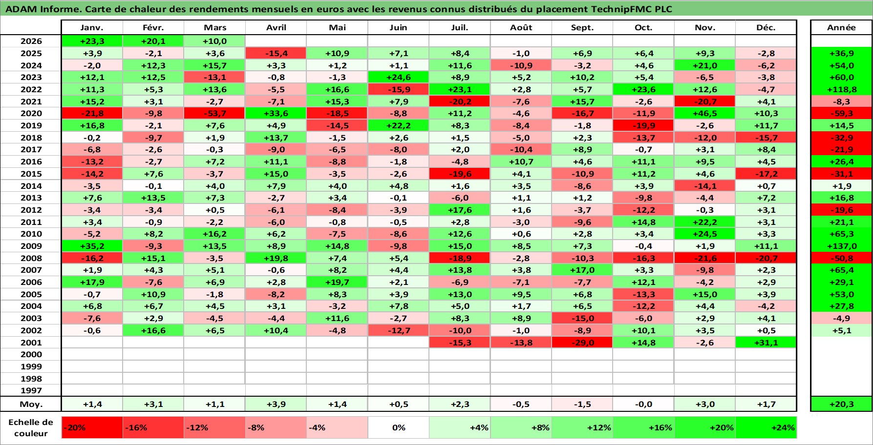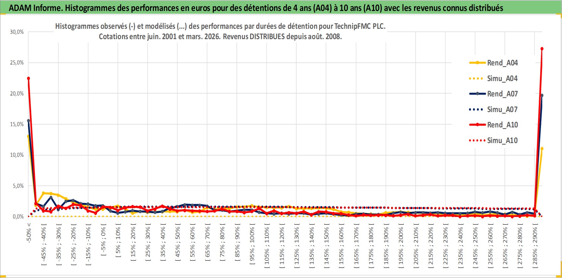 Site dédié aux investisseursPage dédiée sur site financeAnalyse des valorisations hebdomadaires de l'action TechnipFMC PLC. Cet actif est cote en USD. Les valorisations sont en contrevaleur EURO et couvrent les semaines 2001W24 a 2026W13. Les revenus de cet actif financier sont pris en compte depuis la semaine 2008W31. La note ESG de cet actif n'est pas connue.