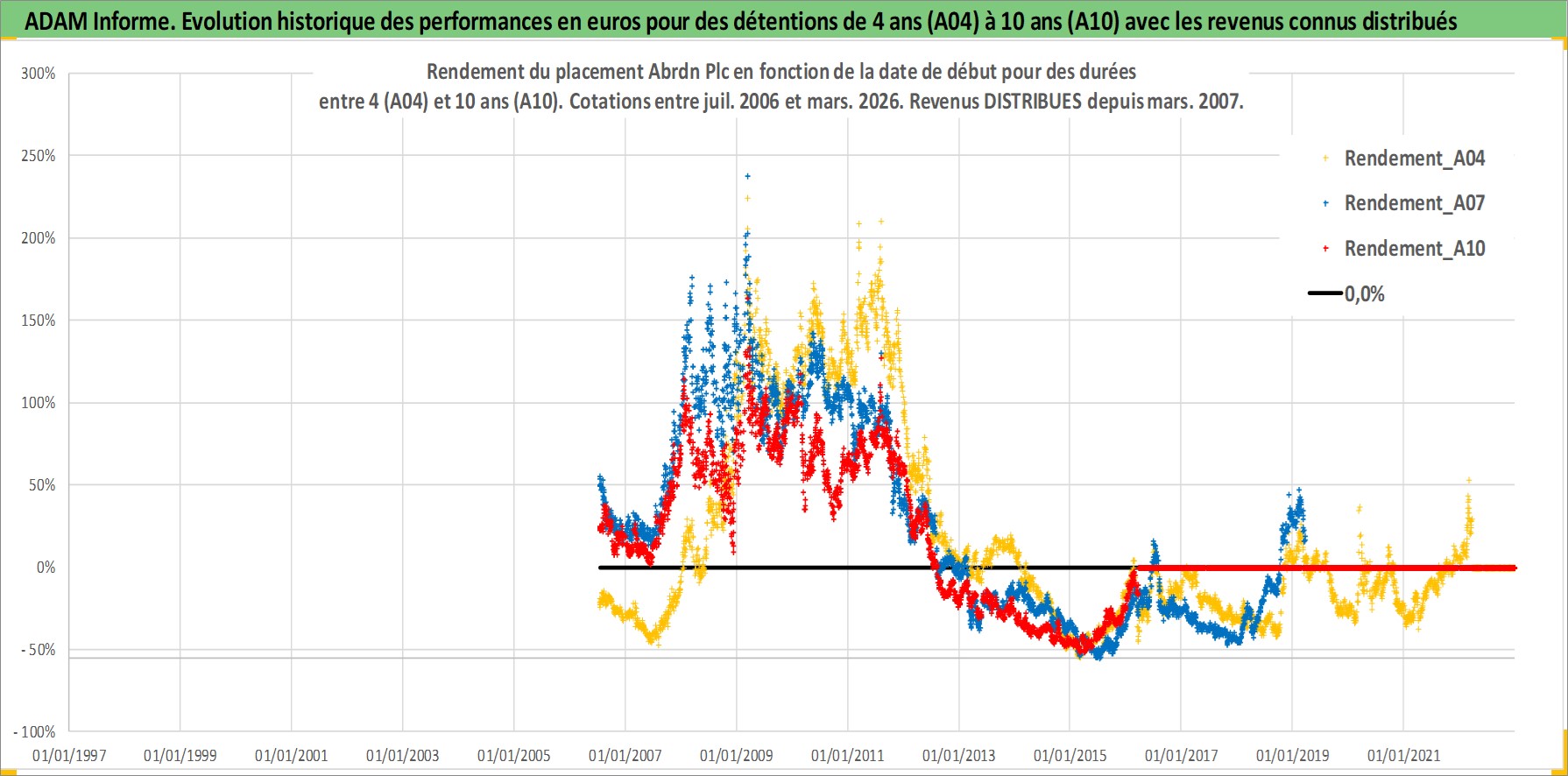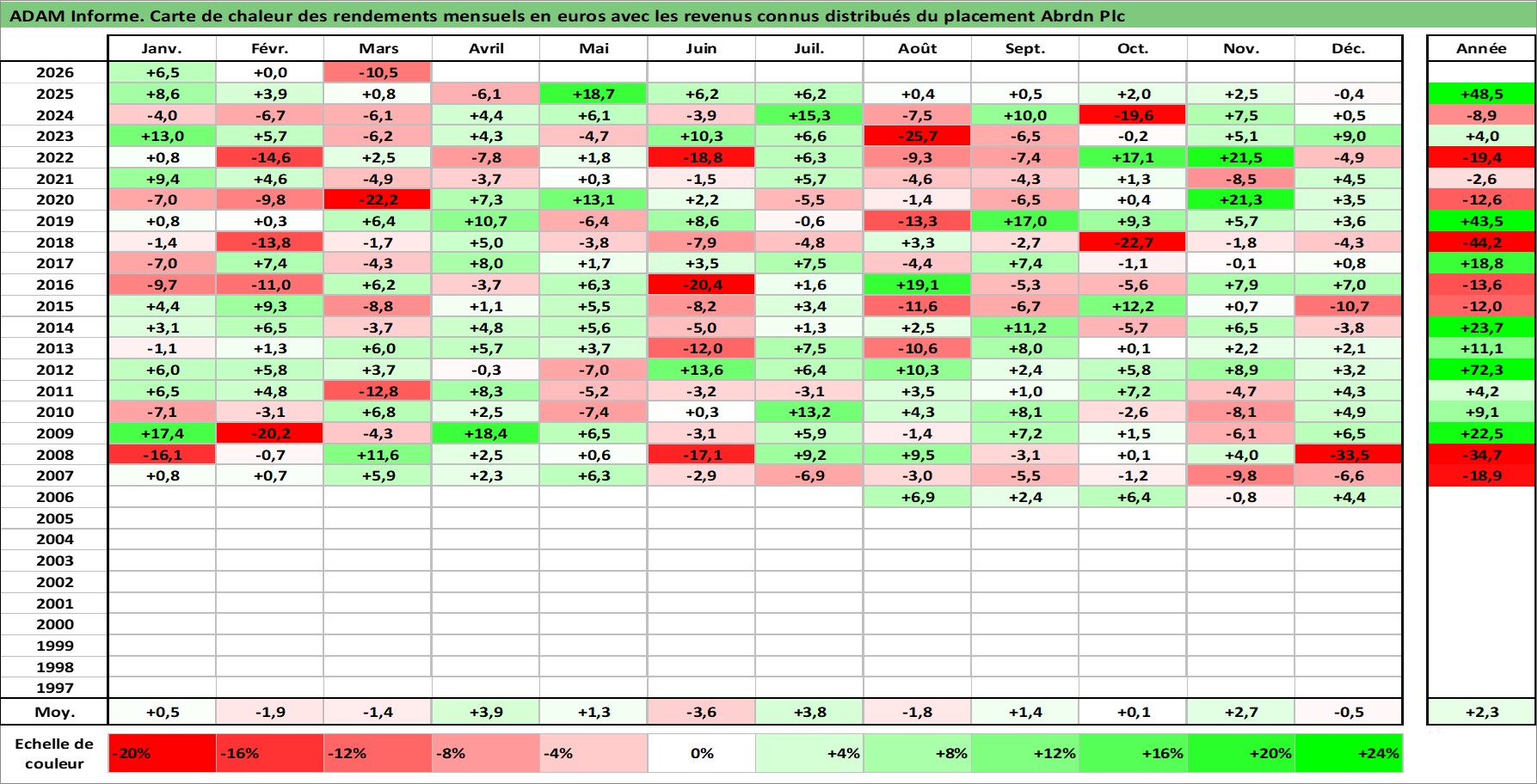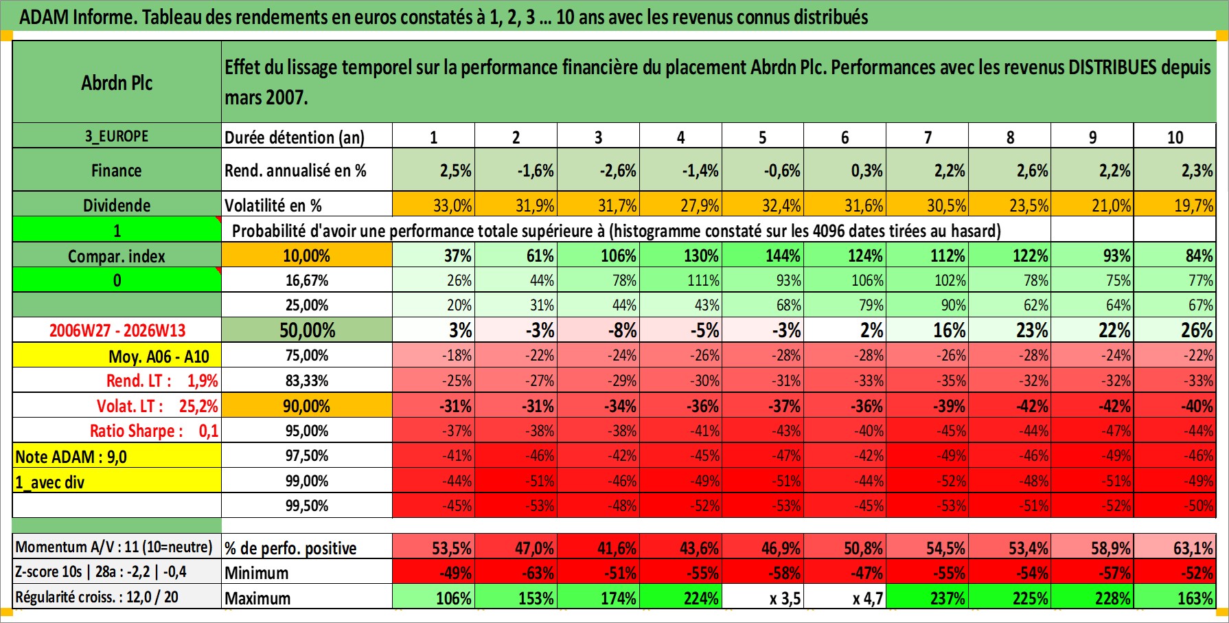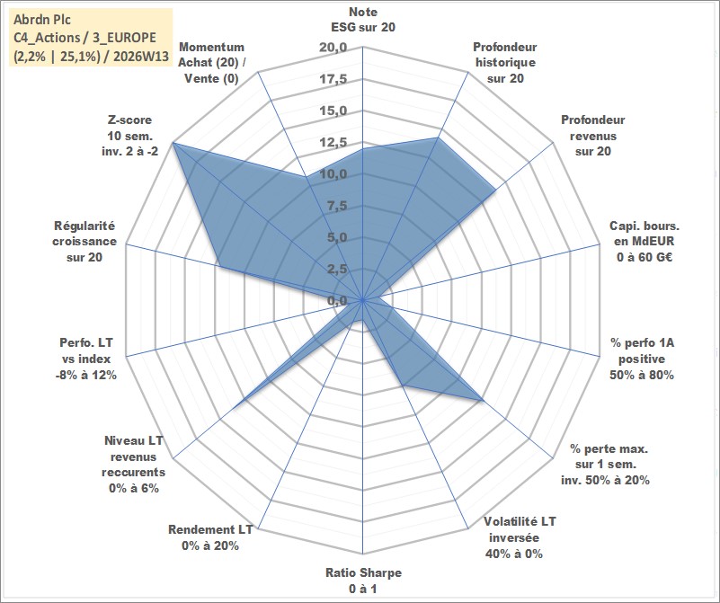 Site dédié aux investisseursPage dédiée sur site financeAnalyse des valorisations hebdomadaires de l'action Abrdn Plc. Cet actif est cote en GBX. Les valorisations sont en contrevaleur EURO et couvrent les semaines 2006W27 a 2026W13. Les revenus de cet actif financier sont pris en compte depuis la semaine 2007W13. La note globale ESG de cet actif est estimee a 12.0 (apres rebasage entre 0 et 20).