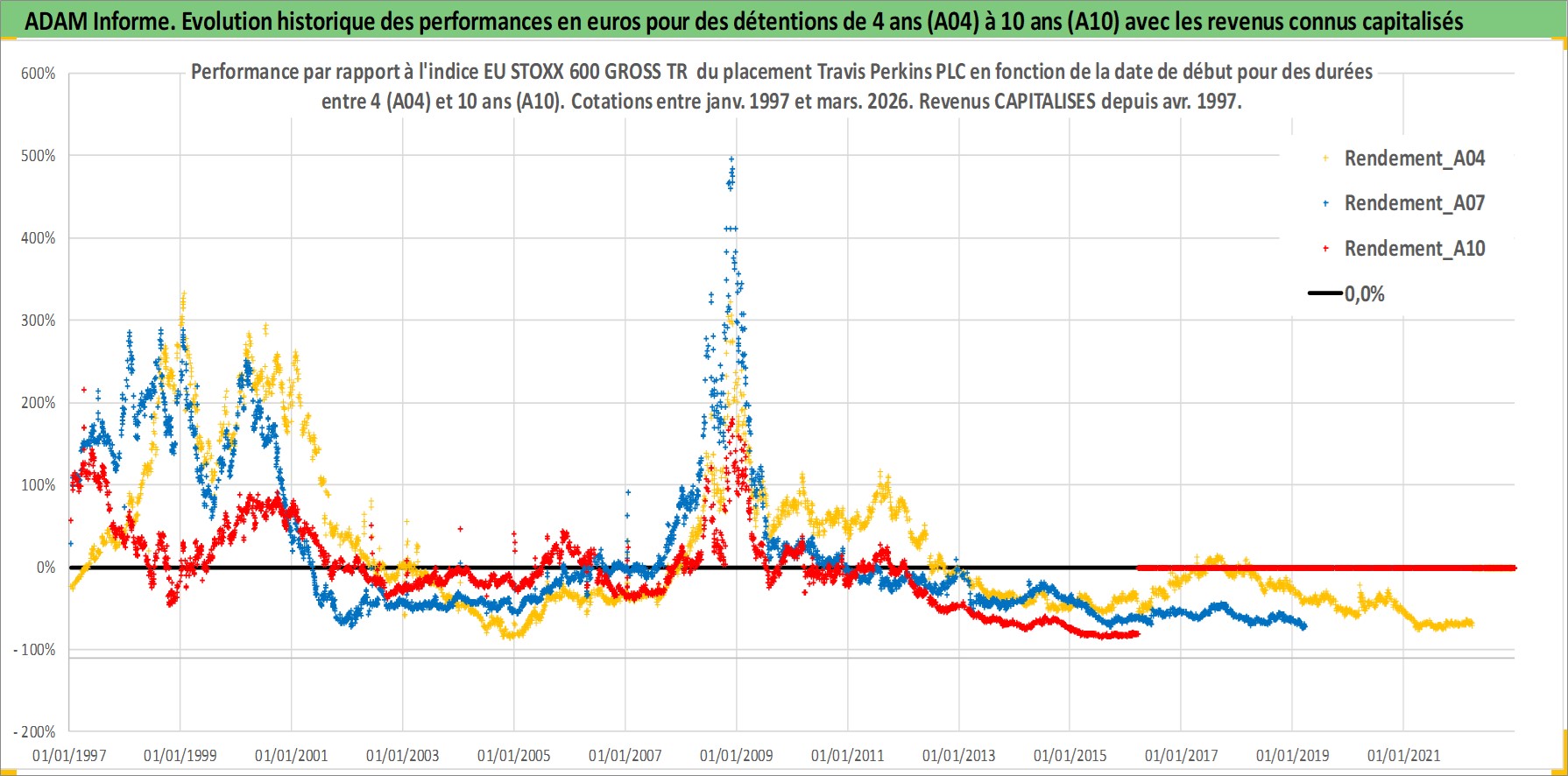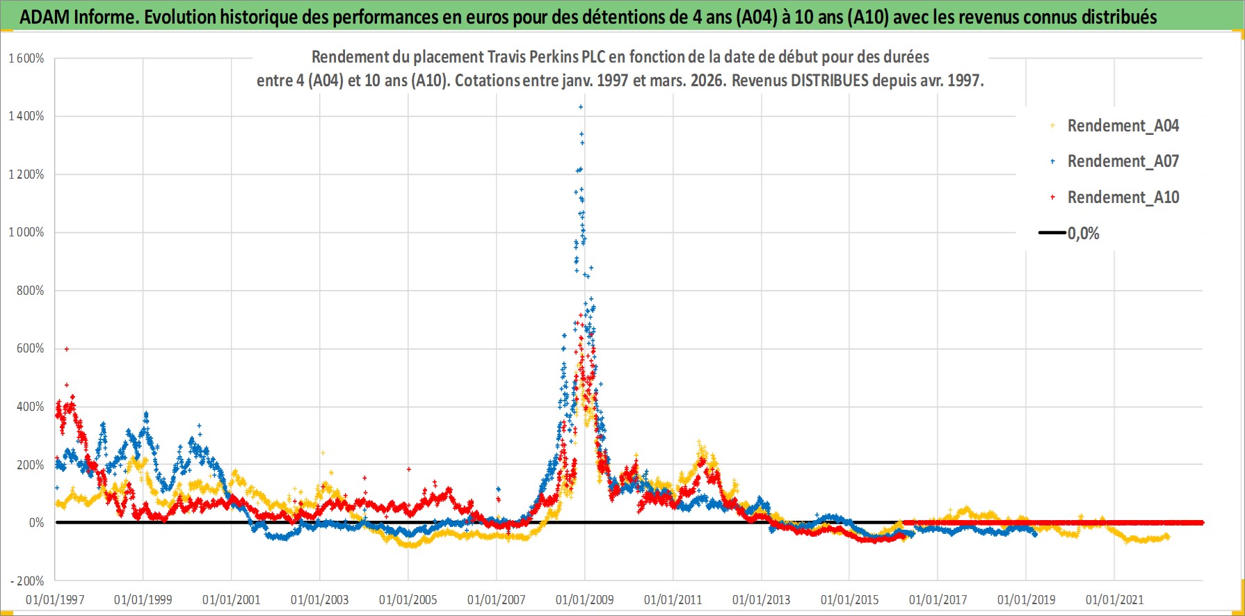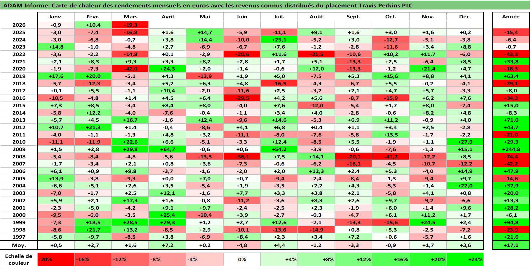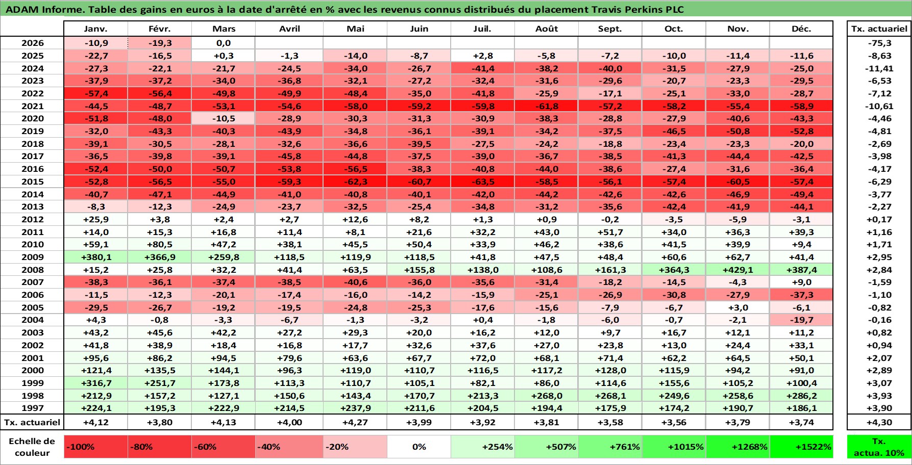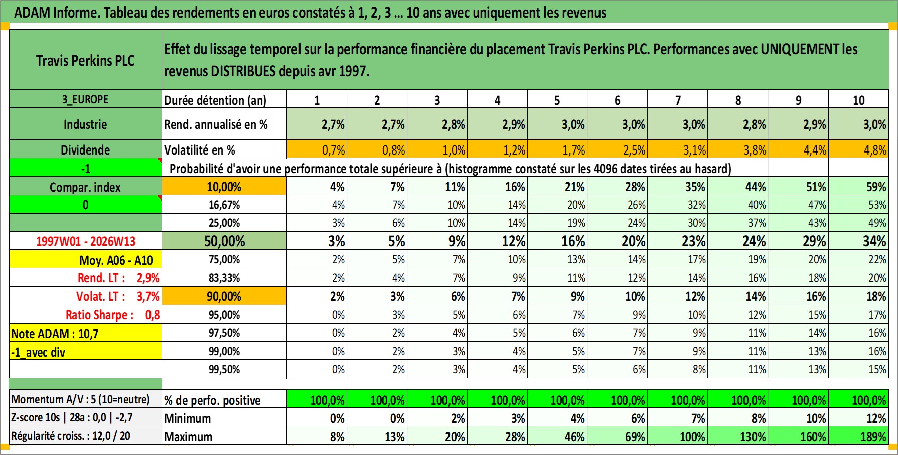 Site dédié aux investisseursPage dédiée sur site financeAnalyse des valorisations hebdomadaires de l'action Travis Perkins PLC. Cet actif est cote en GBX. Les valorisations sont en contrevaleur EURO et couvrent les semaines 1997W01 a 2026W13. Les revenus de cet actif financier sont pris en compte depuis la semaine 1997W15. La note ESG de cet actif n'est pas connue.