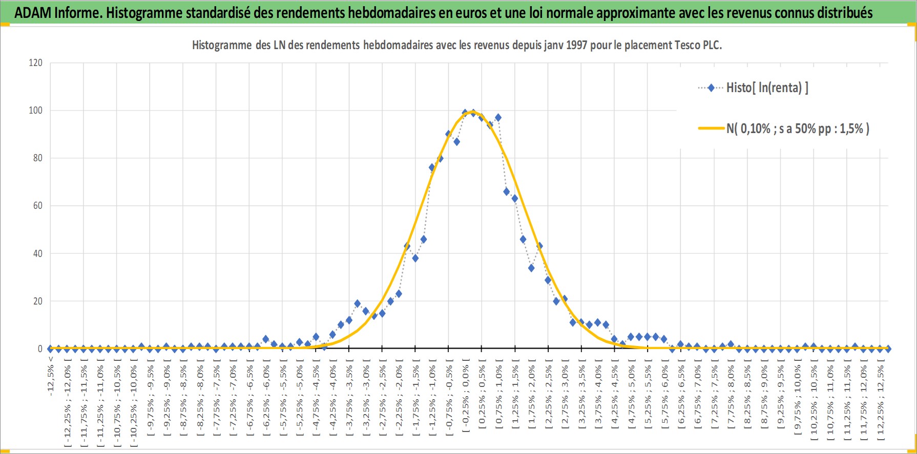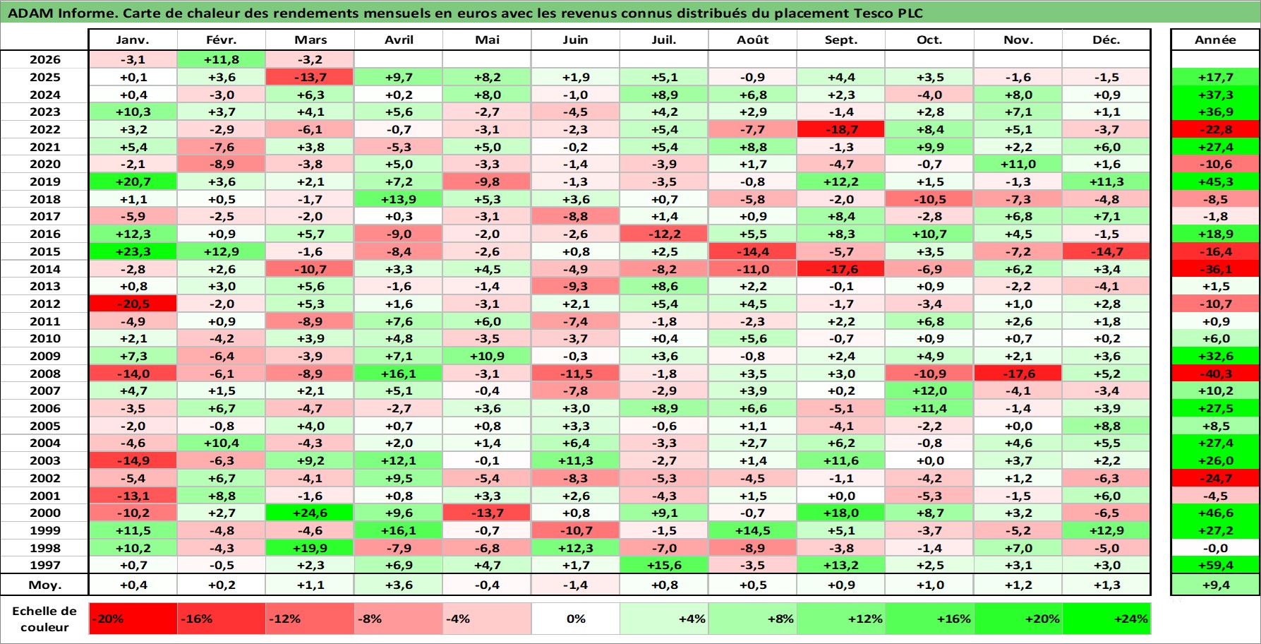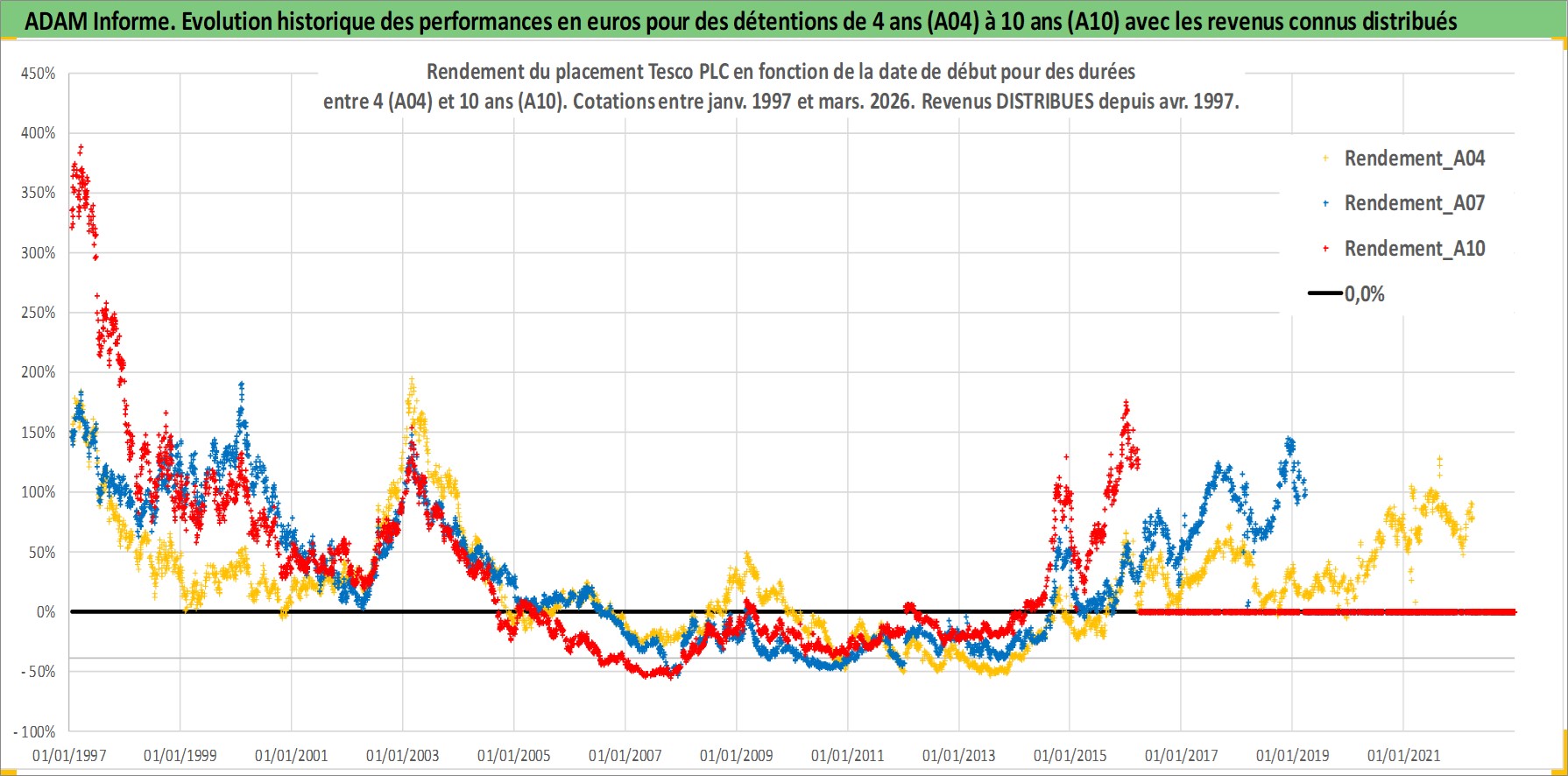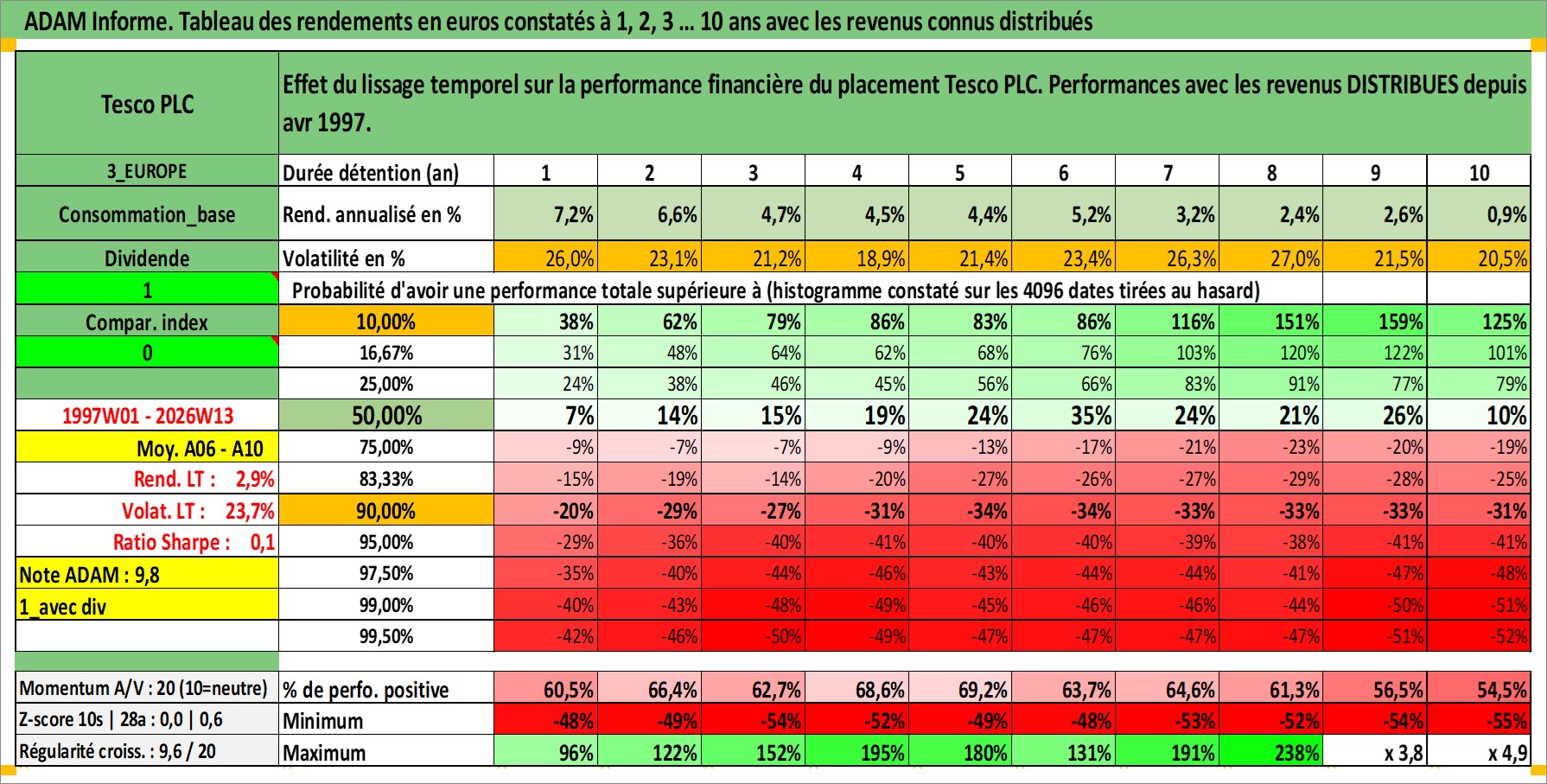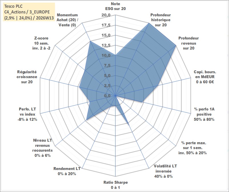 Site dédié aux investisseursPage dédiée sur site financeAnalyse des valorisations hebdomadaires de l'action Tesco PLC. Cet actif est cote en GBX. Les valorisations sont en contrevaleur EURO et couvrent les semaines 1997W01 a 2026W13. Les revenus de cet actif financier sont pris en compte depuis la semaine 1997W16. La note globale ESG de cet actif est estimee a 10.0 (apres rebasage entre 0 et 20).