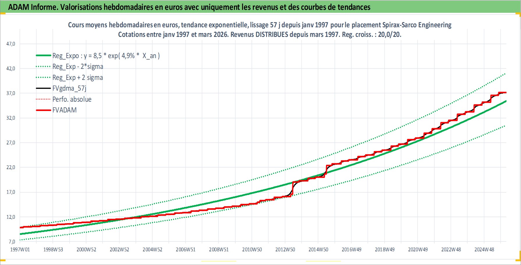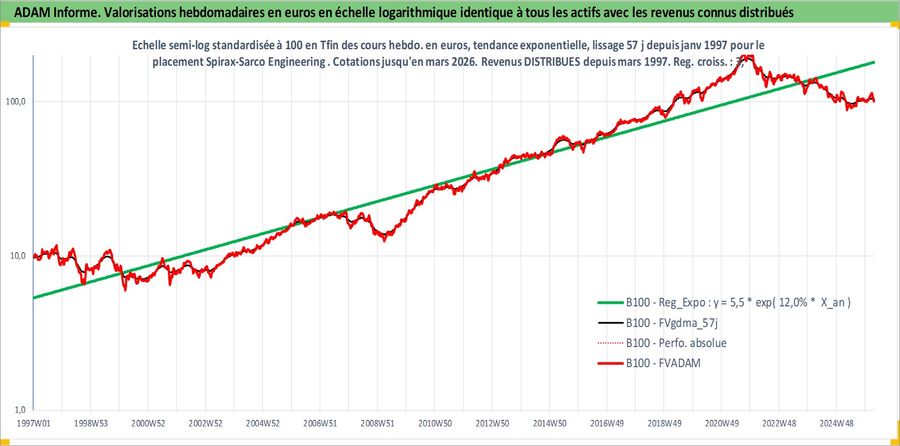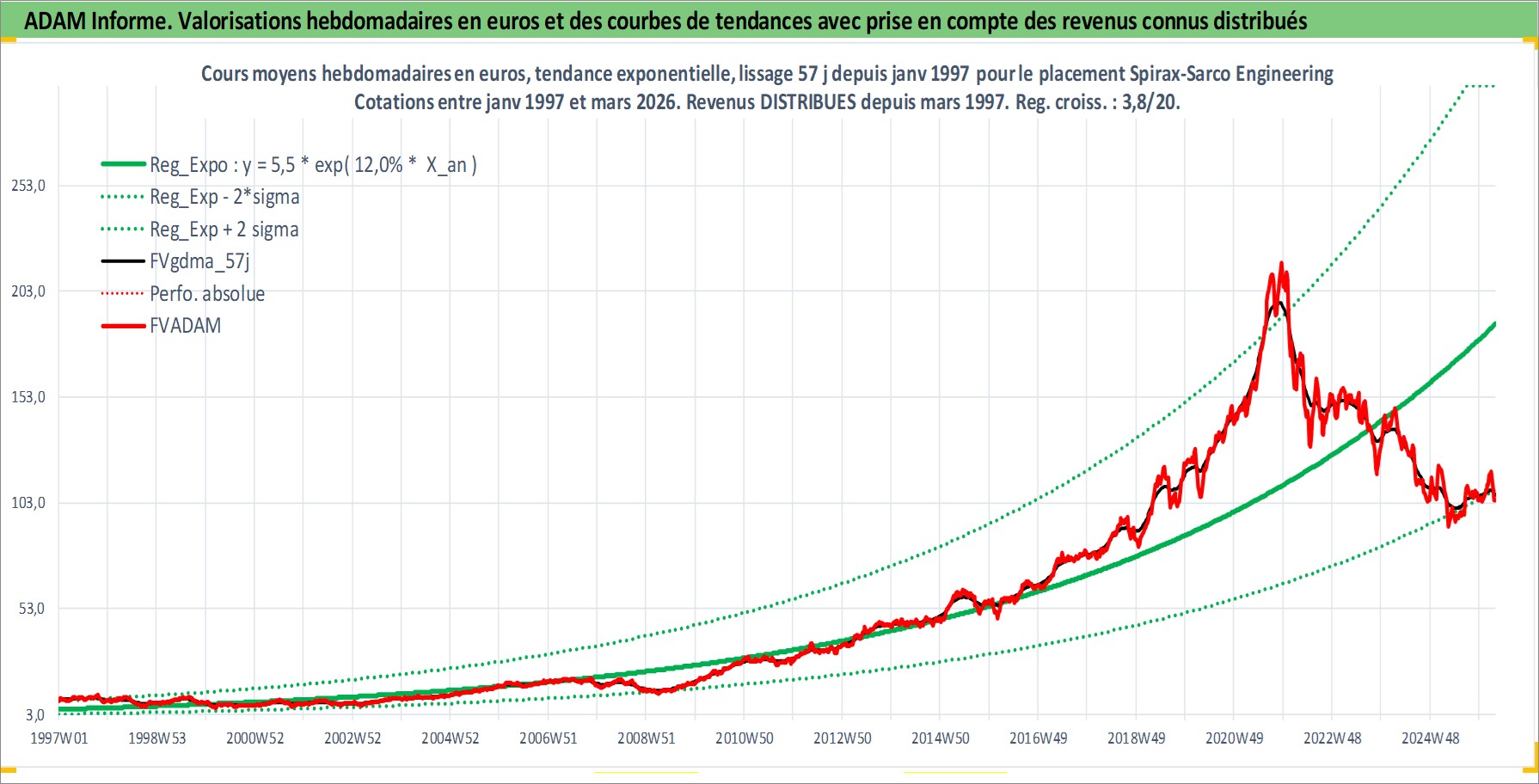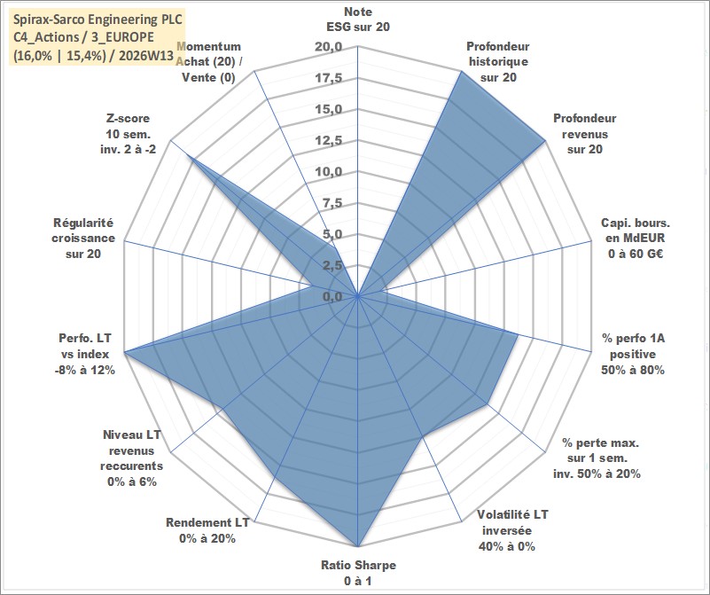 Site dédié aux investisseursPage dédiée sur site financeAnalyse des valorisations hebdomadaires de l'action Spirax-Sarco Engineering PLC. Cet actif est cote en GBX. Les valorisations sont en contrevaleur EURO et couvrent les semaines 1997W01 a 2026W13. Les revenus de cet actif financier sont pris en compte depuis la semaine 1997W12. La note ESG de cet actif n'est pas connue.